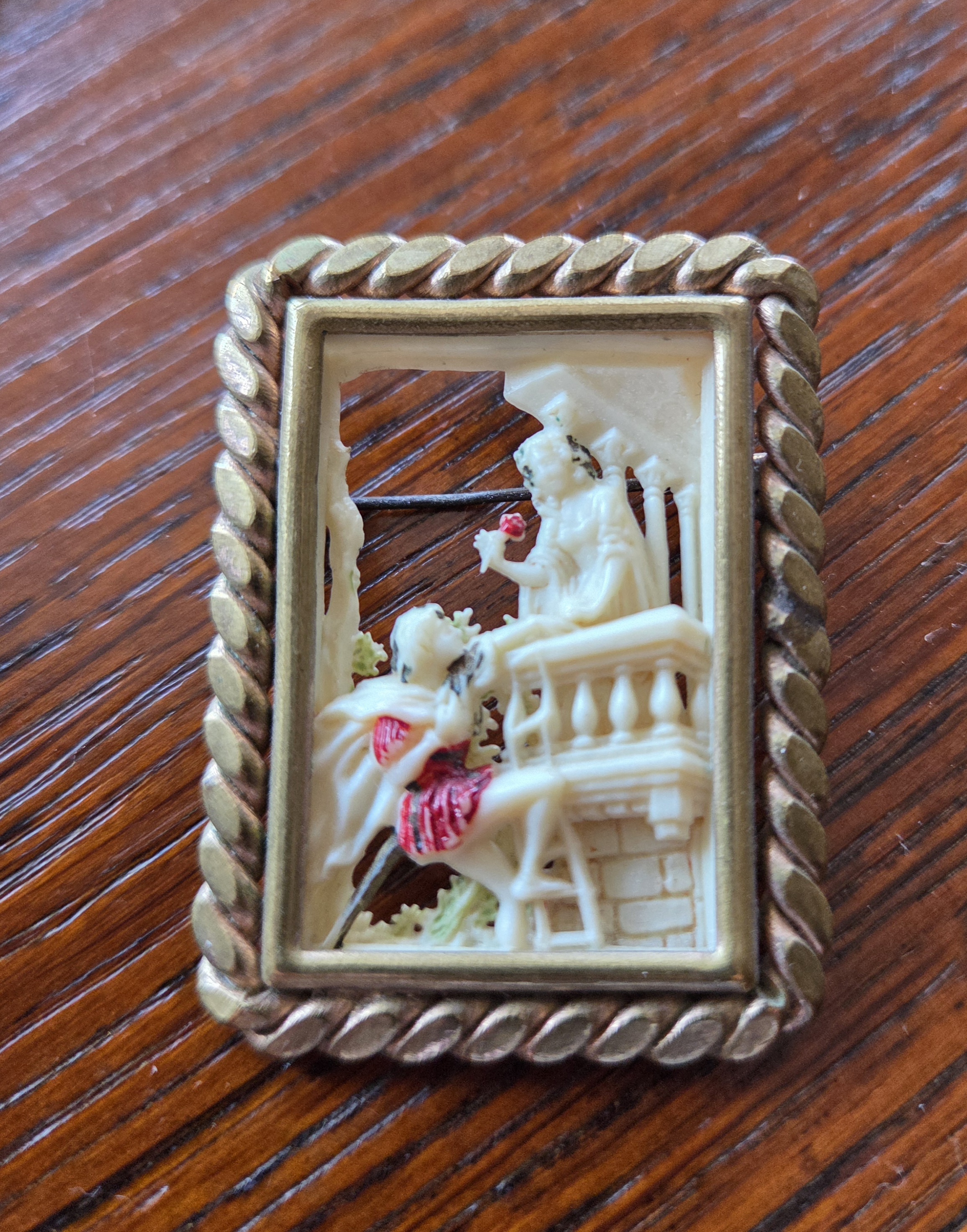 Hittat två lite ovanliga siluettbroscher, celluloid och troligen från 20-talet. Den högra ska nog föreställa Romeo och Julia tror jag.