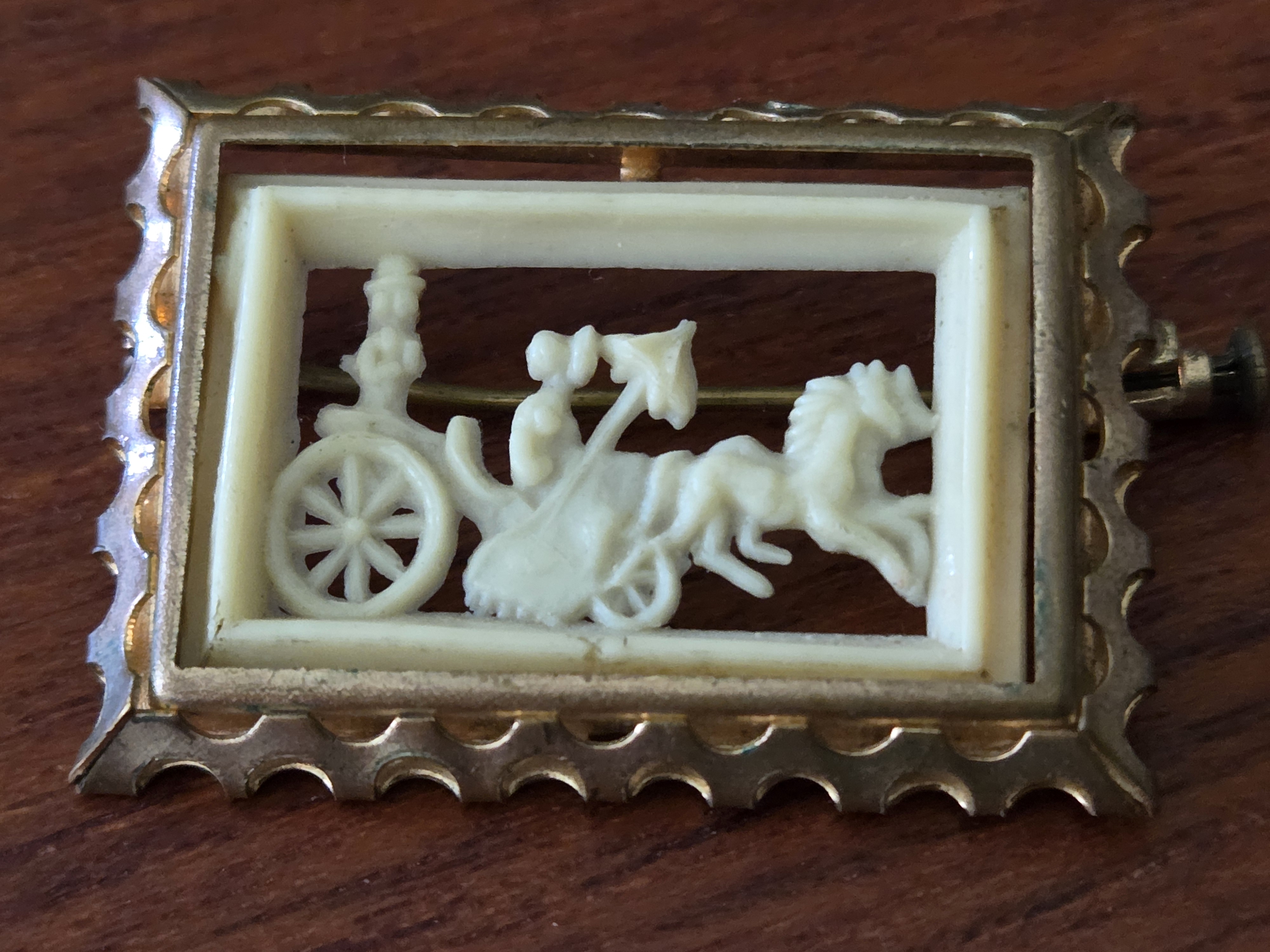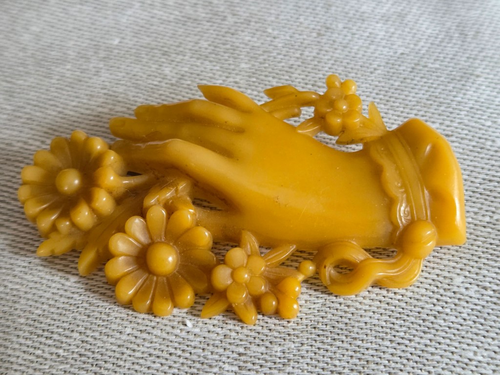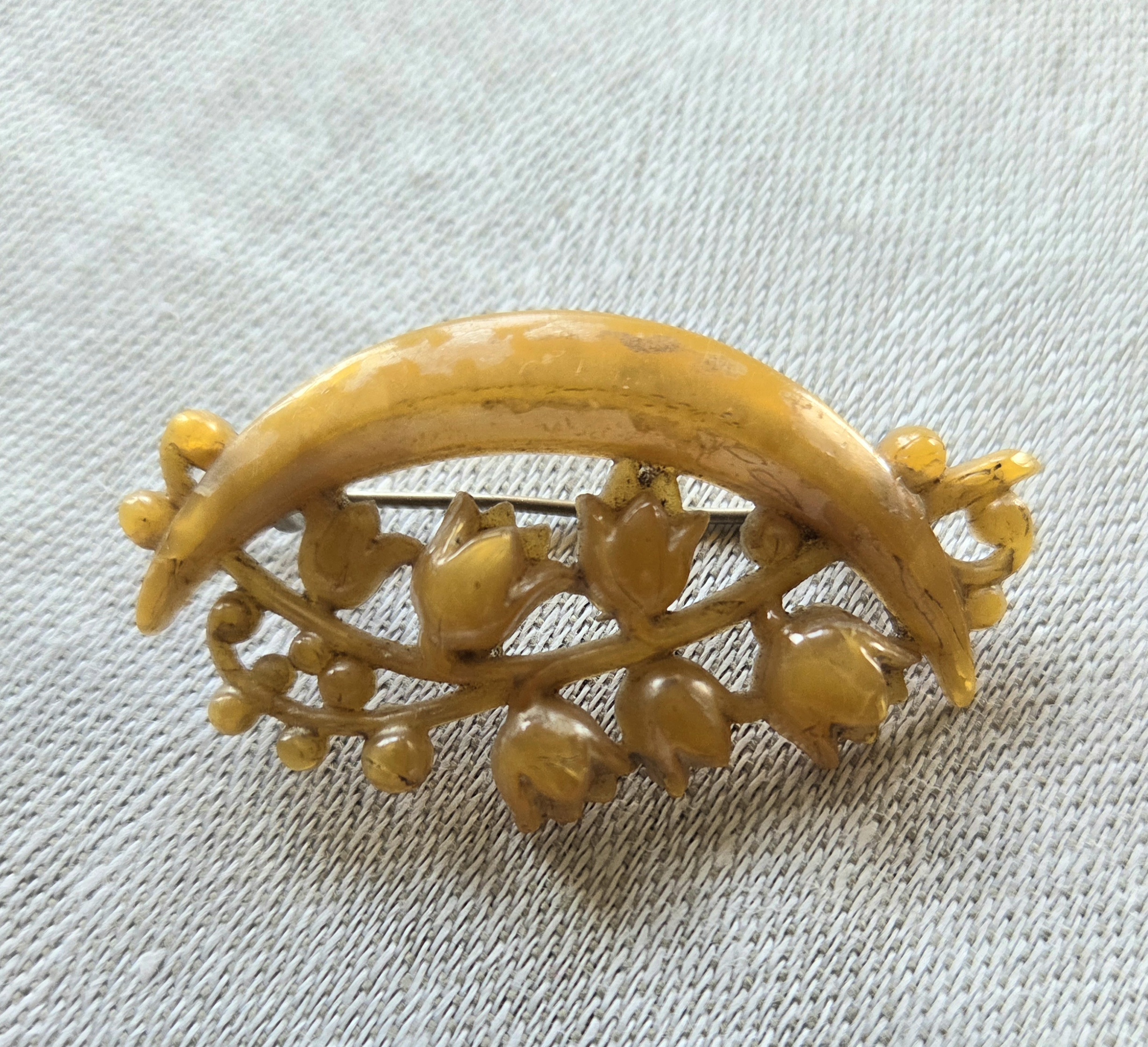 Två broscher i tidig celluloid, de här är redan från sekelskiftet ellrr tidigt 1900-tal när celluloiden fortfarande var ”ung”.