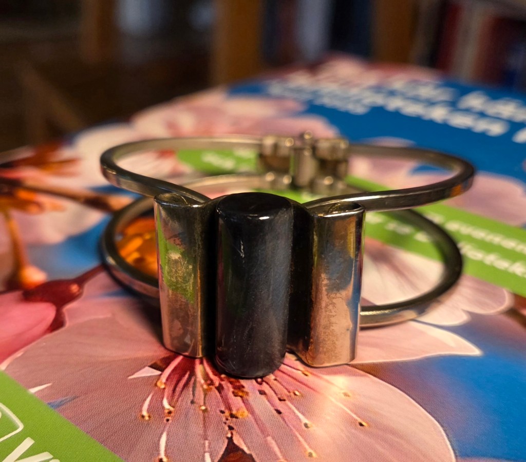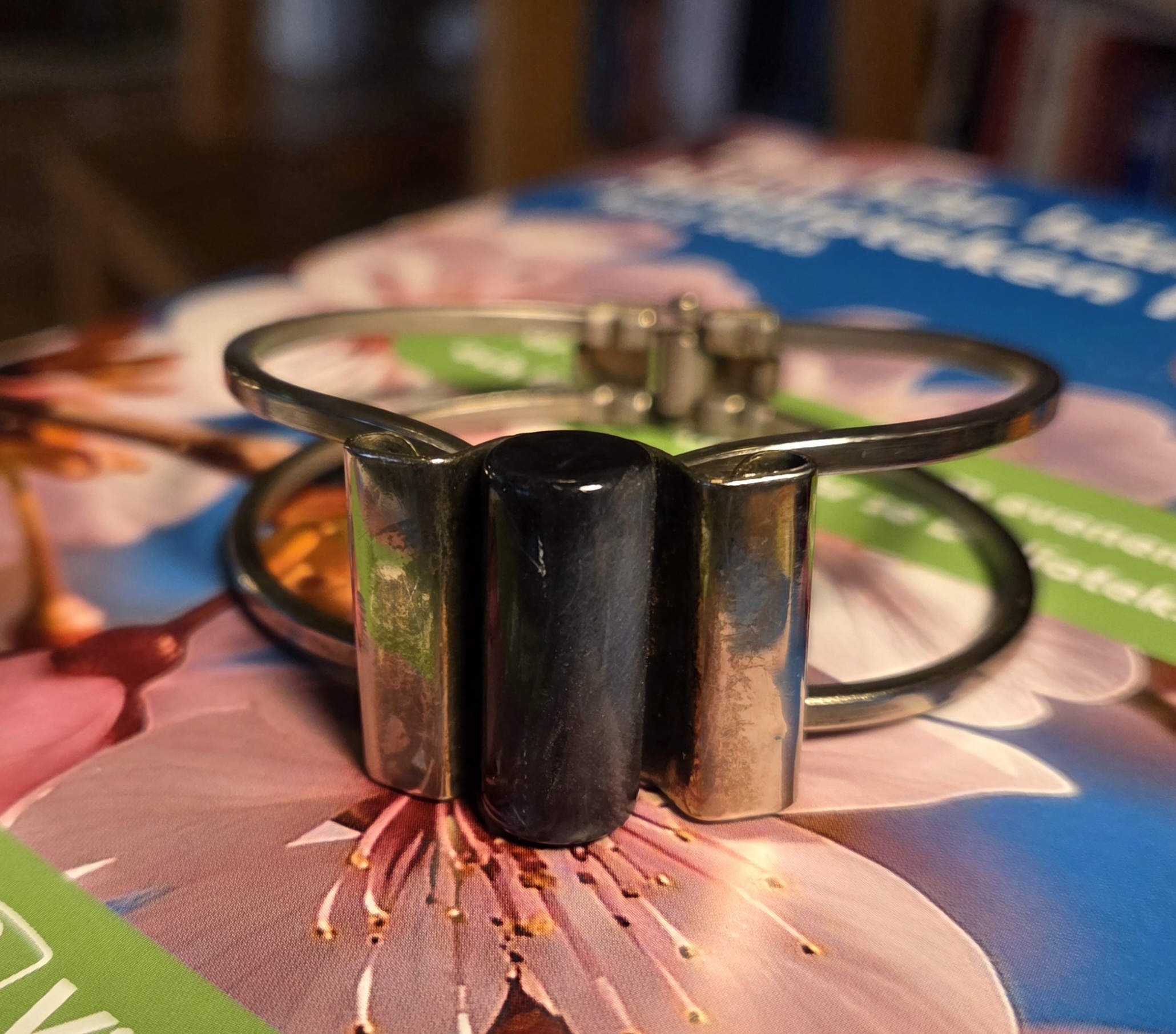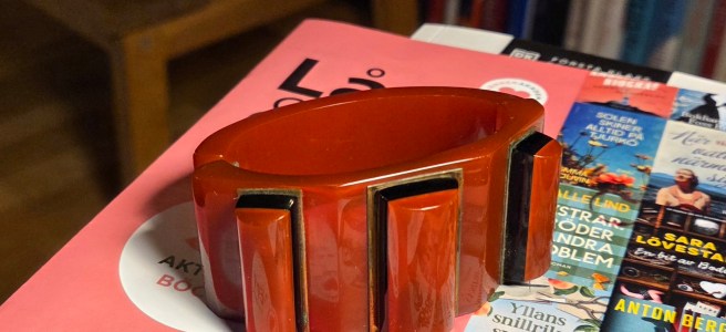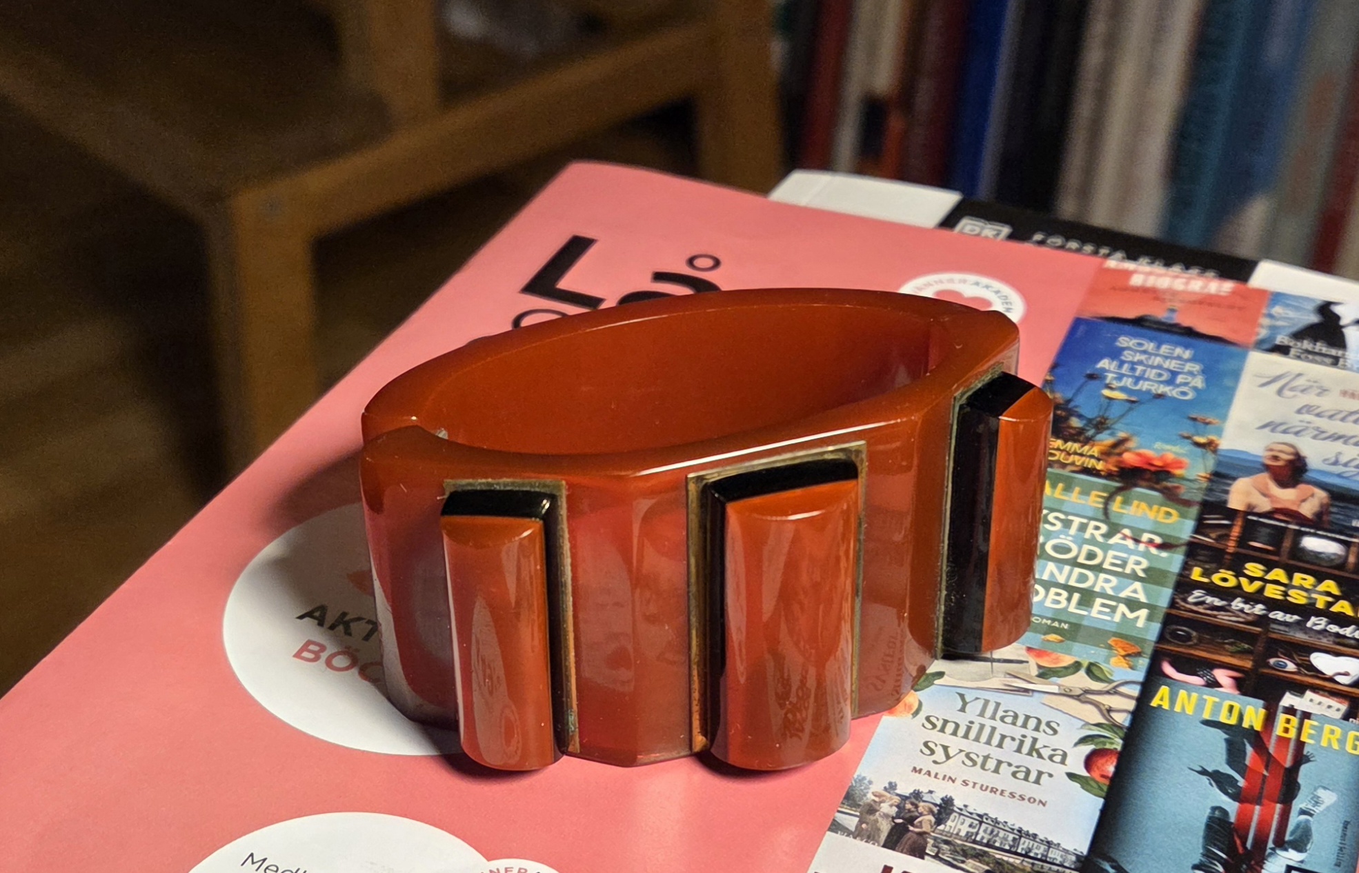 Tre armband från ungefär samma tid, art deco 20/30-tal. Den vänstra och den i mitten är båda i bakelit. Den högra i galalith. Den högra påstås vara Jakob Bengel men jag är tveksam. Åldern och materialet är rätt men detta är den andra jag hittat, känns lite för många eftersom det är extremt svårt att hitta Bengel-smycken. Men jag ska sätta mig och gå igenom böckerna om Bengel ordentligt innan jag beslutar mig för om den är rätt eller inte.