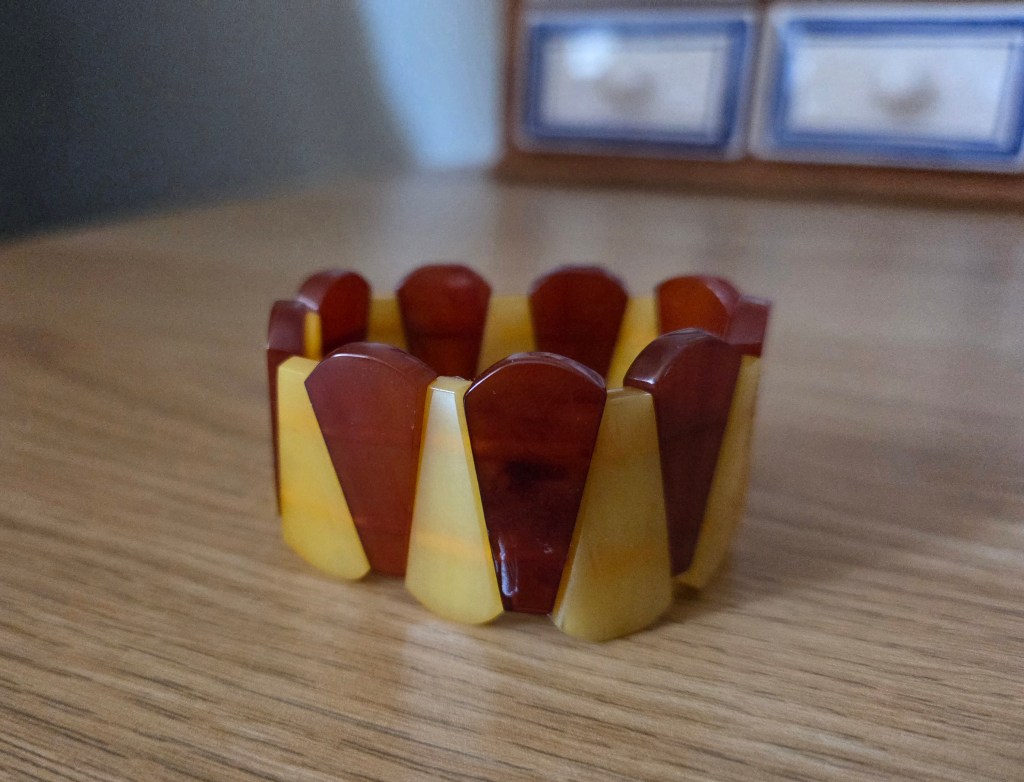Smycken är tillverkade i mässing och galalith, en bakelit-liknande plast gjord på mjölk (!). Detta armband ingår i min samling. Har även två broscher med ”rätt” märkning.