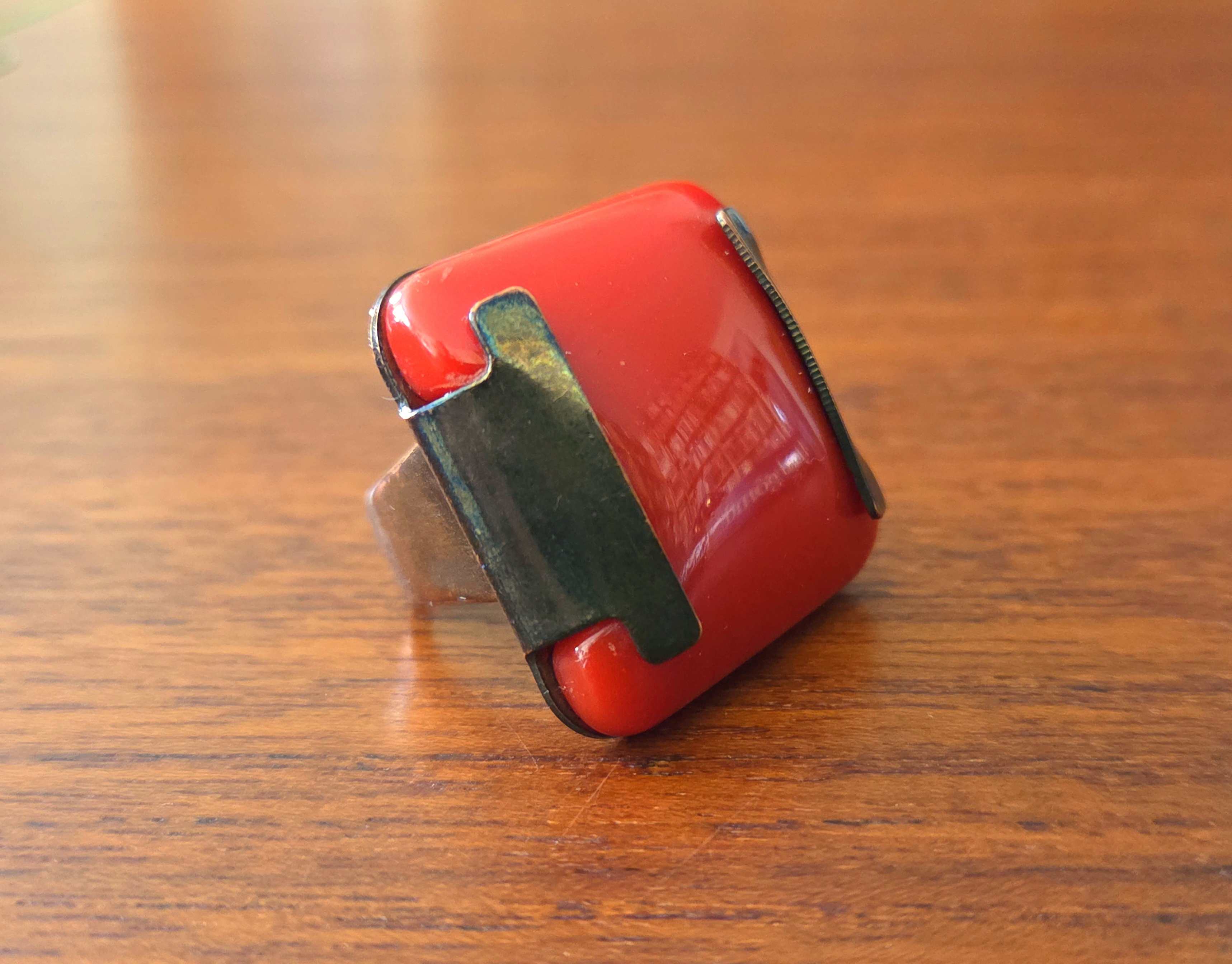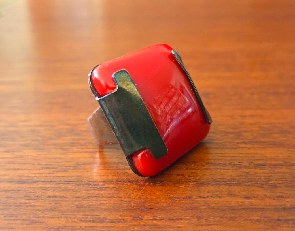 Den här ringen vet jag tyvärr mycket lite om, har letat och letat men inte hittat någon som helst information. Min gissning är att den är från 20/30-talet, mycket beroende på utseendet. Är dessutom väldigt osäker på material men har ändå landat i att jag tror det är celluloid. Troligen en ring för en herre pga av storleken.