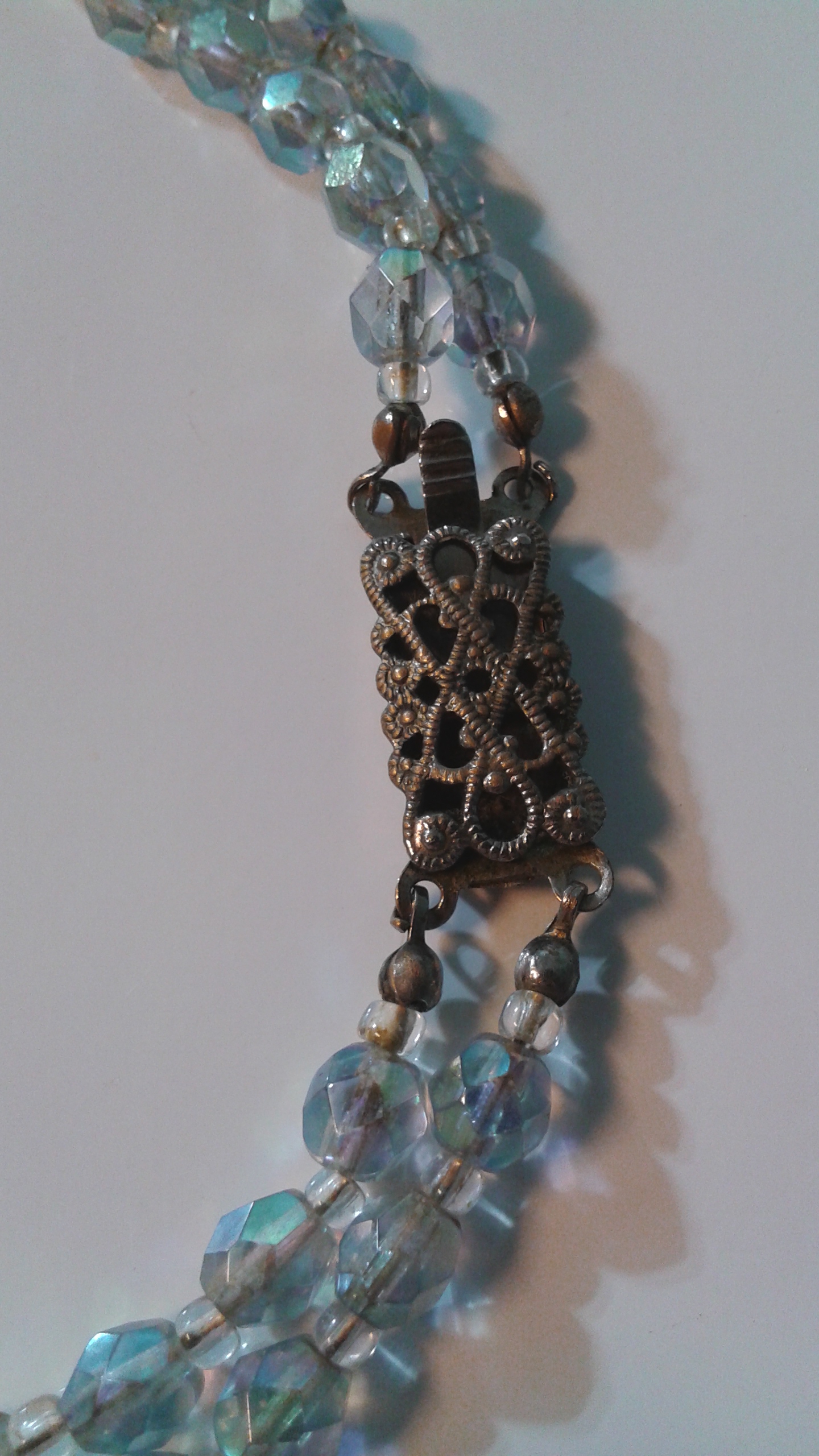 Har ett fint äldre halsband av glaspärlor (tror jag i alla fall, skulle kunna vara bergkristall eller något liknande också) med ett vackert lås som jag var sugen att ”gifta ihop” med något mer. Halsbandet är gammalt, tittar jag på låset så gissar jag 40/50-tal, men rätt bedagat och lite omodernt idag. Pärlorna ser lite blå ut på bilderna men de är genomskinliga.