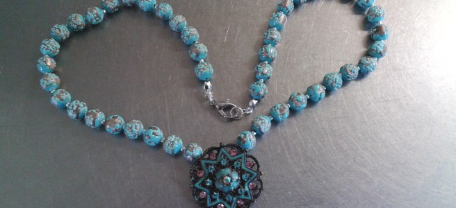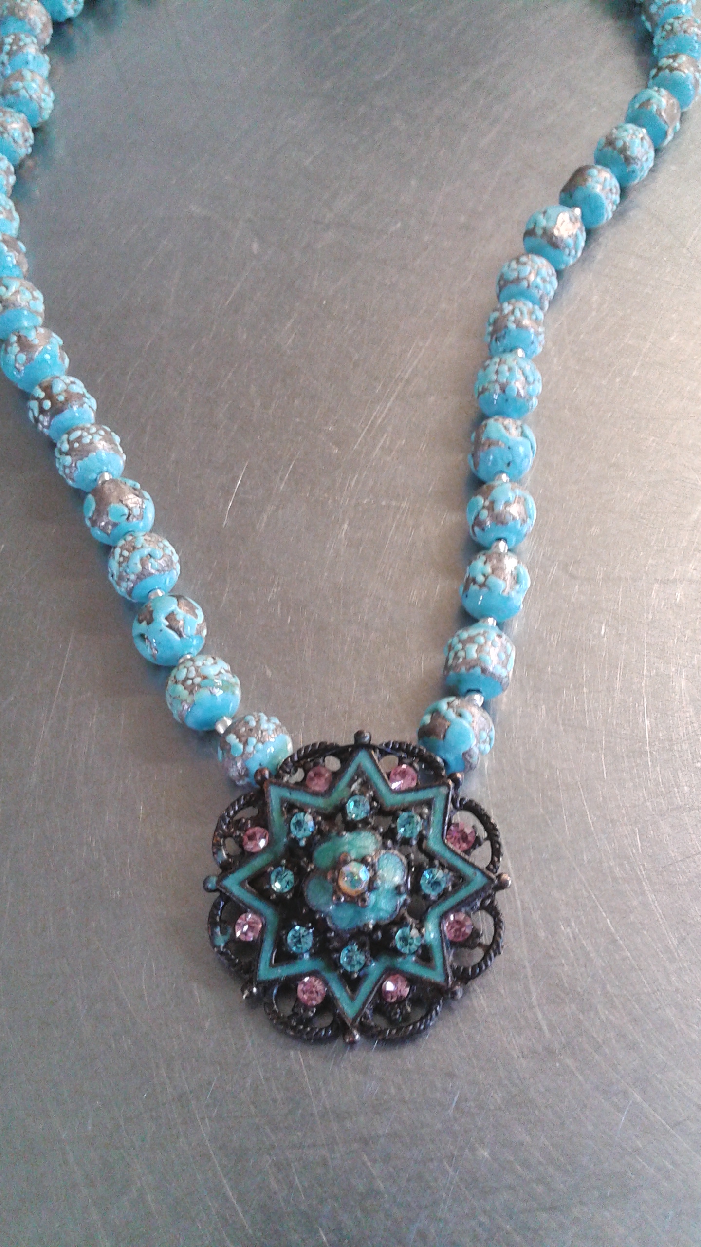 När jag ändå hade farten uppe blev det ett halsband till…, blått den här gången. Hittade en så otroligt vacker gammal brosch i blått och rosa som jag länge har varit sugen på att göra något med. Samtidigt hade jag ett söndrigt halsband liggande som jag trodde skulle kunna fungera bra tillsammans med broschen – och det gjorde det.