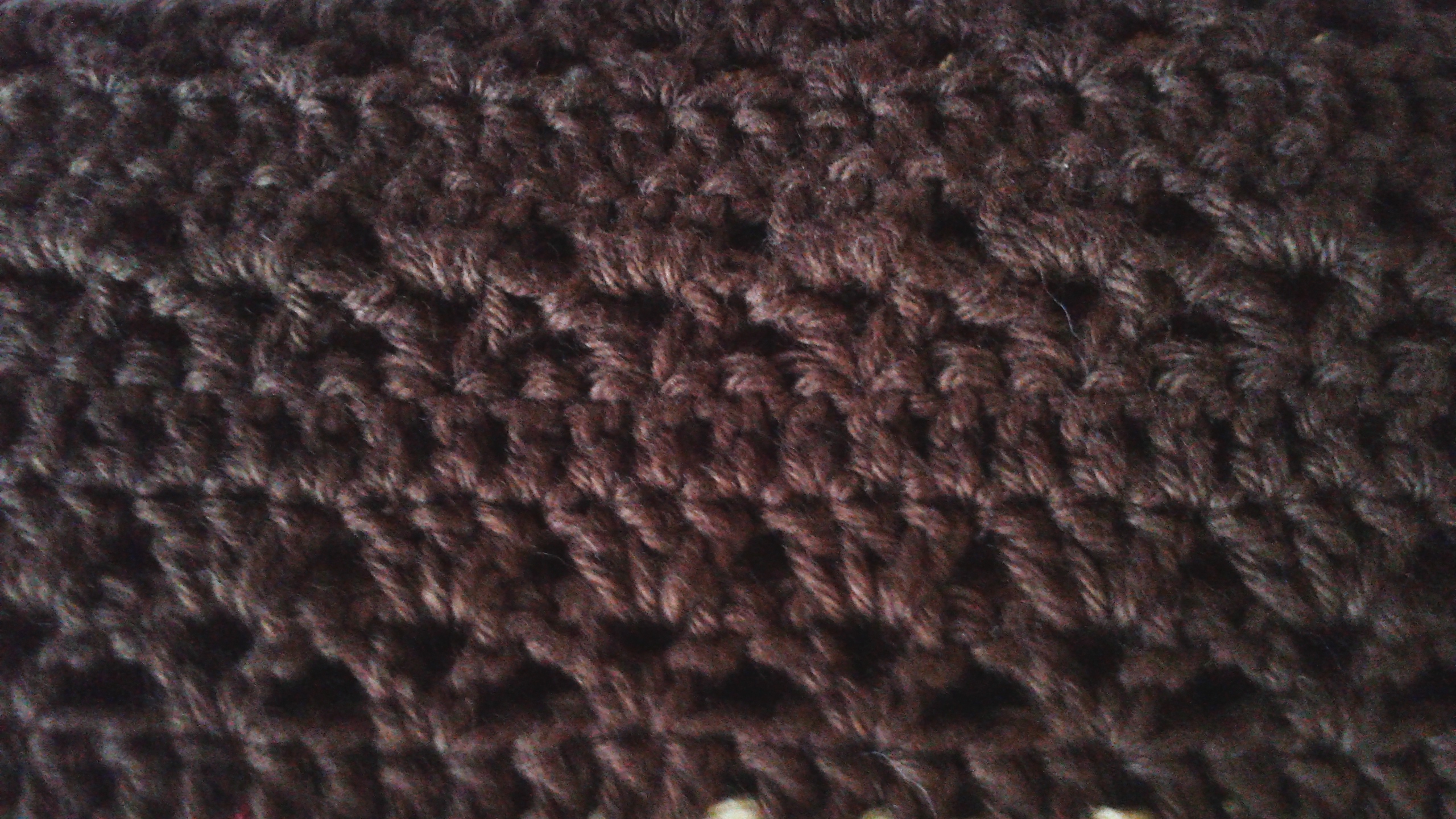 Sedan gjorde jag kanten likadan fast enbart i brunt. Kanterna virkade jag på i efterhand. Jag gjorde tre omgångar, dvs nio varv (beror ju också på hur långa/breda man vill ha dem) och avslutade med ett varv fastmaskor. Man kan ju använda flera olika färger, som jag gjort, eller bara en färg för ”jorden” (den bruna), en färg för bladen (den gröna) och en färg för blomman.