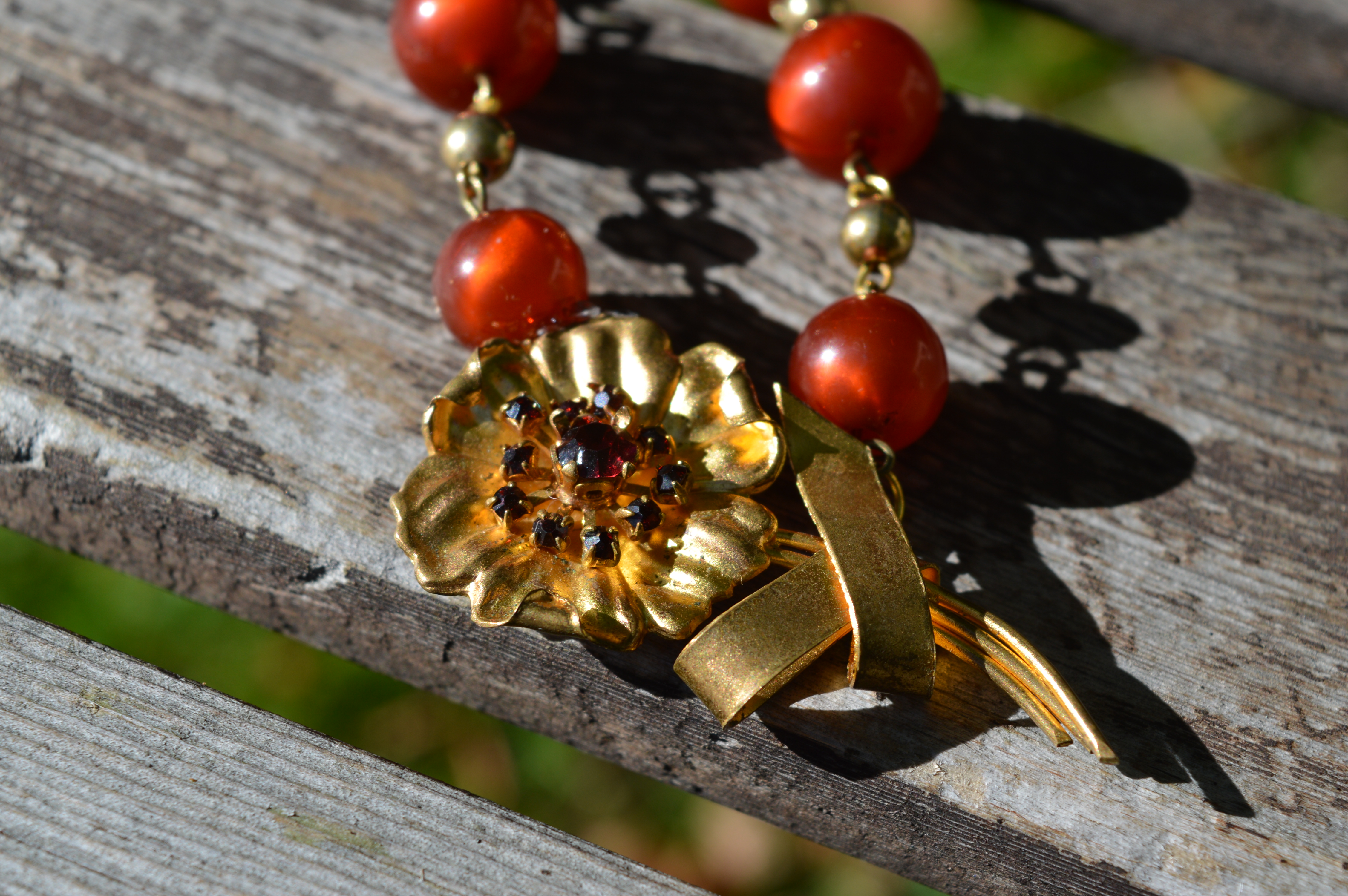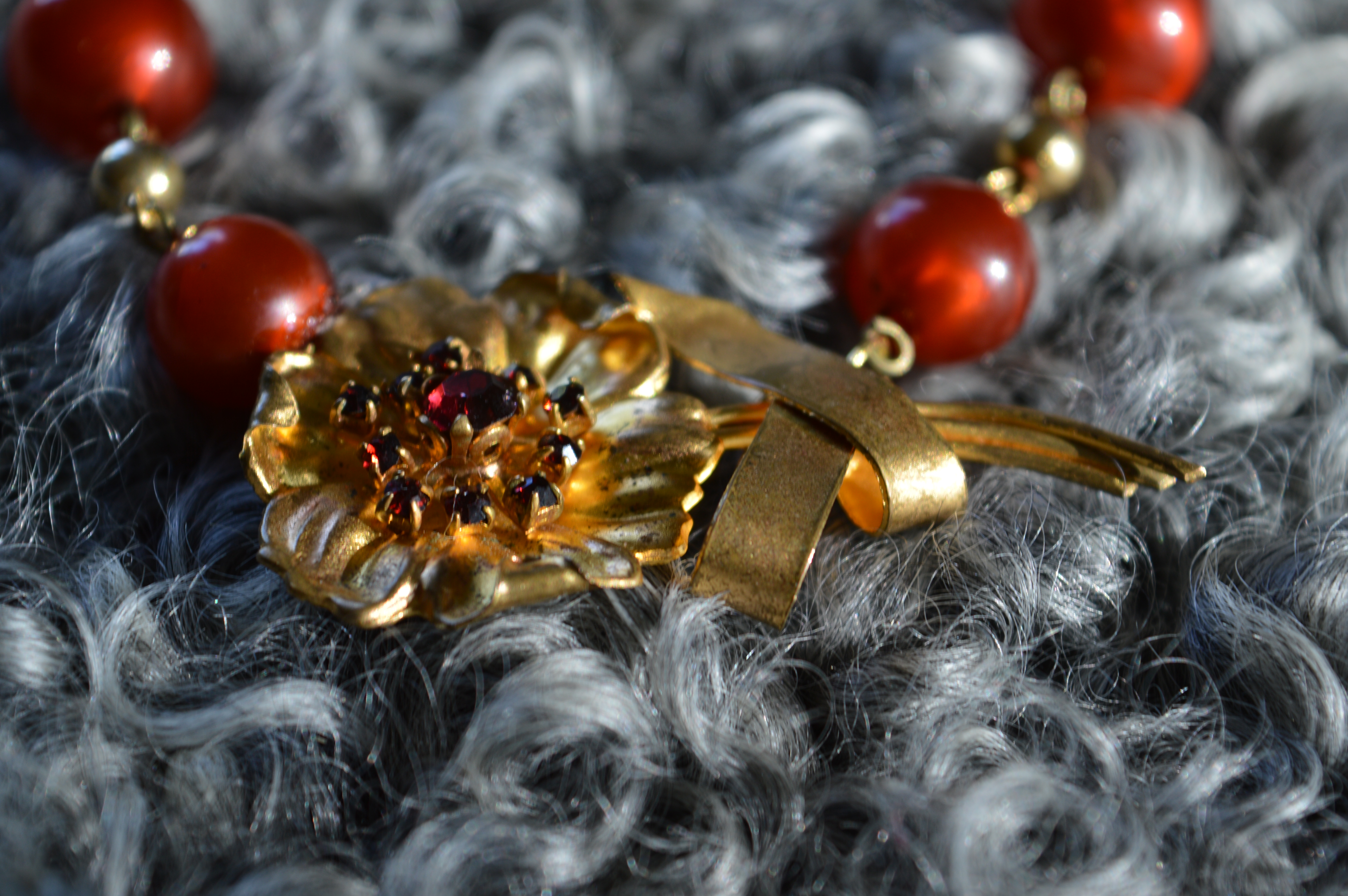 Hon passar inte i så stort eller ”blingit” så något mer neutralt än vad jag vanligtvis gör kanske? Har massor med fina broscher jag skulle kunna göra något av. Hon gillar rött så jag börjar med att dyka ner i broschförrådet och ser vad jag hittar. Har många fina vintagebroscher som skulle kunna bli fina som ”centerpiece” i ett halsband.