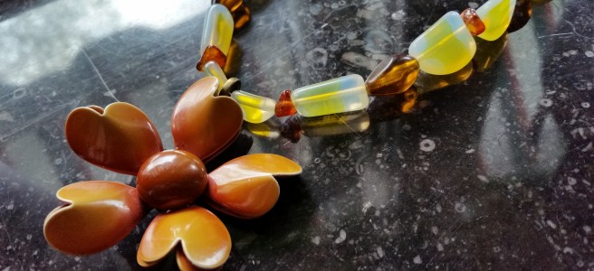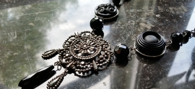 Nu har – äntligen – det andra halsbandet, som jag ska ge bort, blivit klart. Jag gjorde det av en kedja, några lösa metallpärlor och en liten brosch med söndrigt lås.