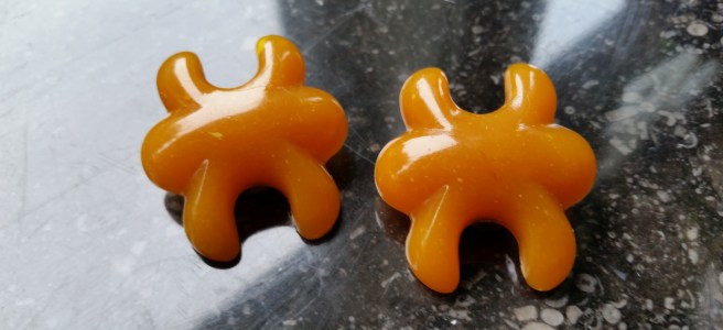 Idag har jag plockat fram ett par riktigt gamla (tror jag) örhängen som jag, i alla fall nästan, vet är i äldre celluloid. Tyvärr är det ena lite missfärgat men jag tänker att om jag hittar ålder och material så kanske jag kan hitta någon idé hur jag kan göra det bättre. Kan vara solblekt och då är det nog bortom räddning…