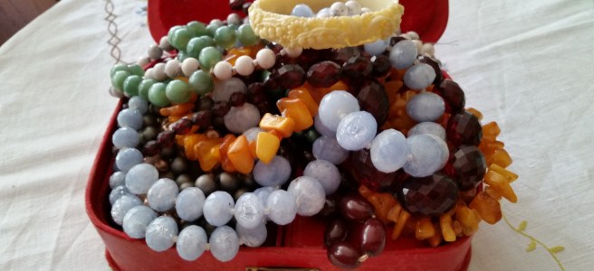 Just ett sådant armband har jag letat efter, de är i celluloid och troligen från 30-talet – och i mitt tycke väldigt vackra. Att det sedan fanns åtminstone två halsband som jag tror skulle kunna vara bakelit och lite annat smått och gott så var det värt pengarna många gånger om.