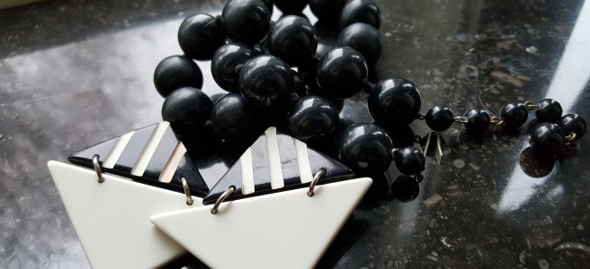 Halsbandet har jag aldrig sett förut, aldrig ens något liknande, så det kommer att kräva lite grävande för att klura ut vad det är. Örhängena är riktigt gamla, skulle kunna vara bakelit.