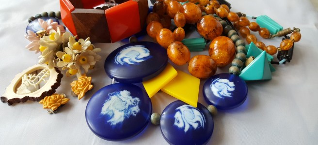Armbandet är lite extra roligt, kombination av trä och lucite från 60-talet, det gulbruna halsbandet kräver lite mer studerande, skulle kunna vara från egentligen när som helst från 30-talet och fram till 60-talet, det blåsvarta halsbandet är med största sannolikhet från 60-talet och till slut en brosch i celluloid,som ska efterlikna benarbete, från 50-talet.