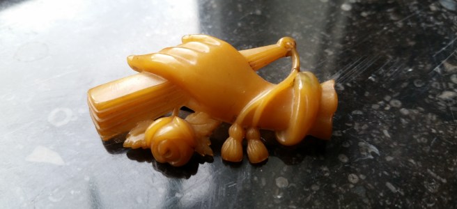 Detta fina ”dressclip” som du sätter i ringningen är i celluloid och från 20/30-tal. Det finns en utsmetad stämpel och jag tror att detta är gjort i Japan. Många i den här stilen är gjorda där och såldes till Europa, främst under mellankrigstiden, dvs 20/30-tal. De ska vara skurna och inte gjutna, med vetskap om Japans kultur på det här området stämmer säkert det – fina är de oavsett!