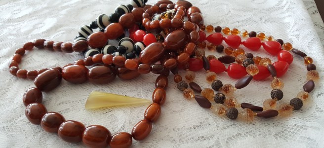 Ett riktigt långt i kolabrunt som är svårt att datera, kan vara allt från 20-tal fram till 60-talet, kräver lite mer studerande, och ett treradigt halsband som är blandat glas- och plastpärlor, 50-tal.