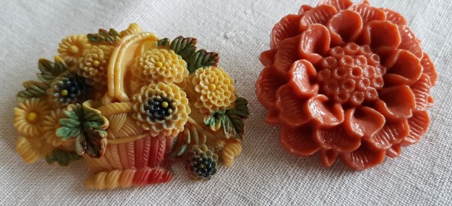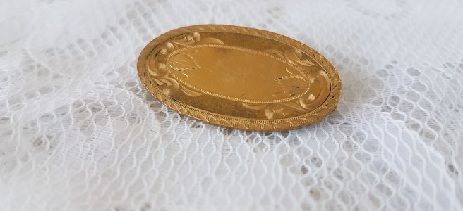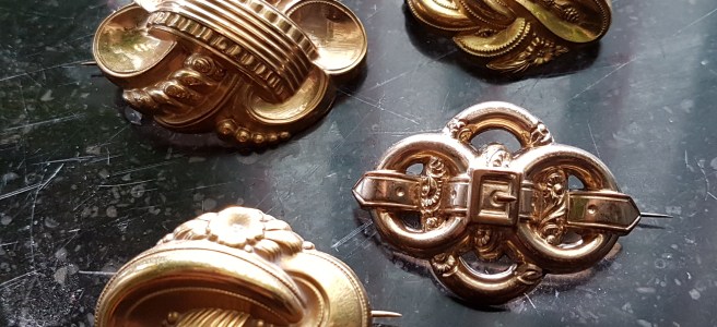 De ser ju maffiga och tunga ut men de är i verkligheten väldigt lätta, de är ihåliga… De här broscherna var som populärast från mitten av 1800- talet och en kort bit in på 1900, stilen kallas ibland biedermeier eller senempir. På vissa ställen skriver man att dessa är gjorda i Tombak. Det är också en allmän inställning inom antikhandeln att just dessa är i tombak – och människor med erfarenhet och kunskap ska man ju tro på!