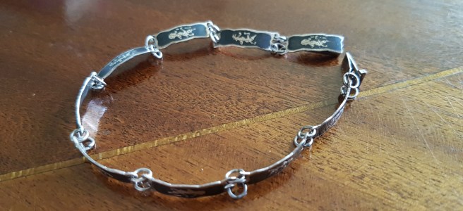 Silverfärgade figurer, typiskt thailändska/asiatiska på svart bakgrund? Jadå, det stämmer. Är det silver? Det vet jag inte, dels eftersom stämplarna är oläsbara och dels för att jag inte vet riktigt hur jag ska testa. Men jag tänker att eftersom armbandet de facto ÄR märkt, även om inte jag kan läsa det, och allt annat känns rätt så tänker jag att det nog är silver. Det är i alla fall inte magnetisk, det brukar vara ett gott tecken…
