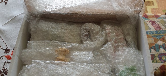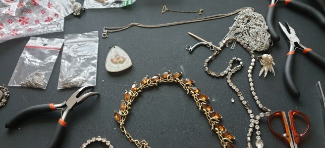 Det jag gör är att försöka ”restaurera” en brosch och ett armband, båda Art Deco och väldigt, väldigt fina (annars hade jag inte gett mig på det här evighetsarbetet – såå roligt är det inte) men som saknar många stenar. Särskilt armbandet, där saknas nog minst hälften av stenarna. Normalt sett får det gå i ”skroten” när det saknas så många men det här tyckte jag var så otroligt fint så jag bestämde mig för att försöka rädda det.
