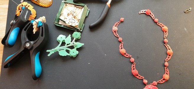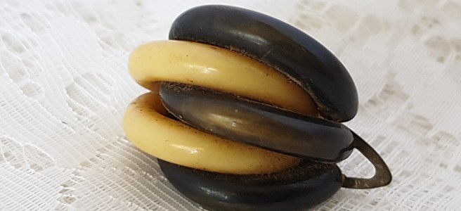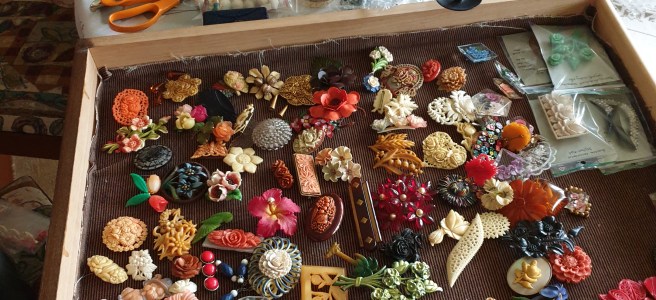 Märkligt nog fanns dessa smycken i stort sett bara under 30-talet, kanske en bit in på 40-talet för att sedan helt försvinna. Varför undrar jag, det är ju ett väldigt vackert och användbart smycke?! Det är inte helt ovanligt att hitta brosch-clips på loppisar, däremot är det väldigt svårt att hitta par, de har nästan alltid förlorat sin kompis. Det finns också smycke där paret kan sättas ihop och bli en vanlig brosch. Ofta har de tappat en del av sina stenar, de är ju trots allt 80-90 år gamla! De fanns i alla möjliga former men vanligast var nog i metall med glittrande stenar, men de fanns även i tex bakelit och celluloid. Det målade brosch-clipset ovan är celluloid.