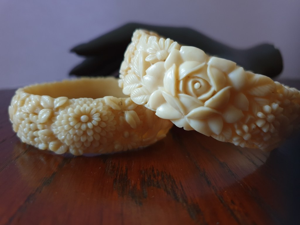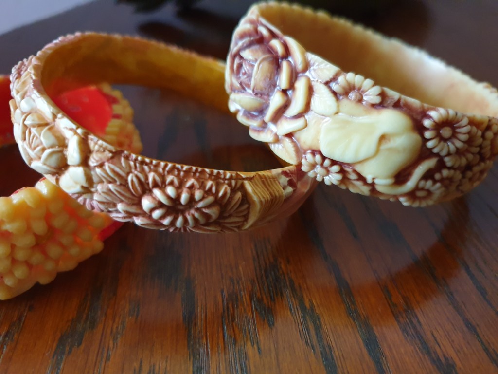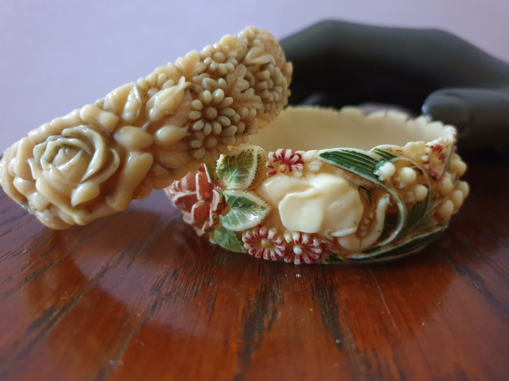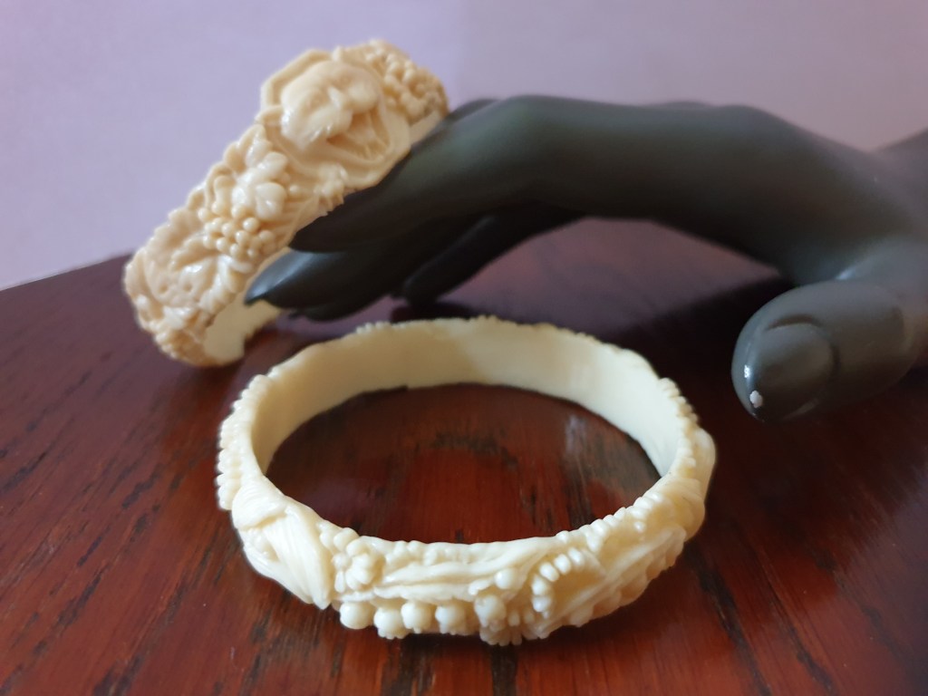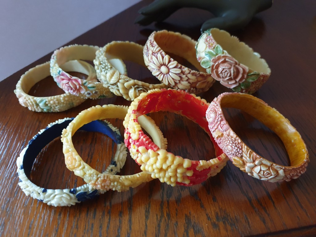 Om jag börjar bakifrån så börjar jag med sekelskiftet/tidigt 1900-tal och fram till ungefär 20-talet. Vid den här tiden är plastsmycken tillverkade nästan enbart i celluloid och skulle fortfarande likna elfenben och andra material som man gjort smycken i tidigare. Det jag inte tagit med här är alla svartbruna varianter, som ebonit, guttaperka och liknande som de flesta sorgesmycken är gjorda av men just här har jag valt bort dem eftersom de flesta av dessa material eg är naturmaterial av olika slag.