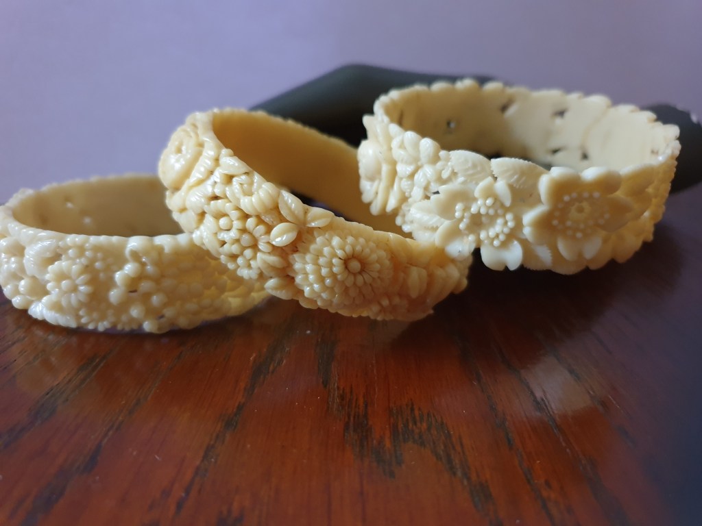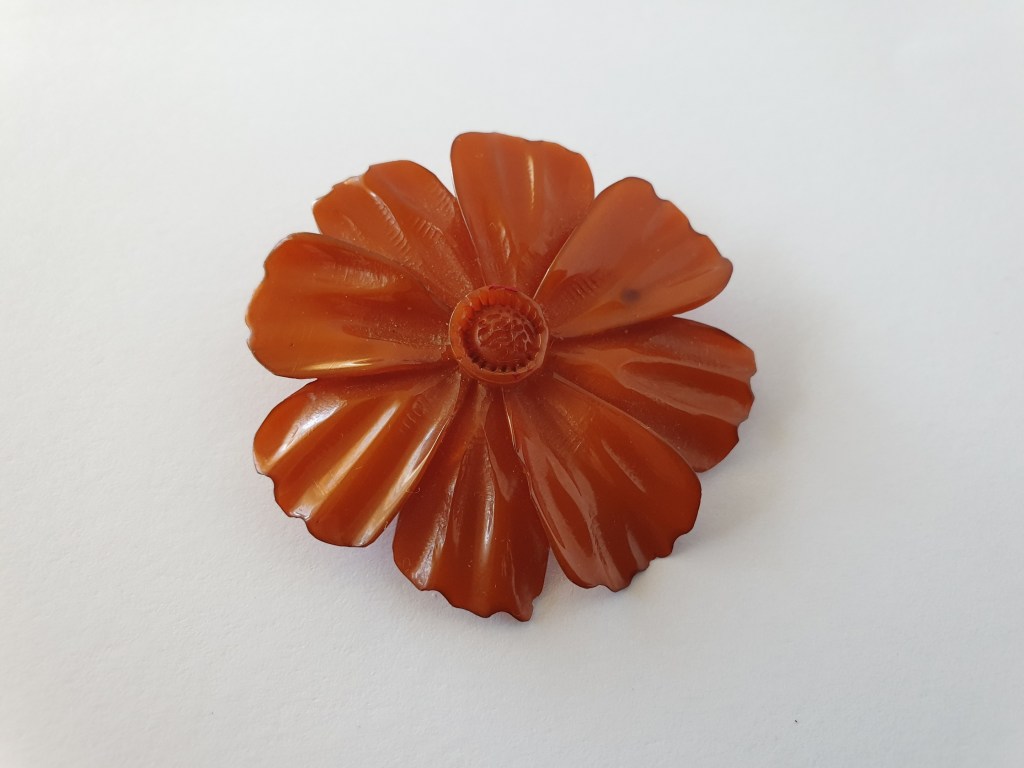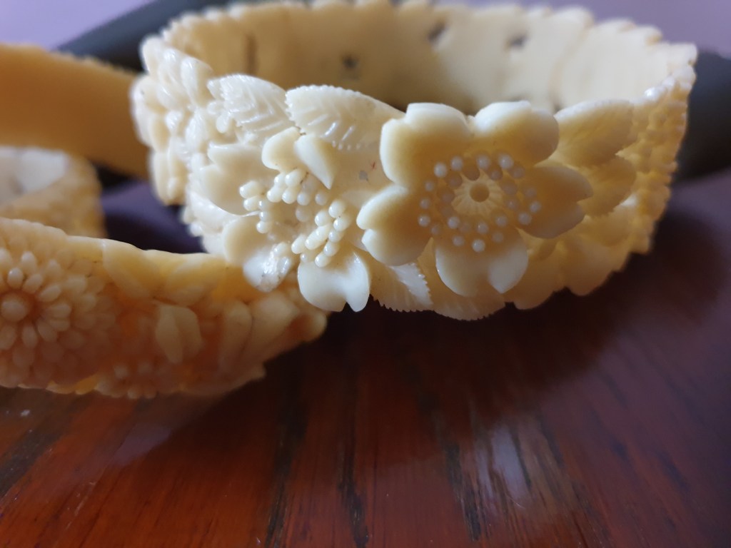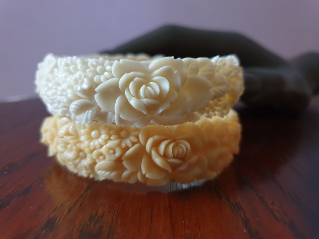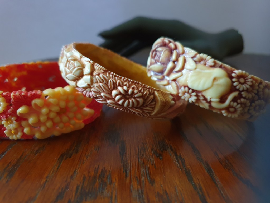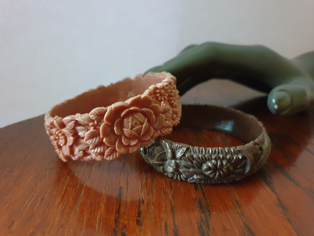 Om jag börjar bakifrån så börjar jag med sekelskiftet/tidigt 1900-tal och fram till ungefär 20-talet. Vid den här tiden är plastsmycken tillverkade nästan enbart i celluloid och skulle fortfarande likna elfenben och andra material som man gjort smycken i tidigare. Det jag inte tagit med här är alla svartbruna varianter, som ebonit, guttaperka och liknande som de flesta sorgesmycken är gjorda av men just här har jag valt bort dem eftersom de flesta av dessa material eg är naturmaterial av olika slag.