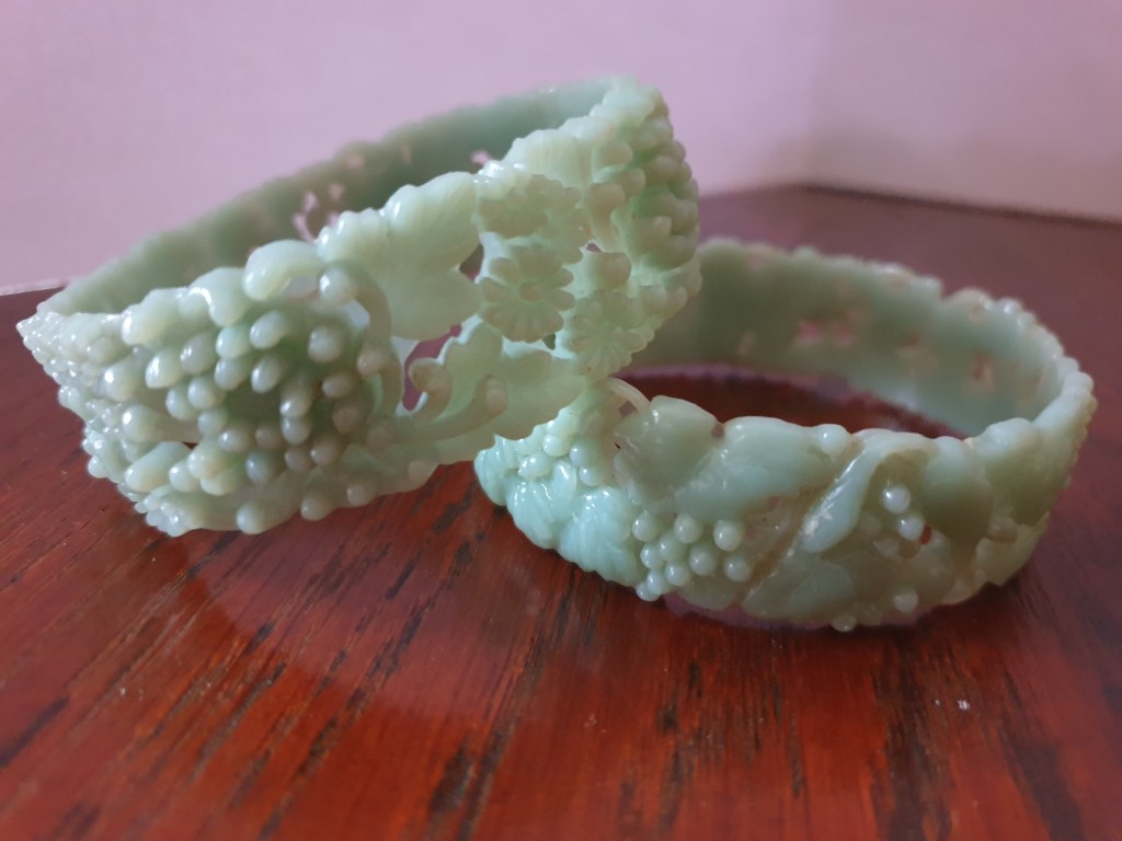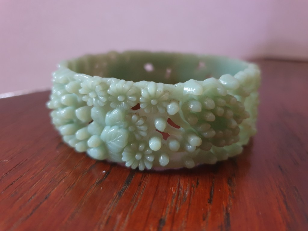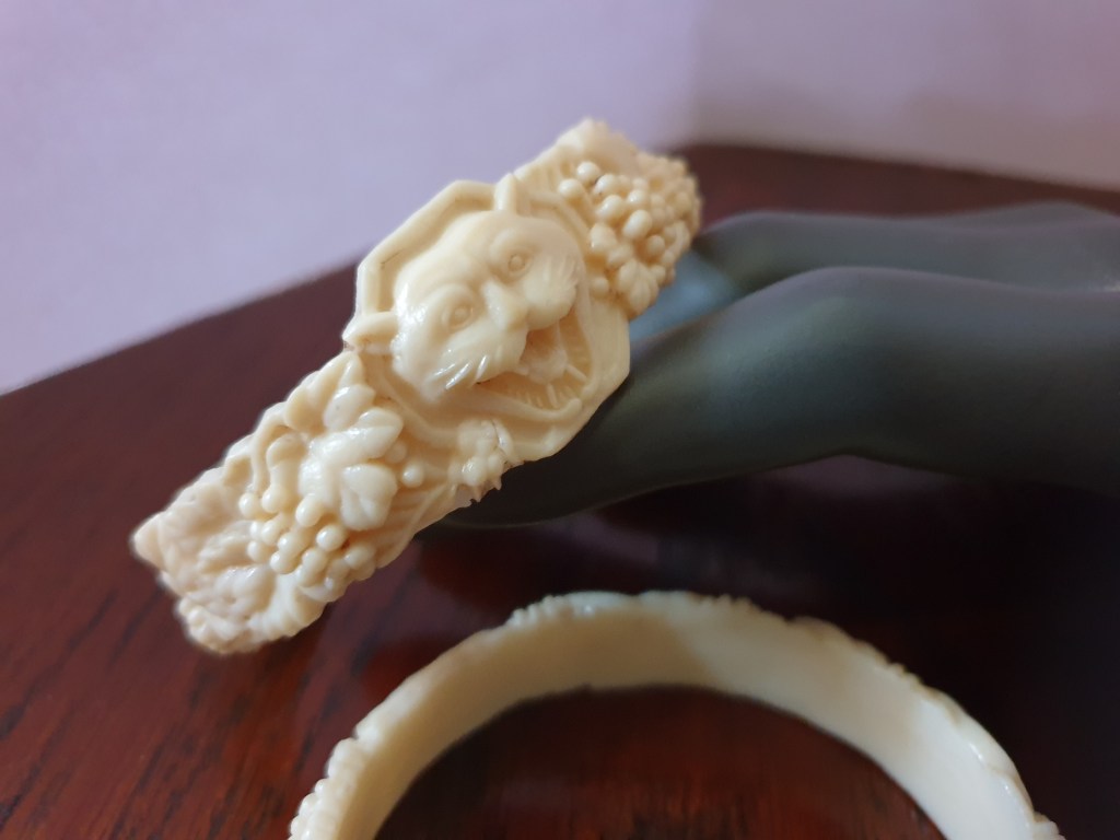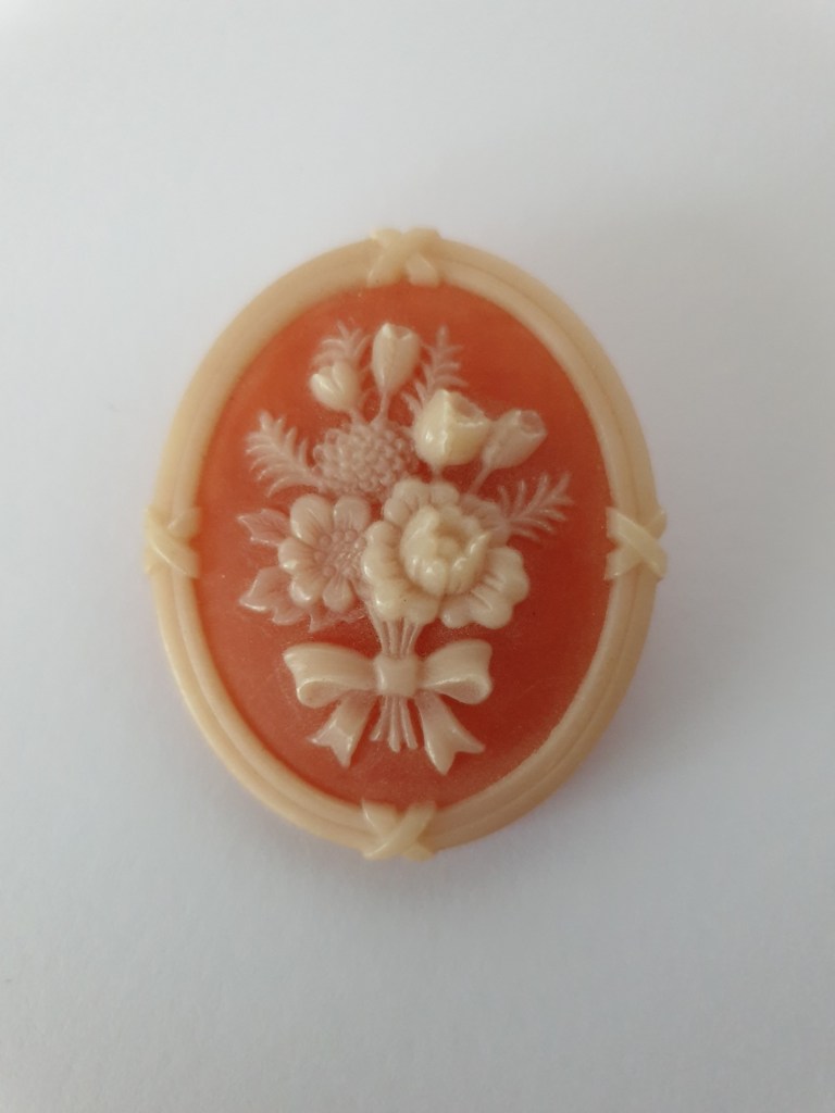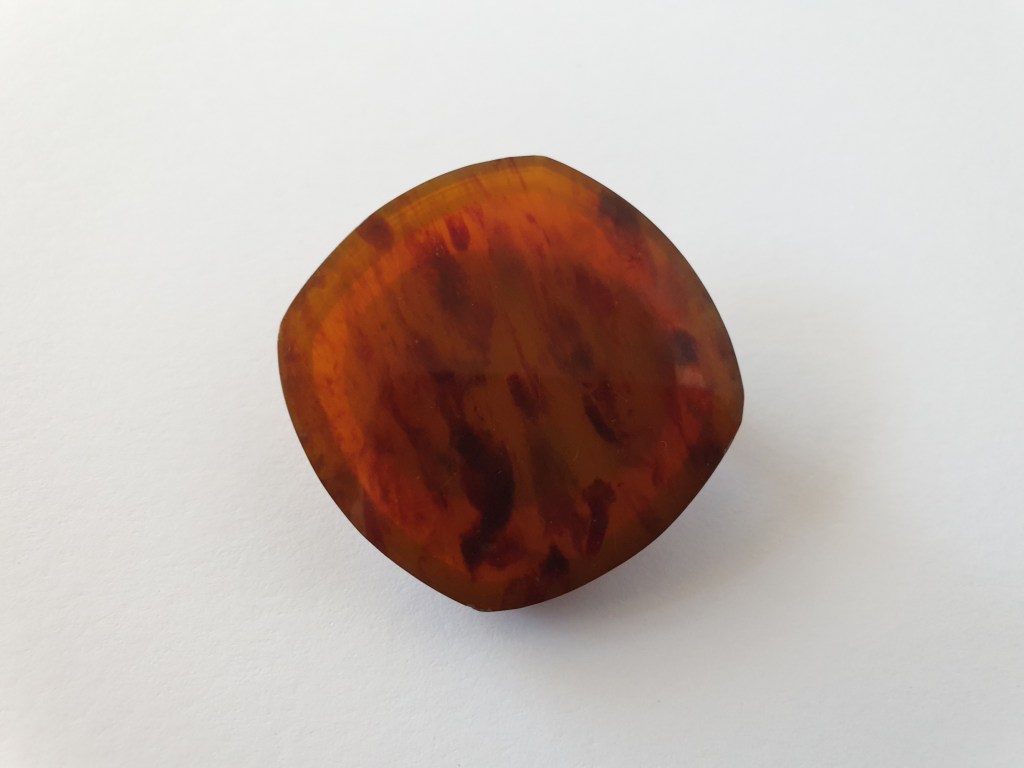 Om jag börjar bakifrån så börjar jag med sekelskiftet/tidigt 1900-tal och fram till ungefär 20-talet. Vid den här tiden är plastsmycken tillverkade nästan enbart i celluloid och skulle fortfarande likna elfenben och andra material som man gjort smycken i tidigare. Det jag inte tagit med här är alla svartbruna varianter, som ebonit, guttaperka och liknande som de flesta sorgesmycken är gjorda av men just här har jag valt bort dem eftersom de flesta av dessa material eg är naturmaterial av olika slag.