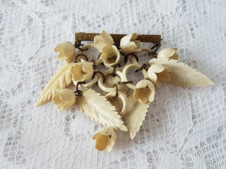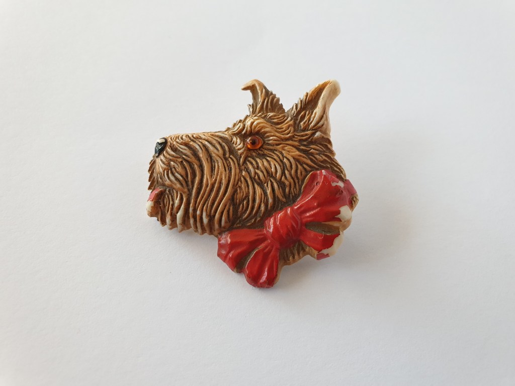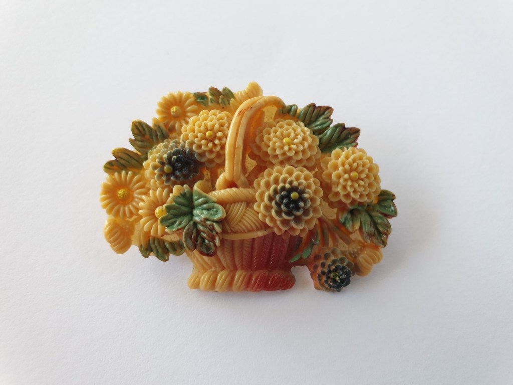 På 40- och 50-talet var också den här sorters broscher vanliga. De säljs ofta som plast men de är gjorda i en slags plastlera, en slags föregångare till cernitlera tänker jag. De är hemmagjorda och troligen var det någon kvällskurs man kunde gå eller något man kunde lära sig via någon veckotidning är min gissning.