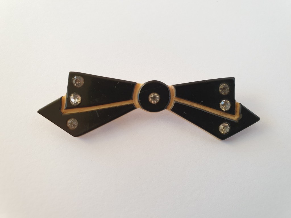 När 30-talet kom och art deco-stilen handlade det fortfarande mycket om celluloid men nu började man även göra smycken i bakelit, egentligen det enda årtionde när bakelit (och liknande material, i Frankrike och Tyskland var galalith vanligt, i Sverige hade vi bla isolit) var hyfsat vanliga i smycken. Det var mycket blommor (som under alla årtionden) men också mycket art deco-stil. Utsmyckning av nitar och stenar av olika slag.