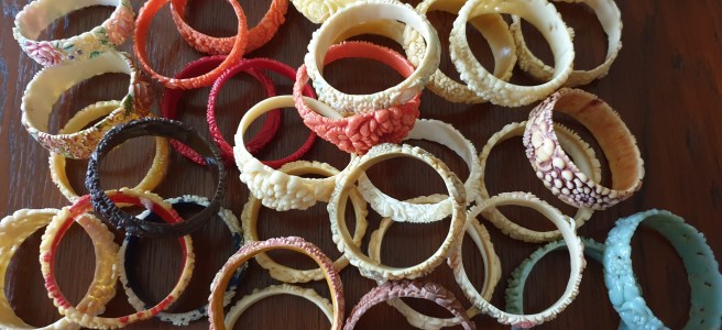 Om jag börjar bakifrån så börjar jag med sekelskiftet/tidigt 1900-tal och fram till ungefär 20-talet. Vid den här tiden är plastsmycken tillverkade nästan enbart i celluloid och skulle fortfarande likna elfenben och andra material som man gjort smycken i tidigare. Det jag inte tagit med här är alla svartbruna varianter, som ebonit, guttaperka och liknande som de flesta sorgesmycken är gjorda av men just här har jag valt bort dem eftersom de flesta av dessa material eg är naturmaterial av olika slag.
