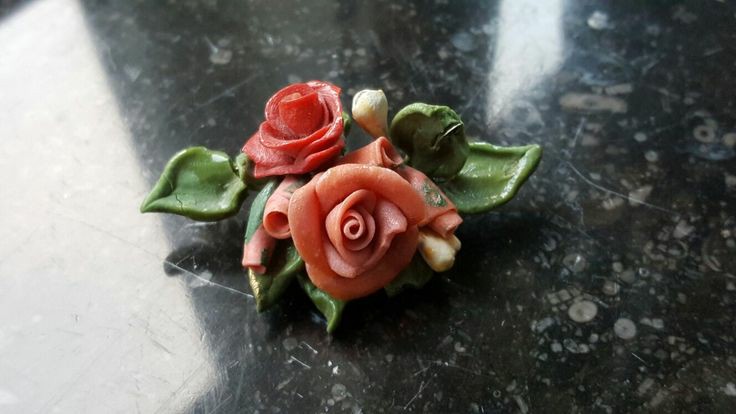 På 40- och 50-talet var också den här sorters broscher vanliga. De säljs ofta som plast men de är gjorda i en slags plastlera, en slags föregångare till cernitlera tänker jag. De är hemmagjorda och troligen var det någon kvällskurs man kunde gå eller något man kunde lära sig via någon veckotidning är min gissning.