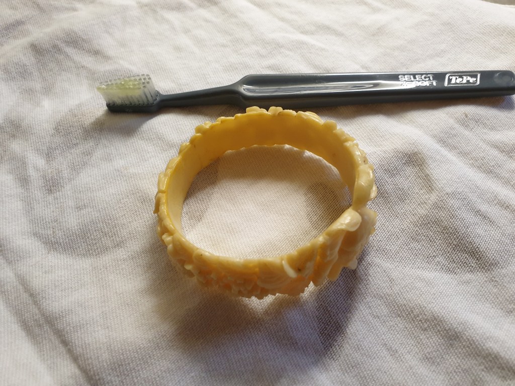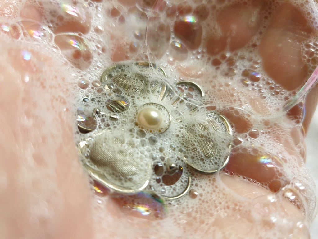 Och för det andra – kom ihåg att det är gamla/äldre smycken du håller på med. Var inte för energisk med rengöringen, du tar ju också bort patina om du gör smycket som nytt.