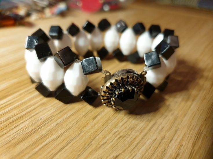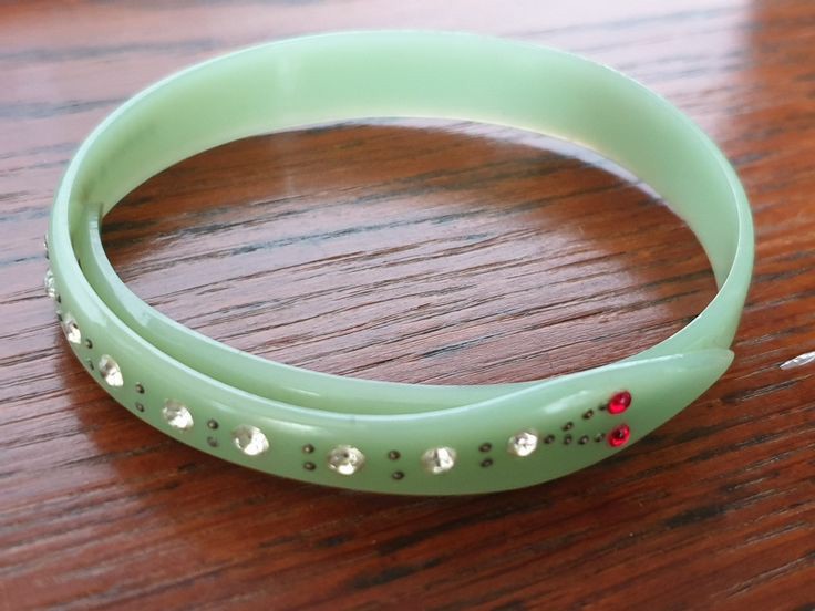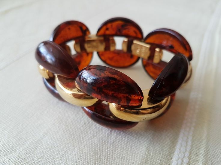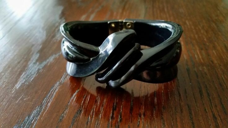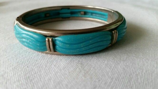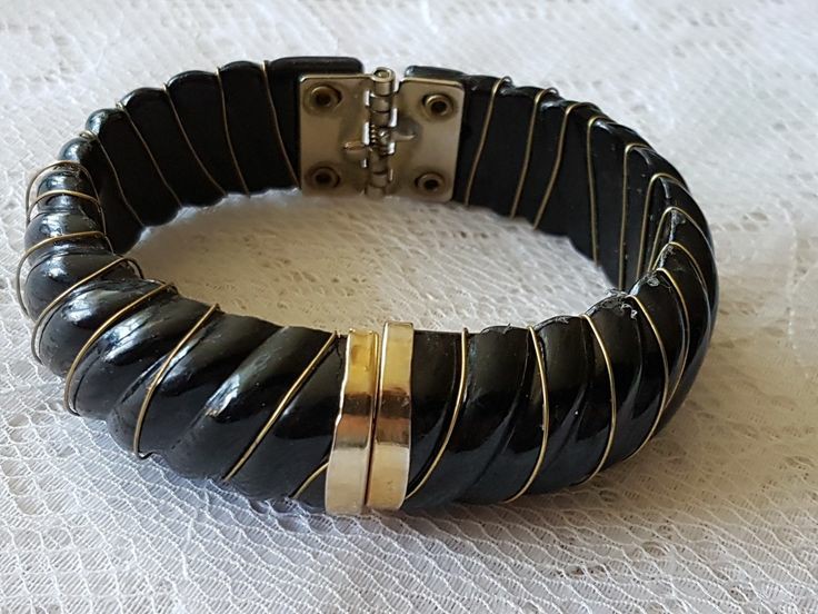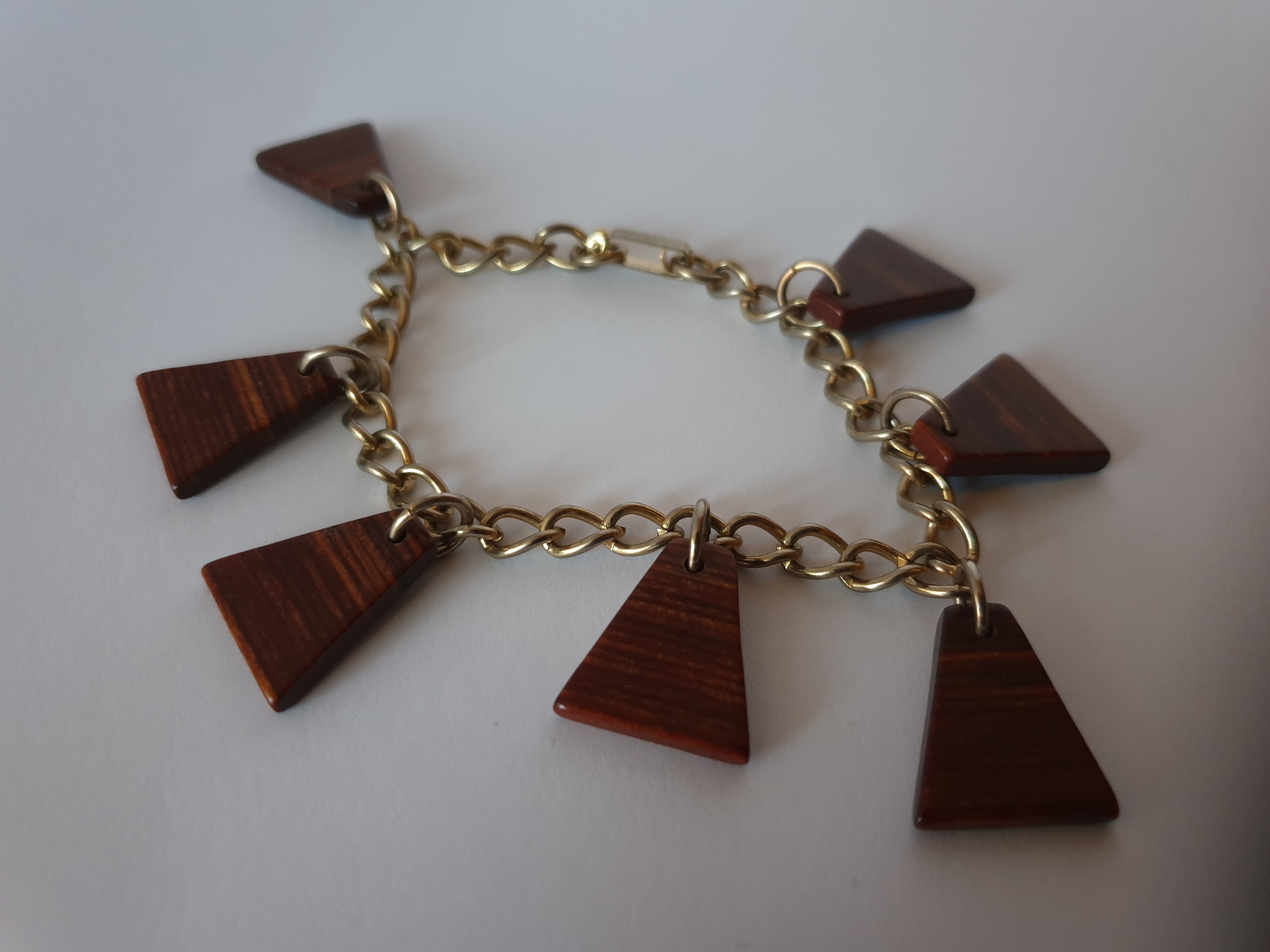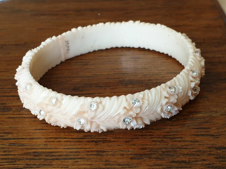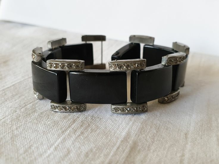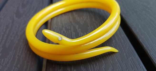 Sekelskiftet fram t.o.m 20-talet. Det äldsta armbandet jag har i samlingen är nog armbandet i vulkanit, ett av de tidiga material som fanns i plastens barndom. Rent kemiskt är inte detta plast, det är ett naturmaterial, men det var bland de material man jobbade med för att hitta nya material. Den tidigaste celluloiden var väldigt skör och det är nog därför det är otroligt ovanligt att hitta riktigt gamla smycken men fram på 10/20-talet var både plasten stabilare och hade slagit igenom på lite bredare front. En sak att komma ihåg rent allmänt är att kvinnorna var mindre och spensligare förr så hittar du ett stelt armband från 20-talet som passar dig (om du inte är väldigt finlemmad) så är chansen stor att det är ett armband som ska bäras på överarmen, tänk charleston och ”flapper-girls”.