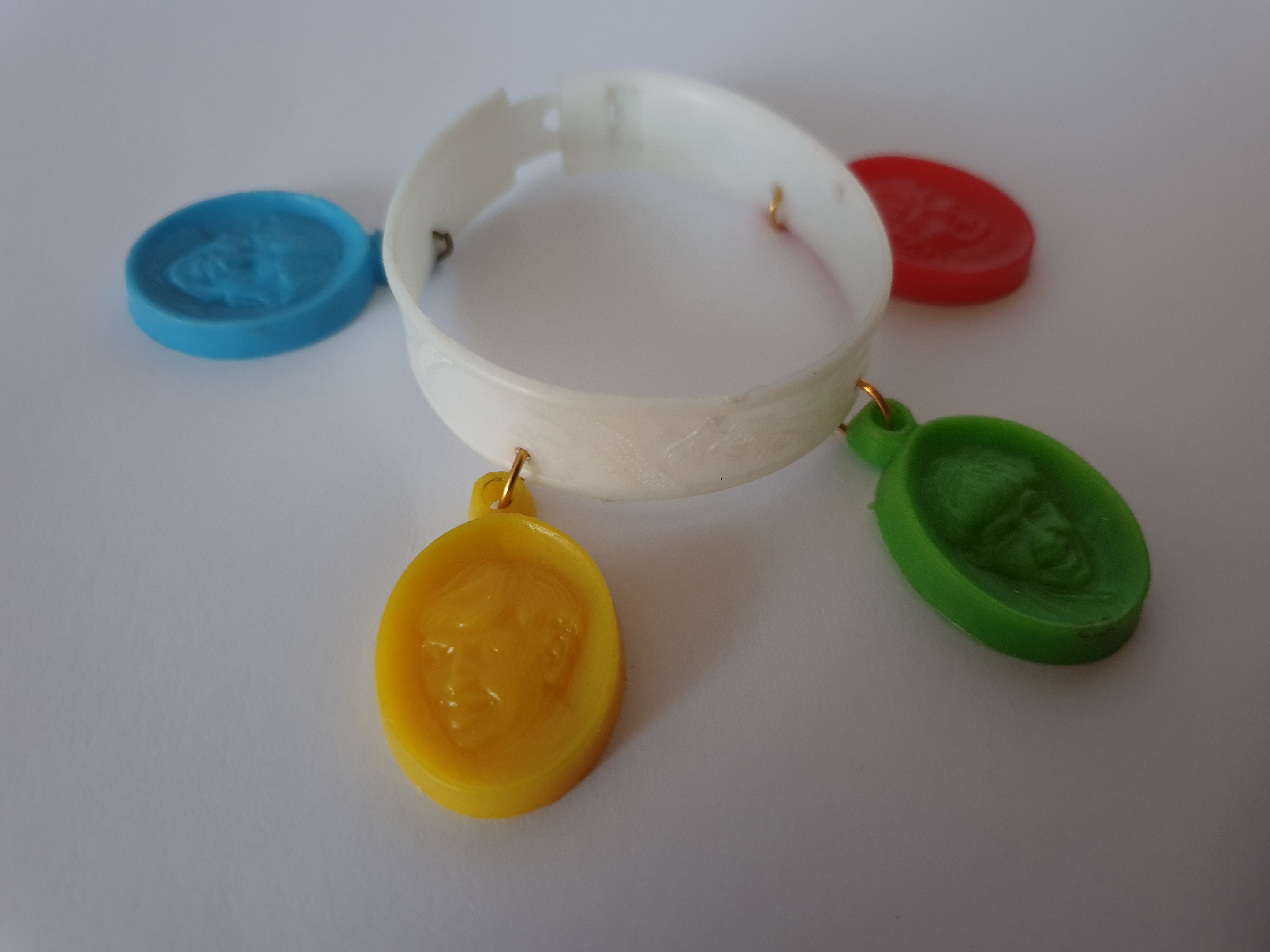 60-talet är, precis som modet, mycket grafiskt, stelt, en och tvåfärgad, tex svartvitt. Rätt mycket ”art deco-stil”, Jag har medvetet valt att inte ha med en- och tvåfärgade stela armband av den enkla anledningen att de är mer eller mindre hopplösa att datera. Har naturligtvis sådana i samlingen men det är få som jag känner mig säker på dateringen. Armbanden i nedre högra garnet är 60-talets variant på 30- och 40-talets celluloidarmband. Nere till vänster är ett, för mig, udda armband som ska föreställa de fyra killarna i Beatles. Tror att det gjordes en hel sådant kopplat till stora artister men de säljs oftast till samlare, alltså inte plastsamlare som jag utan samlare av just den gruppen eller artisten – och då blir det oftast en helt annan prisnivå. Även om även en del plastsmycken har gått upp rejält i pris sedan jag började samla.