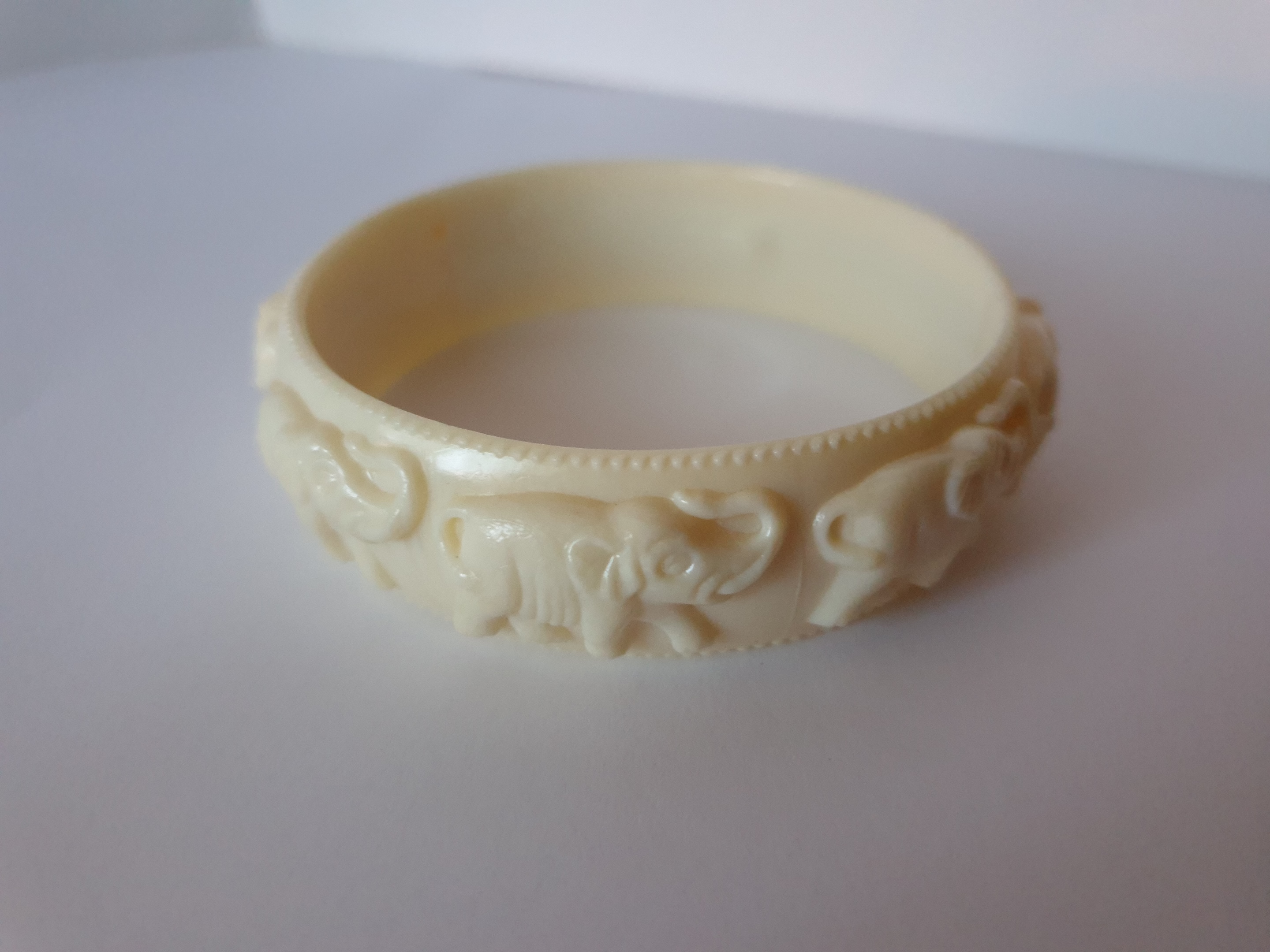 Jag försöker hålla min samling från 60-talet och bakåt, både för att på 70-talet blev materialen sämre, mycket masstillverkat i Asien, men också för att då är vi framme vid ”min egen” tid (var tonåring under 70-talet). På 70-talet såldes en del plastsmycken via de företag som hade hemförsäljning av smink som tex Avon och Oriflame, tror att det svarta halvstela armbandet i mitten i övre raden eventuellt kan komma från Oriflame. Armbandet i det övre vänstra hörnet kan vara från slutet av 60-talet eller 70-tal, förutom plasten har det den väldigt typiska väldigt lätta (och billiga) metallen som var vanlig då, det här armbandet hade du säkert kunnat köpa på Epa (för er som minns det). Det nedre i högra hörnet med elefanter är 70-talets ”kopia” av 30- och 40-talets blom/djurarmband i celluloid.