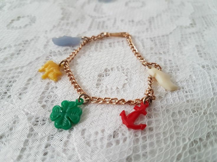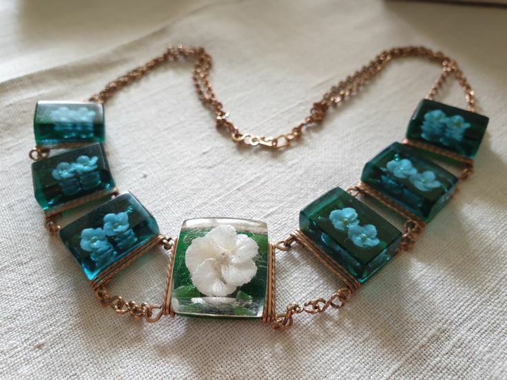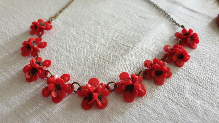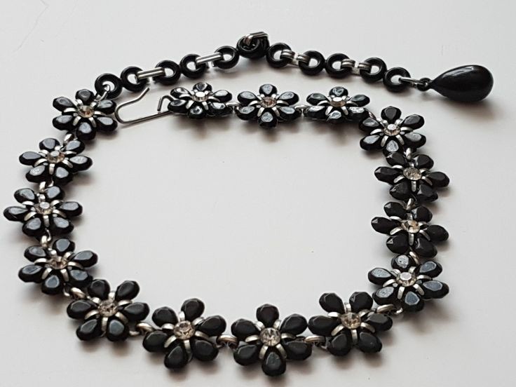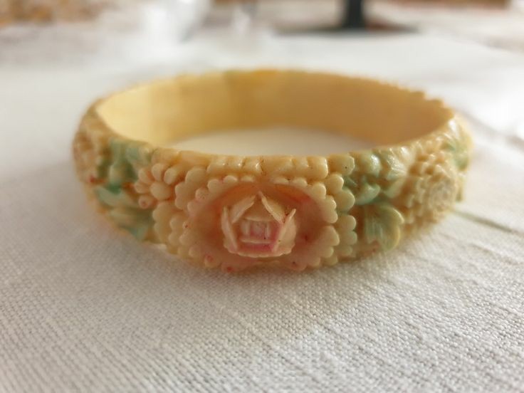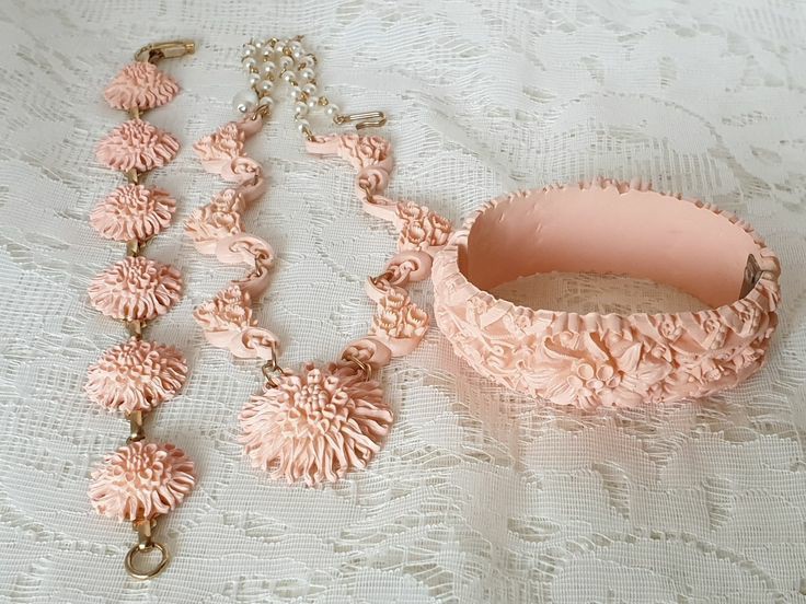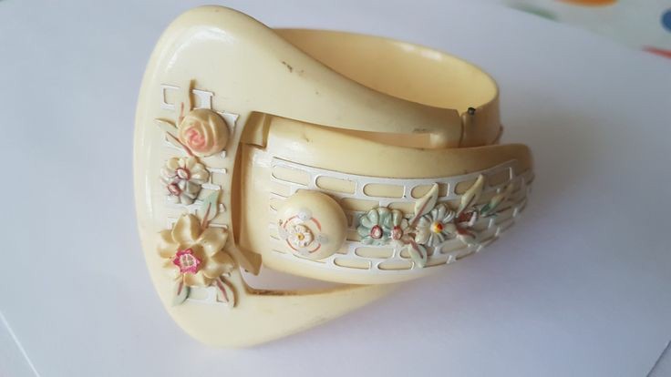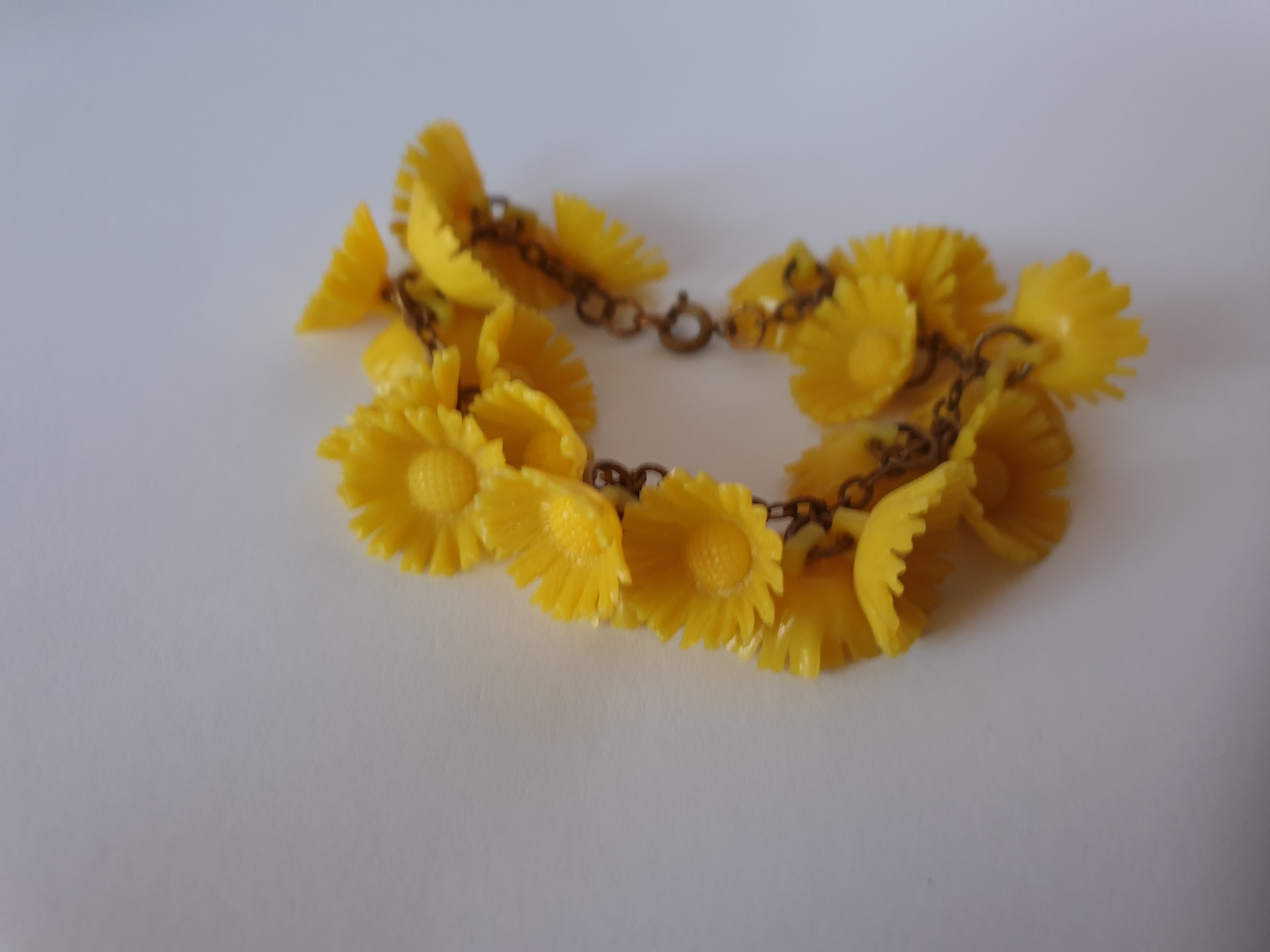 40-talet ser det ungefär likadant som för broscherna, mycket blommor och djur i celluloid. De stela blommande armbanden kommer de flesta från Japan. Luciten kommer och 3D-varianten hittas även på armband, just det här är från Frankrike. Och som du så småningom kommer att se på halsbanden är varianten ”många blommor på rad” vanligt som det nedre armbandet till höger.