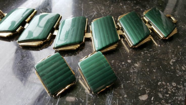 30-talet syns art deco-stilen särskilt tydligt på armbanden, mycket kantigt och räta linjer. Samtidigt är det, precis som med broscherna, ganska blommigt. Armband som är gjorda som om de hade spänne är också en vanlig modell. Personligen älskar jag art deco och bär gärna dessa armband själv bara de inte har stenar (som jag är för rädd för att tappa). Men det vackraste armbandet i samlingen, bara att titta på, är nog det i nedre vänstra hörnet med spännet, det brukar alla fastna för. Vid den här tiden görs det också en hel del armband i bakelit, både stela och elastiska. Art deco-stilen funkar väldigt bra för den ganska kompakta bakeliten.