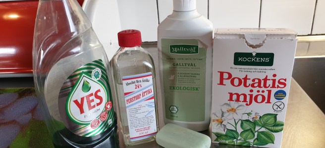 Vill du rengöra äldre kläder själv kommer du rätt långt med Yes diskmedel, potatismjöl, ättika och galltvål. Viktigt att tänka på, precis som med smycken, är att det är ett äldre plagg du hanterar, skörare tyg, skörare sömmar etc så alltid med varsamhet! Alla material kan inte heller tvättas i vatten så det absolut första är att försöka klura ut material eller i alla fall typ av material. Ibland är kanske plagget i så dåligt skick att du inte har något att förlora men försiktighet gäller. En del material kan också krympa väldigt mycket och kräver att ångas. Jag är inte på något sätt fullärd, jag trevar mig fortfarande fram…