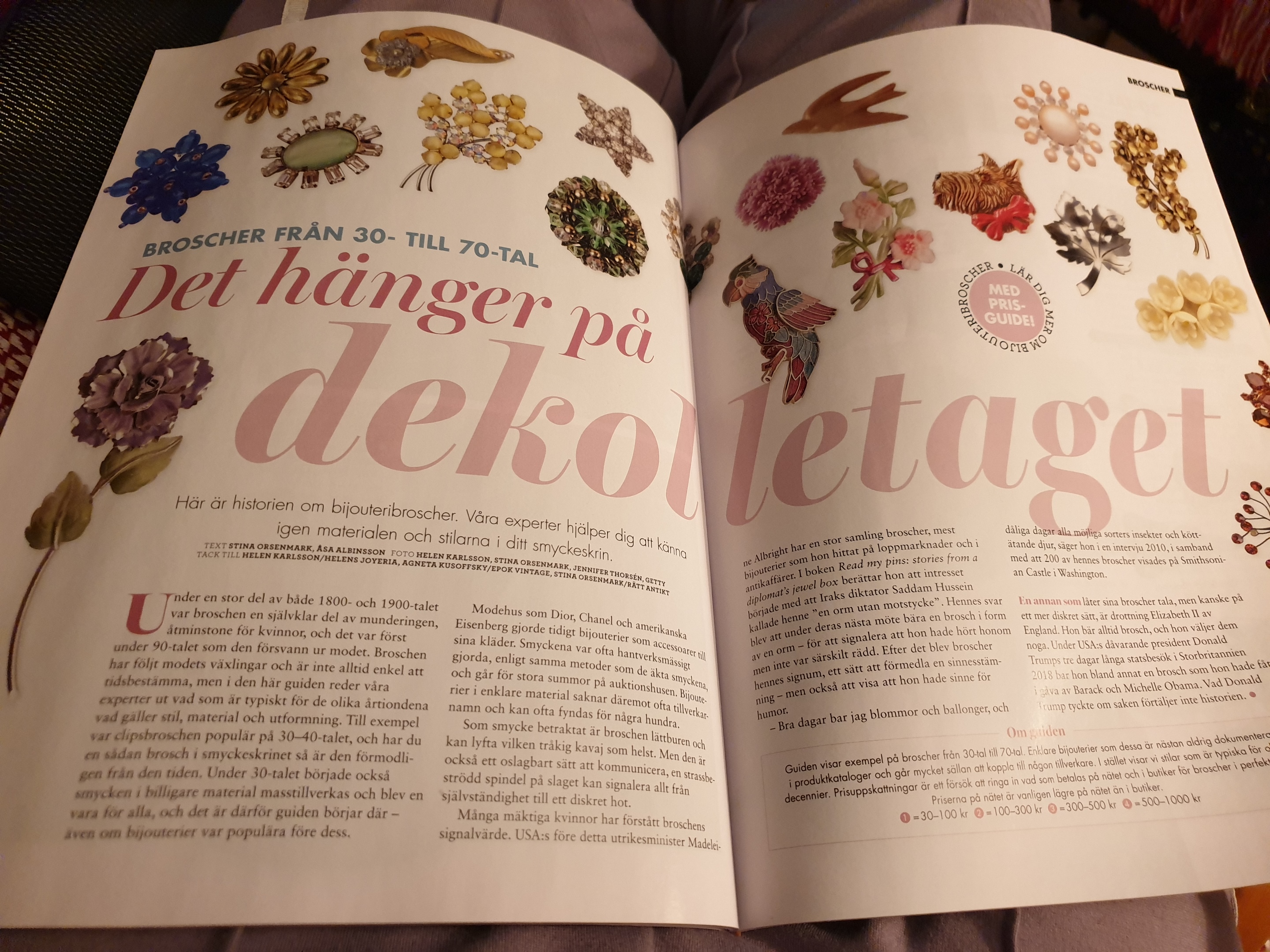 Denna gång med fem uppslag om broscher som sträcker sig från 30-talet till 70-talet. Bilder och information om speciella kännetecken för olika årtionden. Blev riktigt bra (förutom att jag ser ut som en tant på mitt foto men det är sånt man får leva med) och intressant.