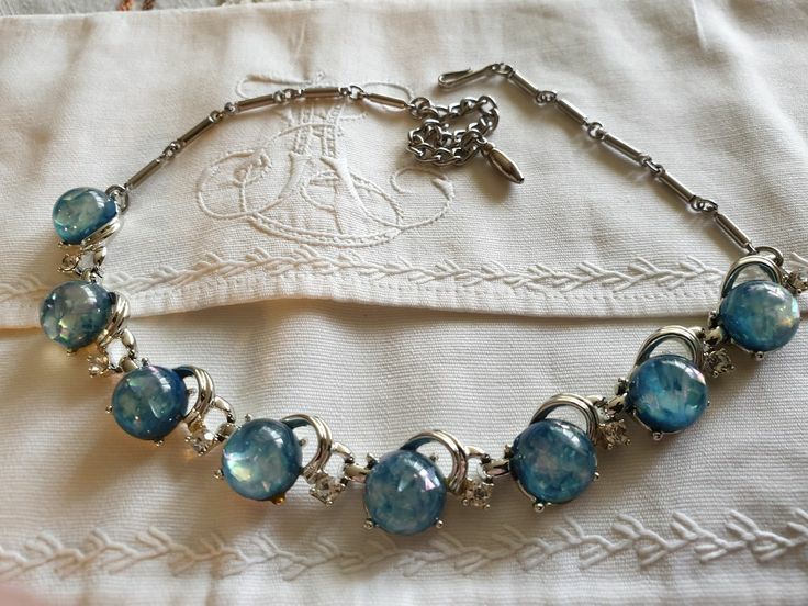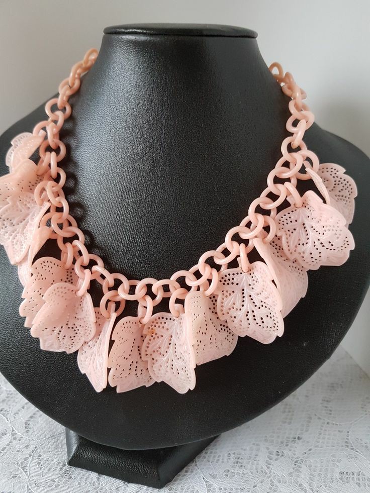 50-talet. Nu blir det färg! Det framåtriktade 50-talet när allt var möjligt och framtiden ljus så blev också smycken ”gladare”. Man skulle dessutom gärna ha matchande set, halsband och örhängen, halsband och armband etc. Celluloiden hänger med in i 50-talet men lucite, termoplast och en hel massa andra plastsorter gör halsbanden färgglada, ger dem ”sken” och gör dem mer lekfulla. Blommor är självklara, många doserade pärlhalsband med plastpärlor i olika färger men inte minst halsbanden med metalldetaljer och platta plastdetaljer.