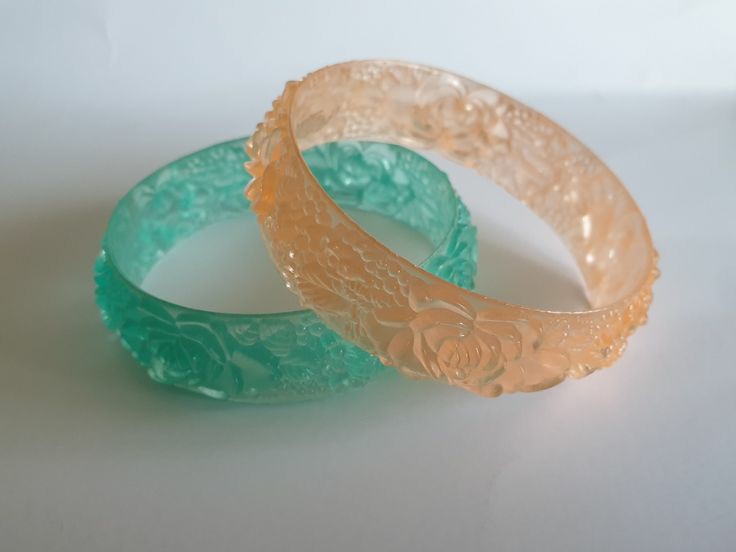 50-talet är setens förlovade tid, du ska inte bara ha ett twin-set med jumper och kofta, du ska också ha matchande halsband, armband och örhängen, gärna i vad som brukar kallas termoplast men även en celluloid med ”torrare” yta är vanlig. Hänger även med in på 60-talet. Lite mer set kommer i ett eget inlägg så småningom. Stela armband i lucite, både släta och med 3D-effekt är vanliga.