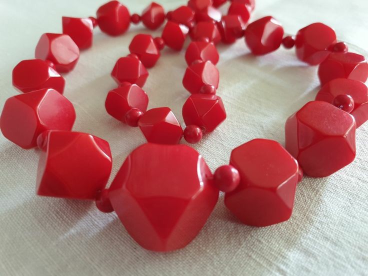 30-talet och art deco. Blommor går nog aldrig riktigt ur modet, blommorna hänger med från 30-talet och framåt, åtminstone tom 70-talet. Annars är det väldigt mycket art deco-halsband med raka former och geometriska mönster. Halsband med plastpärlor har ofta även de geometriska mönster som tex fasetterade pärlor. Plastmaterial under 30-talet är celluloid, absolut vanligast, men 30-talet är det årtionde man gör smycken av bakelit, den lite ”kraftigare” bakeliten passar bra i art decons lite kantiga stil. Men även galalith är ett rätt vanligt material, väldigt ofta i skuren/snidad form.