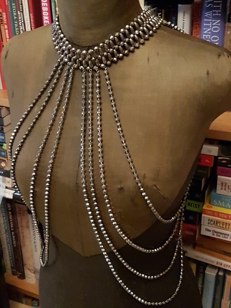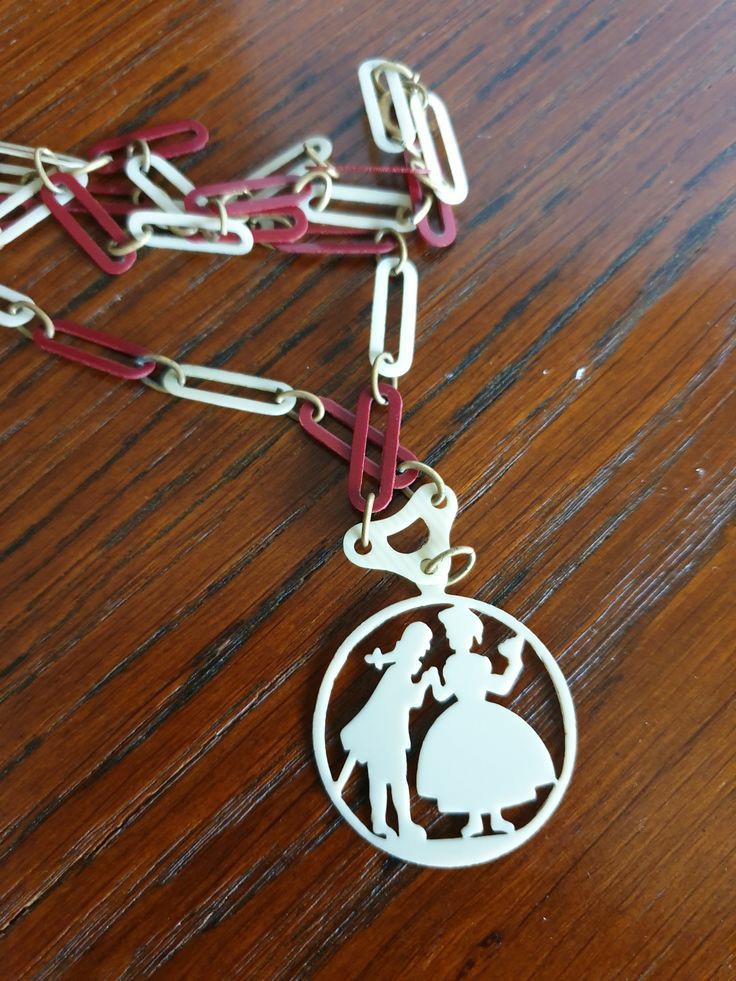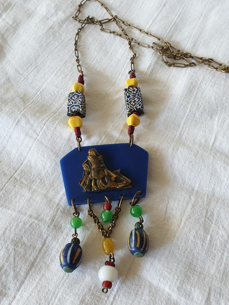 Sekelskifte fram tom 20-talet. Smycken följer så klart allt annat mode och de flesta halsband från den här tiden var långa, fram på 20-talet kunde dessutom vara väääldigt långa, tänk charleston och ”flapper-girls”. Det andra alternativet var att det satt upp i halsen, sk dog-collar/hundhalsband (!). Men även tidigare var halsband ofta långa men då beroende på att alla kläder gick ända upp i halsen. Under 20-talet fann man Tutankamons grav och det gav också upphov till en strid ström av smycken i ”egyptisk stil” med dekor av både faraoner men också mängder av andra figurer ur den egyptiska historien, ormar, sfinxer osv. Celluloid var det absolut vanligaste plastmaterialet men galalith och ett annat smycke av bakelit dyker upp när vi närmar oss 30-talet.