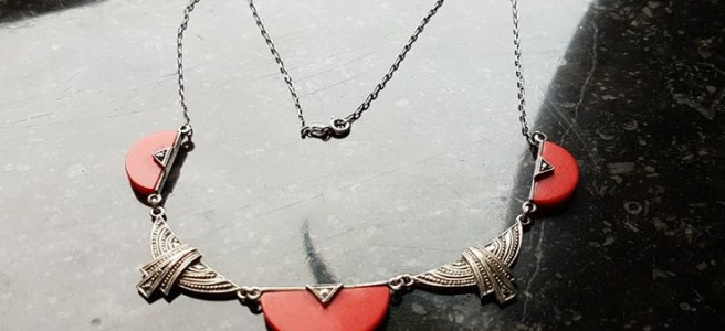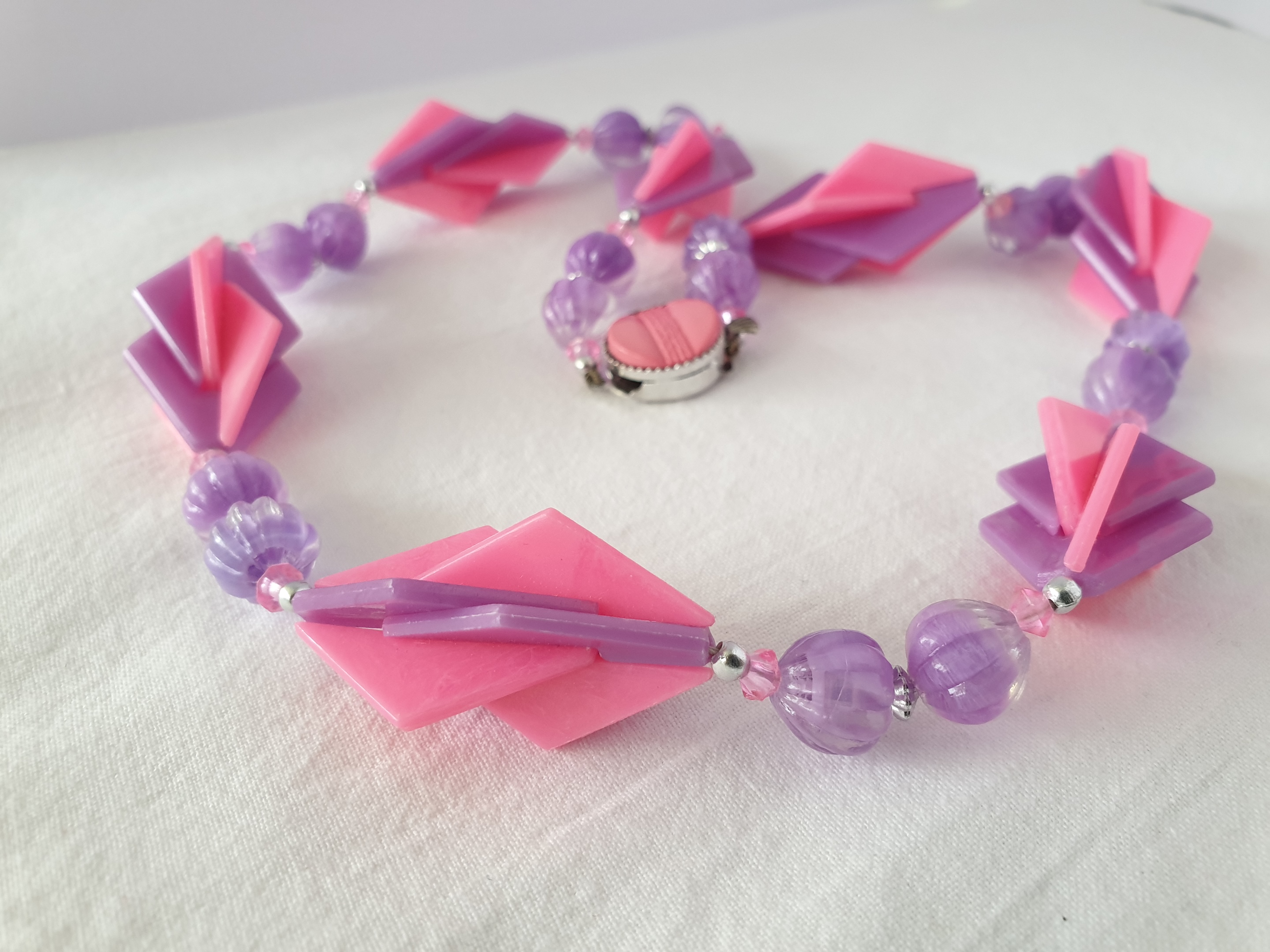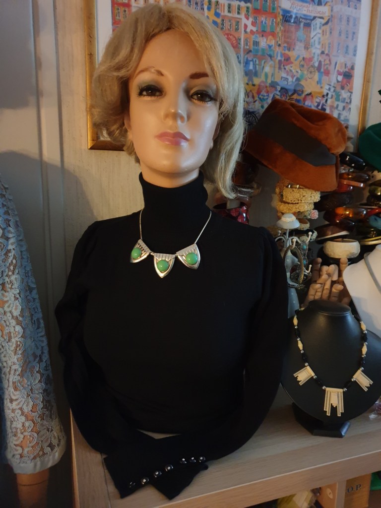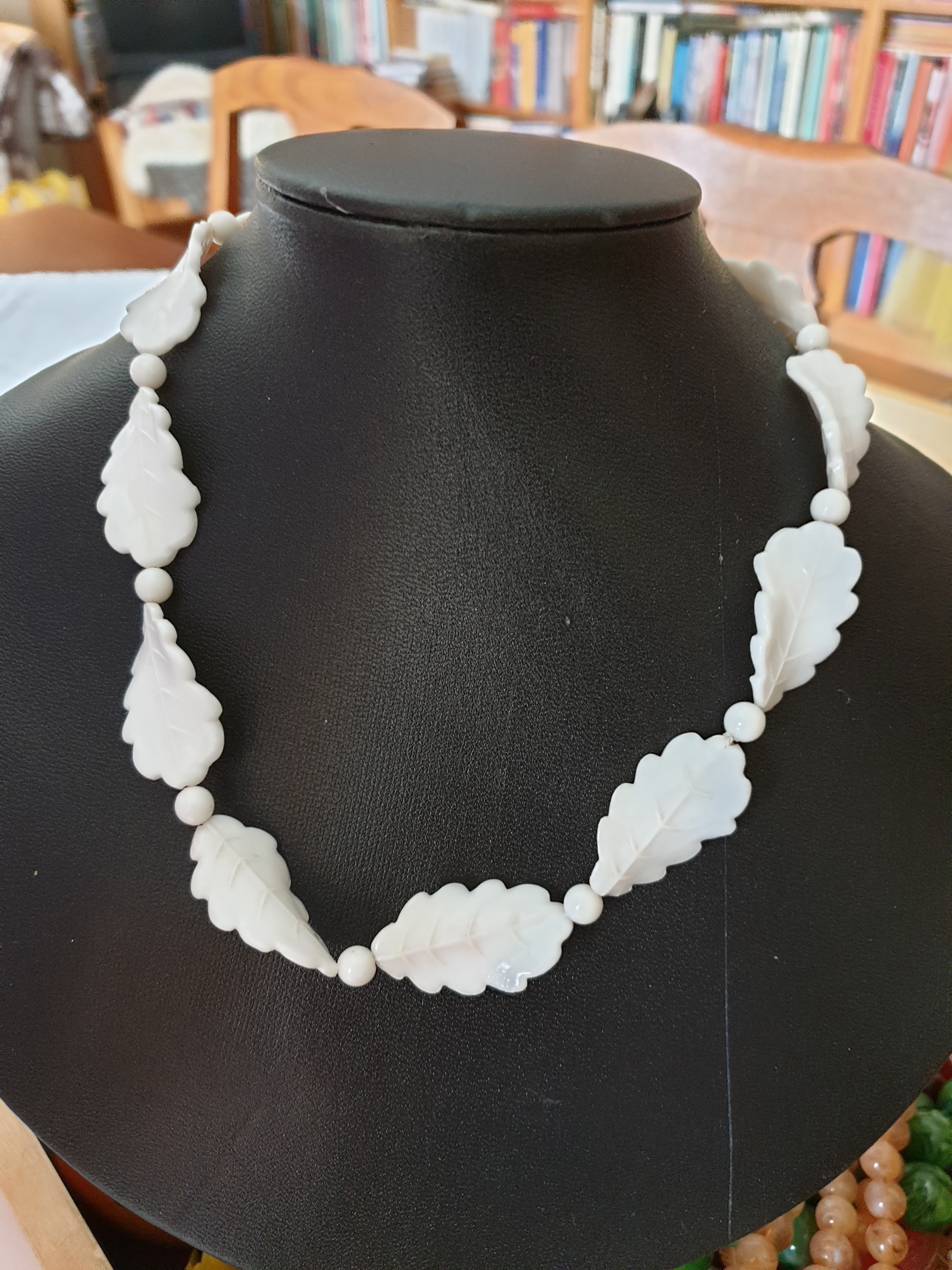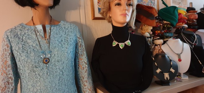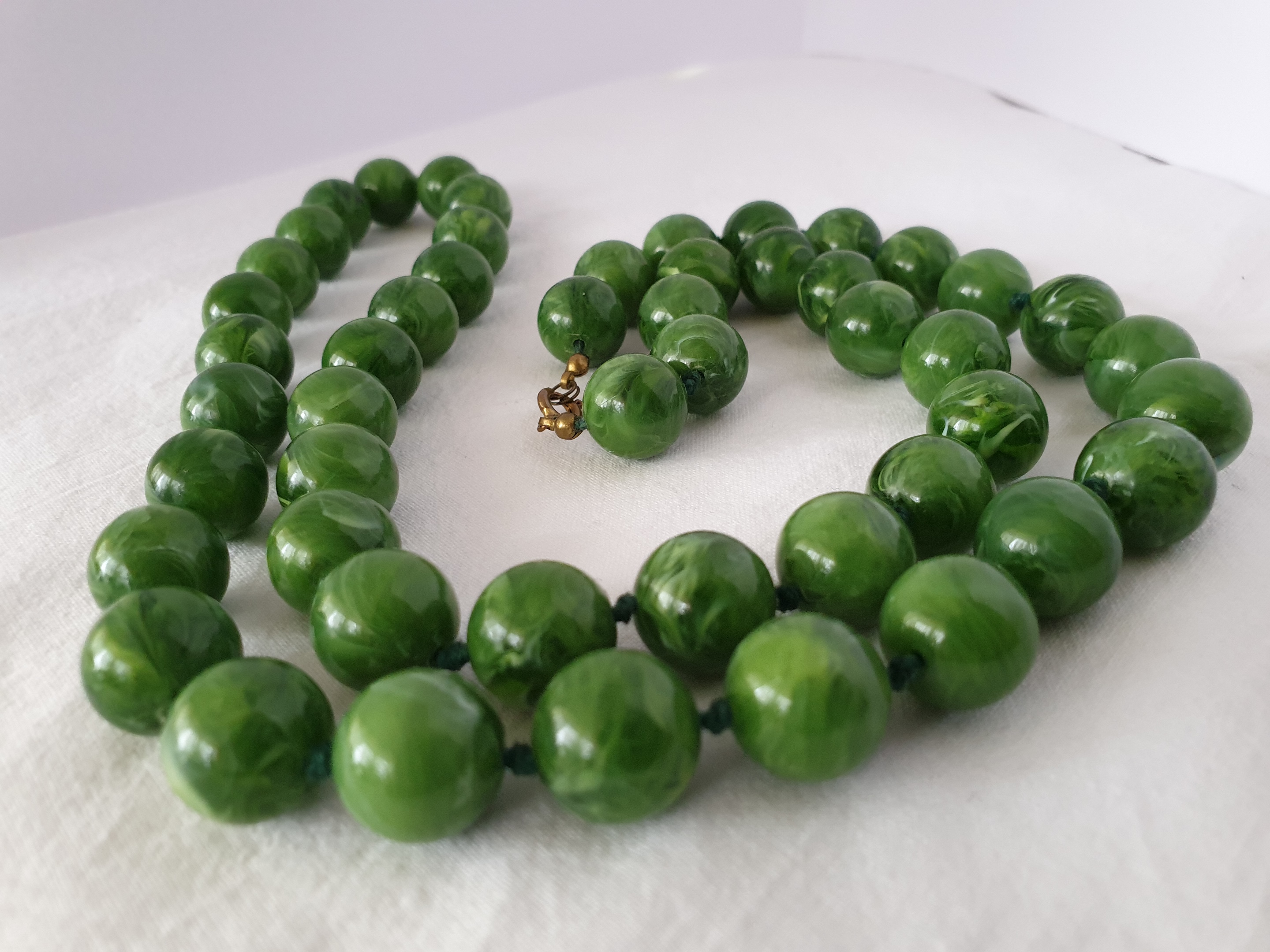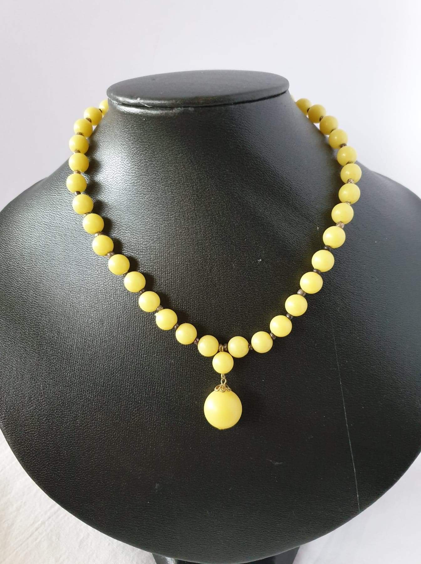 Några halsband, från vänster ett halsband i thermoplast från 50-talet, ett gult halsband jag är väldigt osäker på, gissningsvis även det 50-tal i okänt plastmaterial och ett halsband från 60-talet. Det skulle kunna vara 70-tal men det har lite bättre kvalitet än vad 70-talarna brukar ha så jag är rätt övertygad att det är 60-tal. Nederst ett bakelithalsband som är omträtt med modern tråd (och inga knutar) men själva pärlorna härstammar nog från 30/40-tal. Alltid lite knepigt att datera när det inte finns några ”tidsmarkörer” kvar och det finns nyproducerade pärlor i bakelit (oftast från gammal råvara) men jag har synat pärlorna och jag känner mig hyfsat säker på att de är gamla.