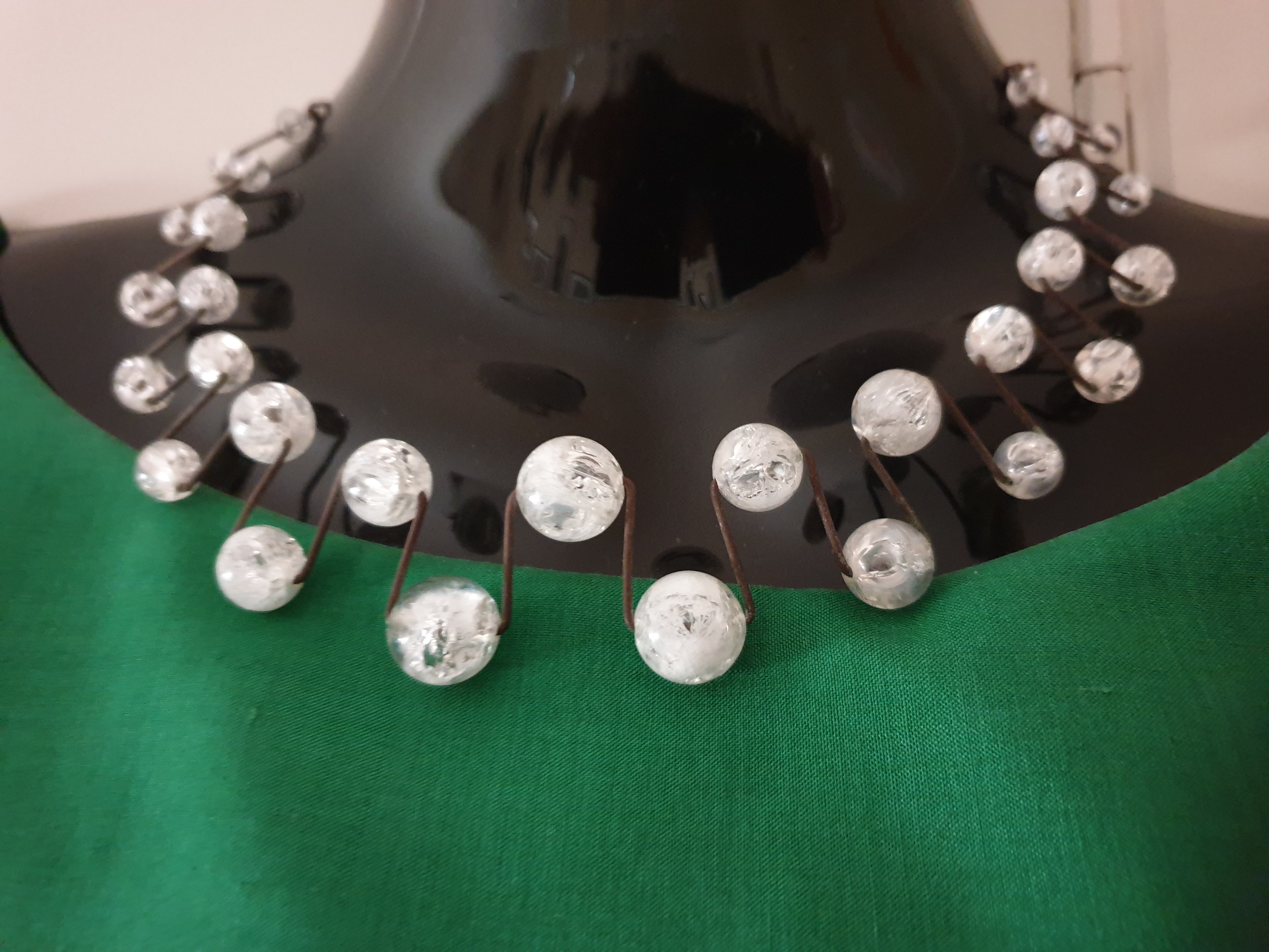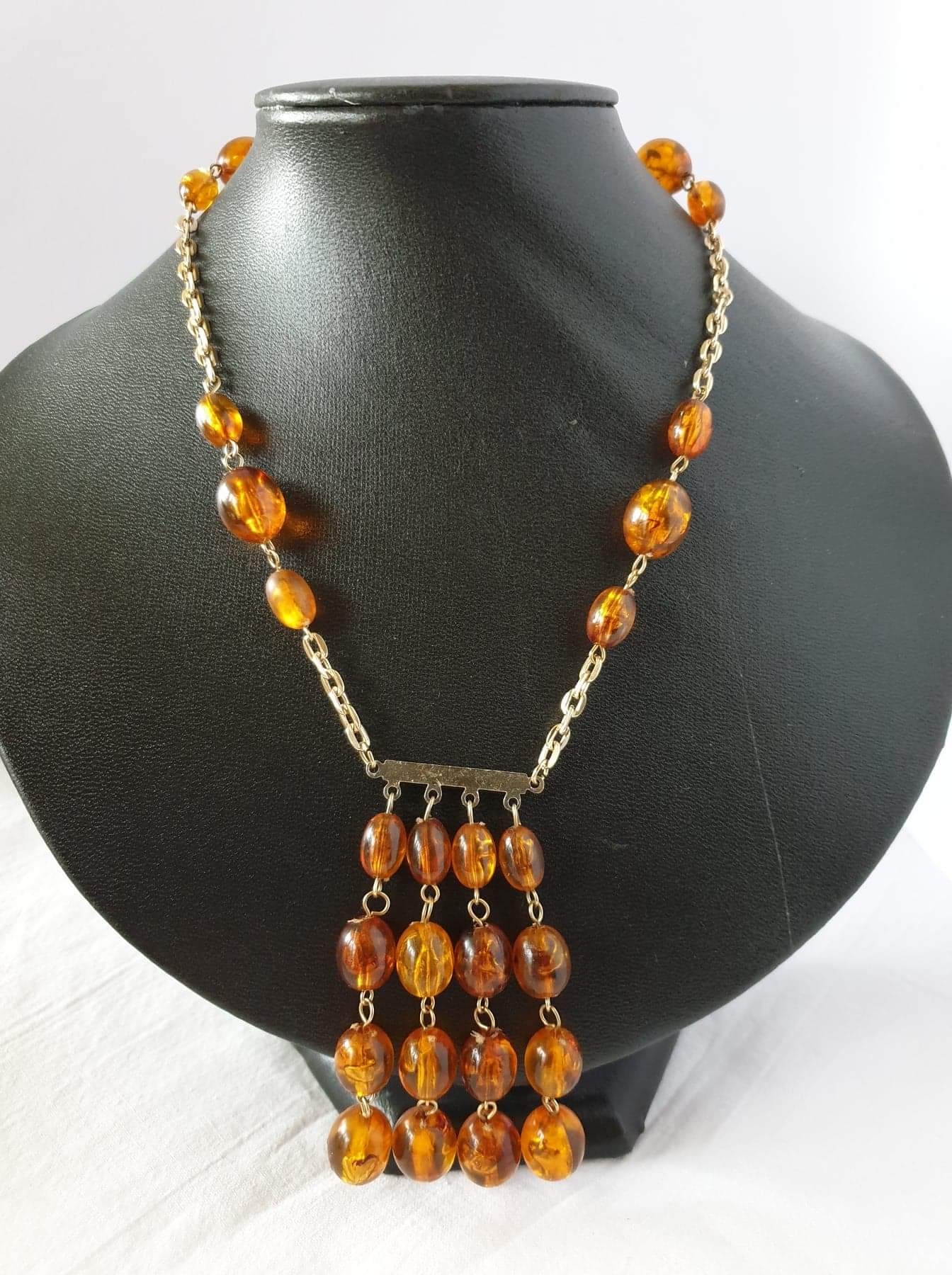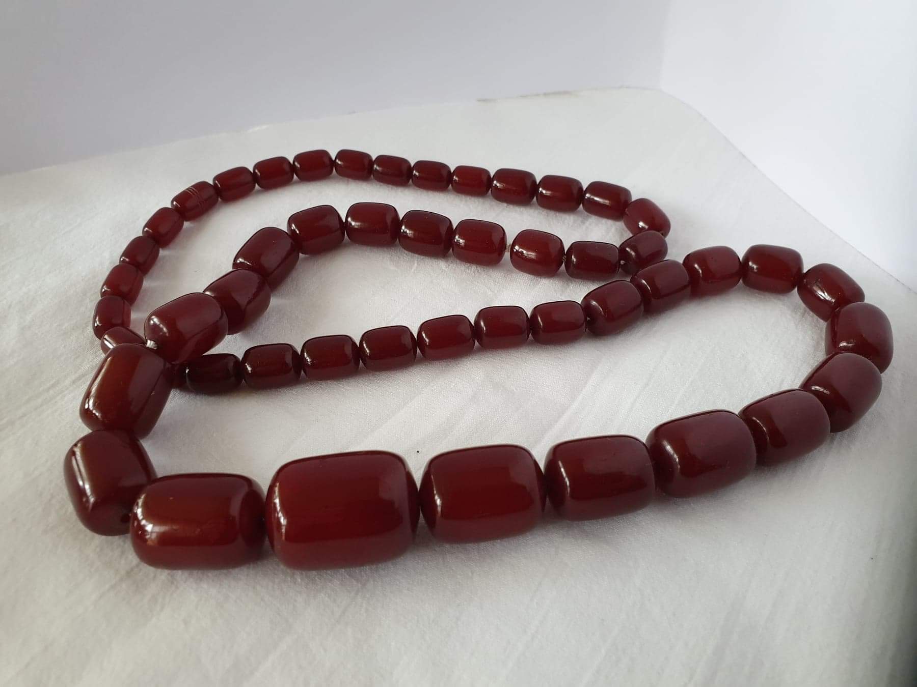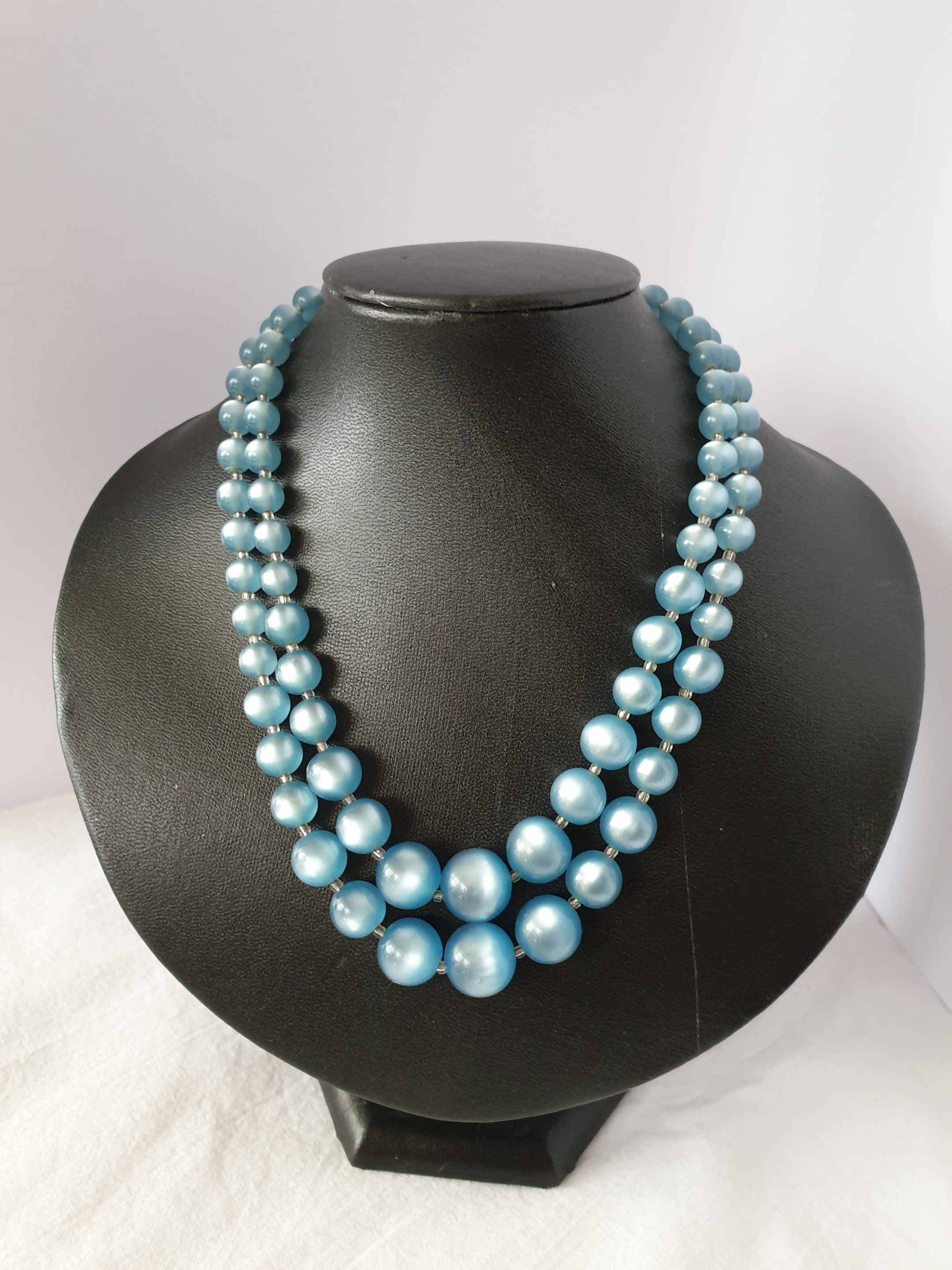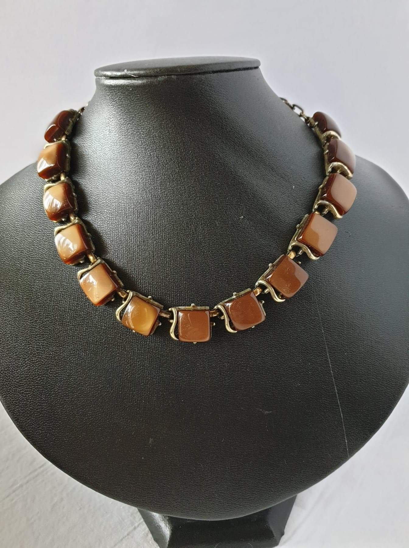 Några halsband, från vänster ett halsband i thermoplast från 50-talet, ett gult halsband jag är väldigt osäker på, gissningsvis även det 50-tal i okänt plastmaterial och ett halsband från 60-talet. Det skulle kunna vara 70-tal men det har lite bättre kvalitet än vad 70-talarna brukar ha så jag är rätt övertygad att det är 60-tal. Nederst ett bakelithalsband som är omträtt med modern tråd (och inga knutar) men själva pärlorna härstammar nog från 30/40-tal. Alltid lite knepigt att datera när det inte finns några ”tidsmarkörer” kvar och det finns nyproducerade pärlor i bakelit (oftast från gammal råvara) men jag har synat pärlorna och jag känner mig hyfsat säker på att de är gamla.