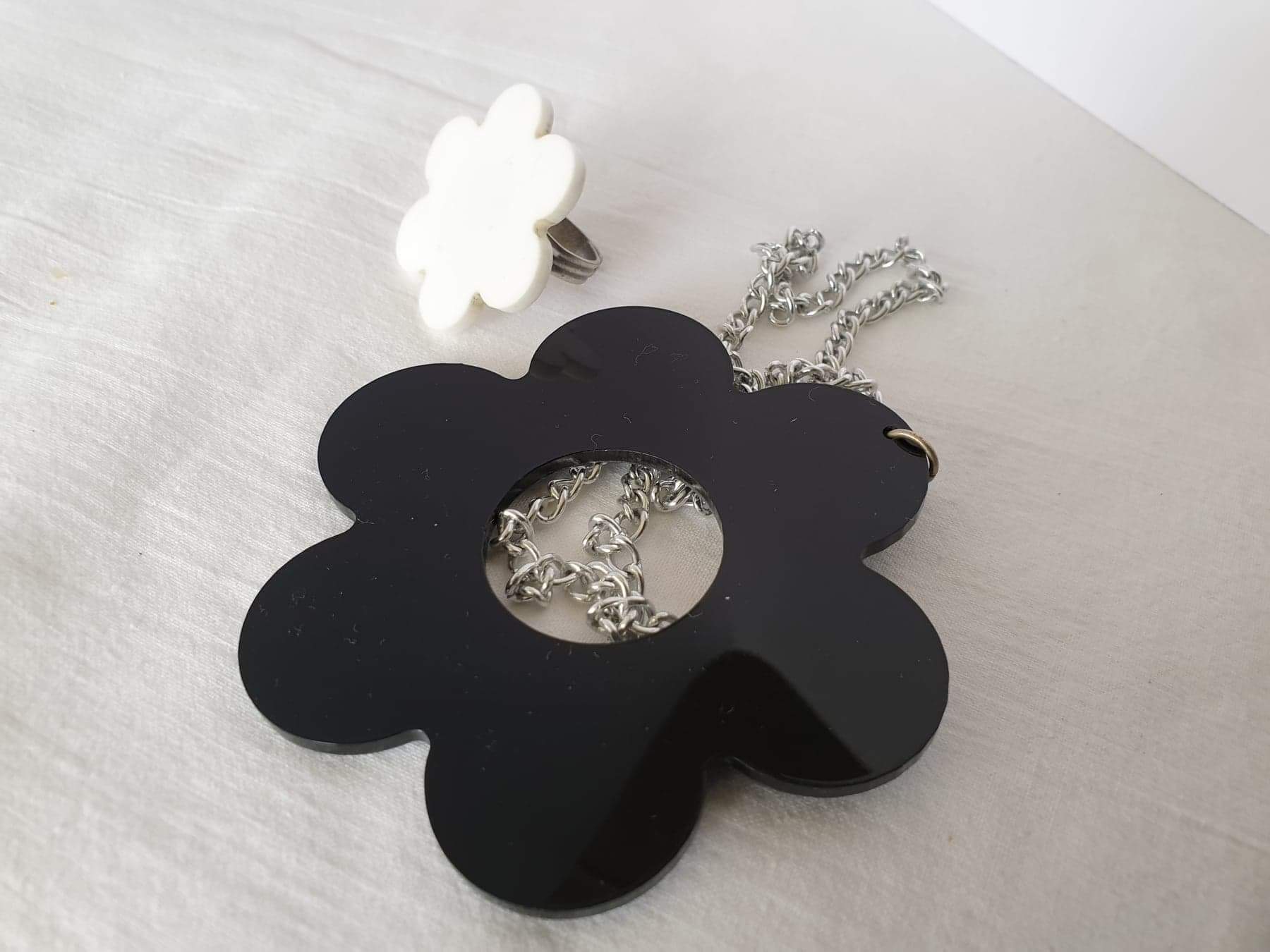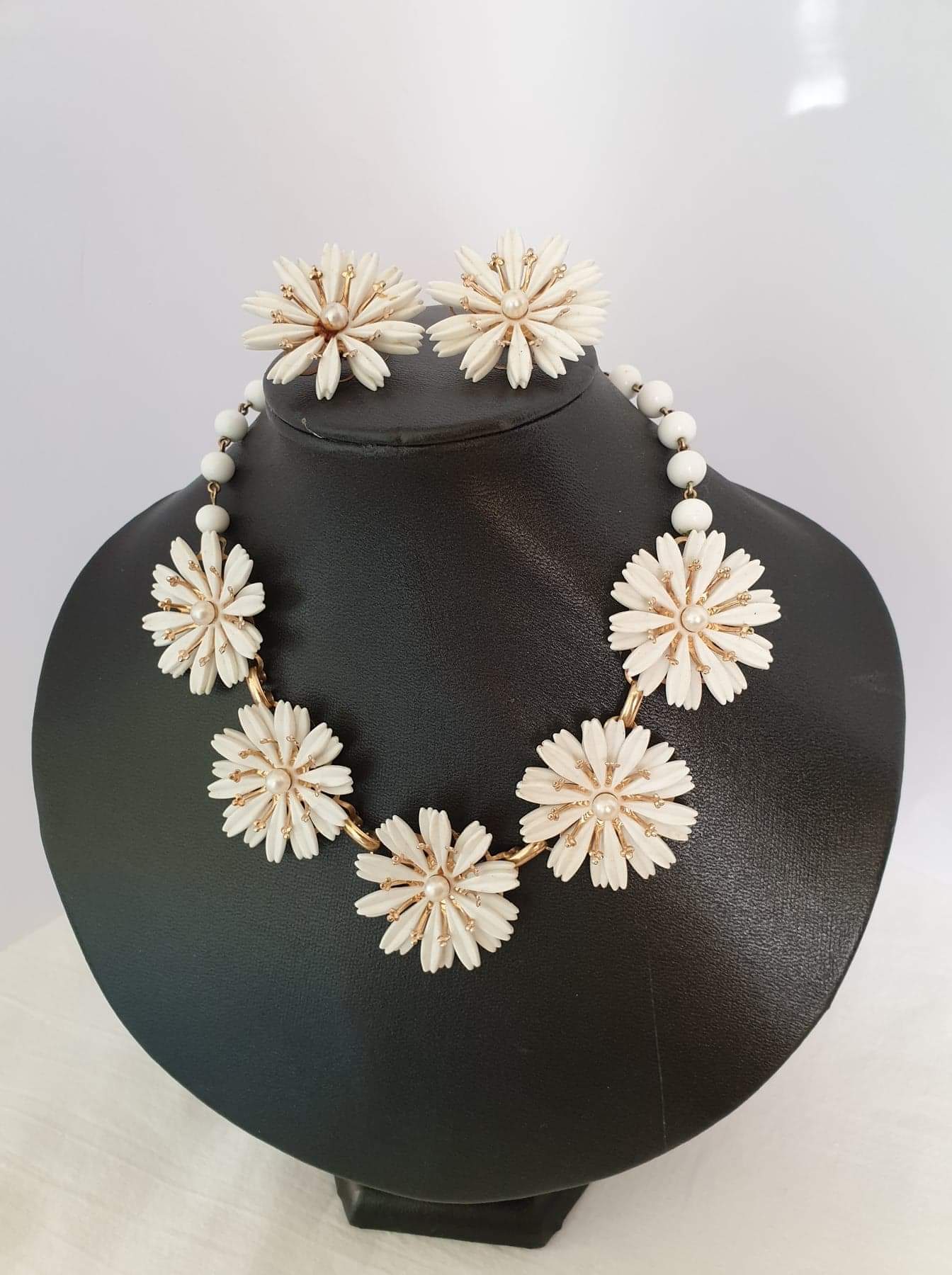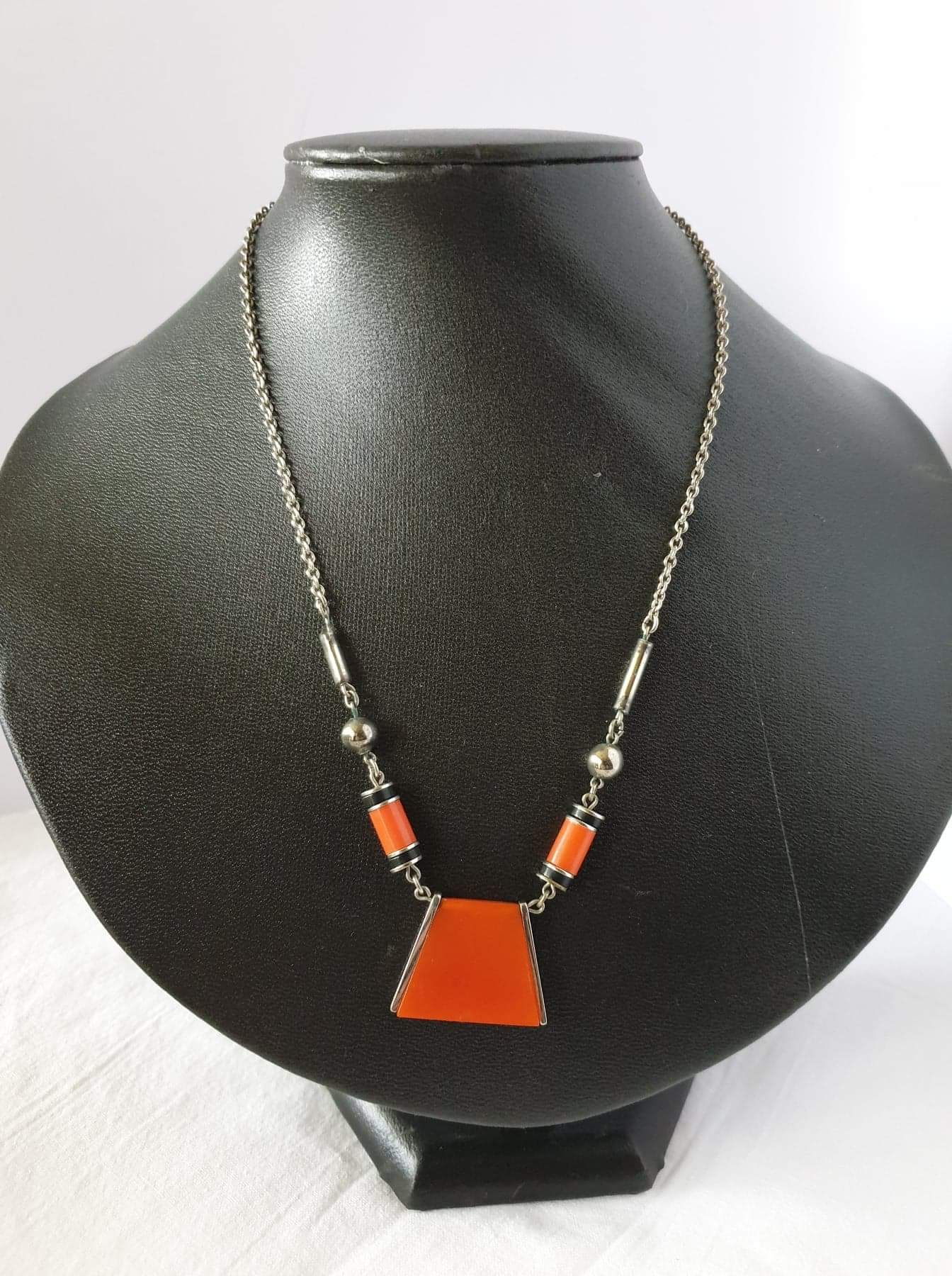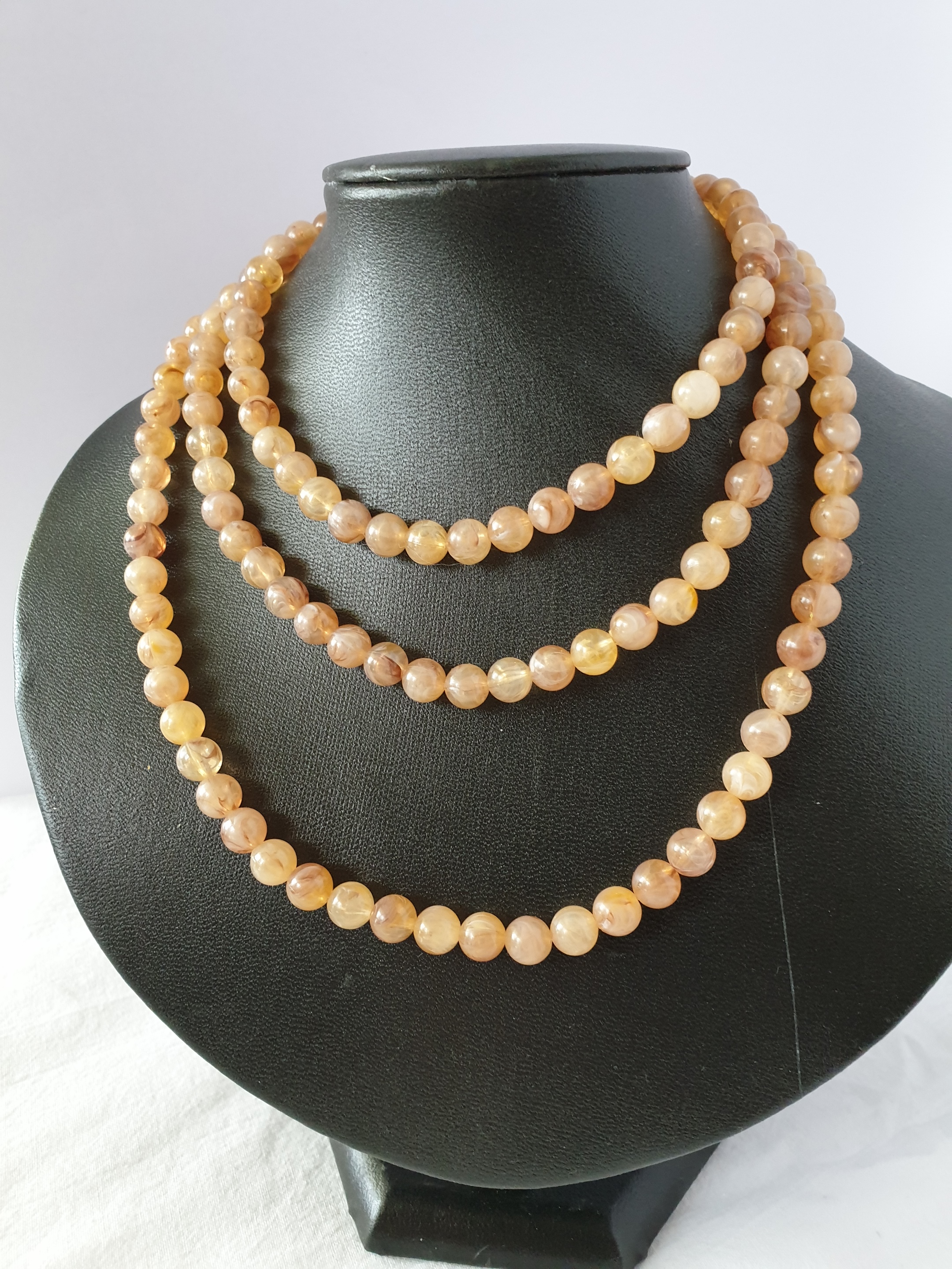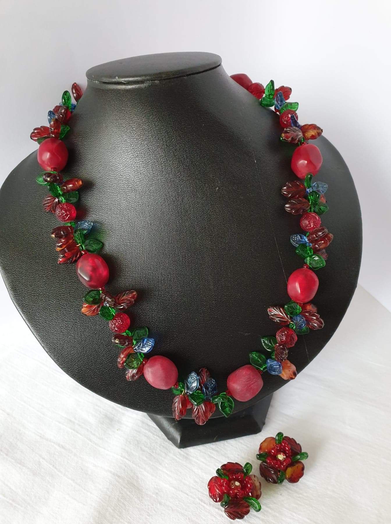 Några halsband, från vänster ett halsband i thermoplast från 50-talet, ett gult halsband jag är väldigt osäker på, gissningsvis även det 50-tal i okänt plastmaterial och ett halsband från 60-talet. Det skulle kunna vara 70-tal men det har lite bättre kvalitet än vad 70-talarna brukar ha så jag är rätt övertygad att det är 60-tal. Nederst ett bakelithalsband som är omträtt med modern tråd (och inga knutar) men själva pärlorna härstammar nog från 30/40-tal. Alltid lite knepigt att datera när det inte finns några ”tidsmarkörer” kvar och det finns nyproducerade pärlor i bakelit (oftast från gammal råvara) men jag har synat pärlorna och jag känner mig hyfsat säker på att de är gamla.