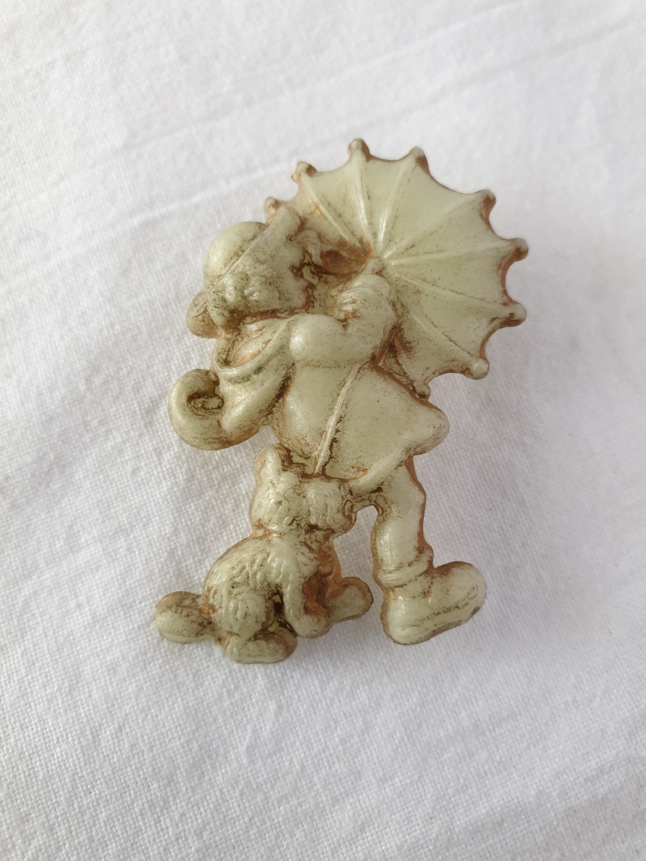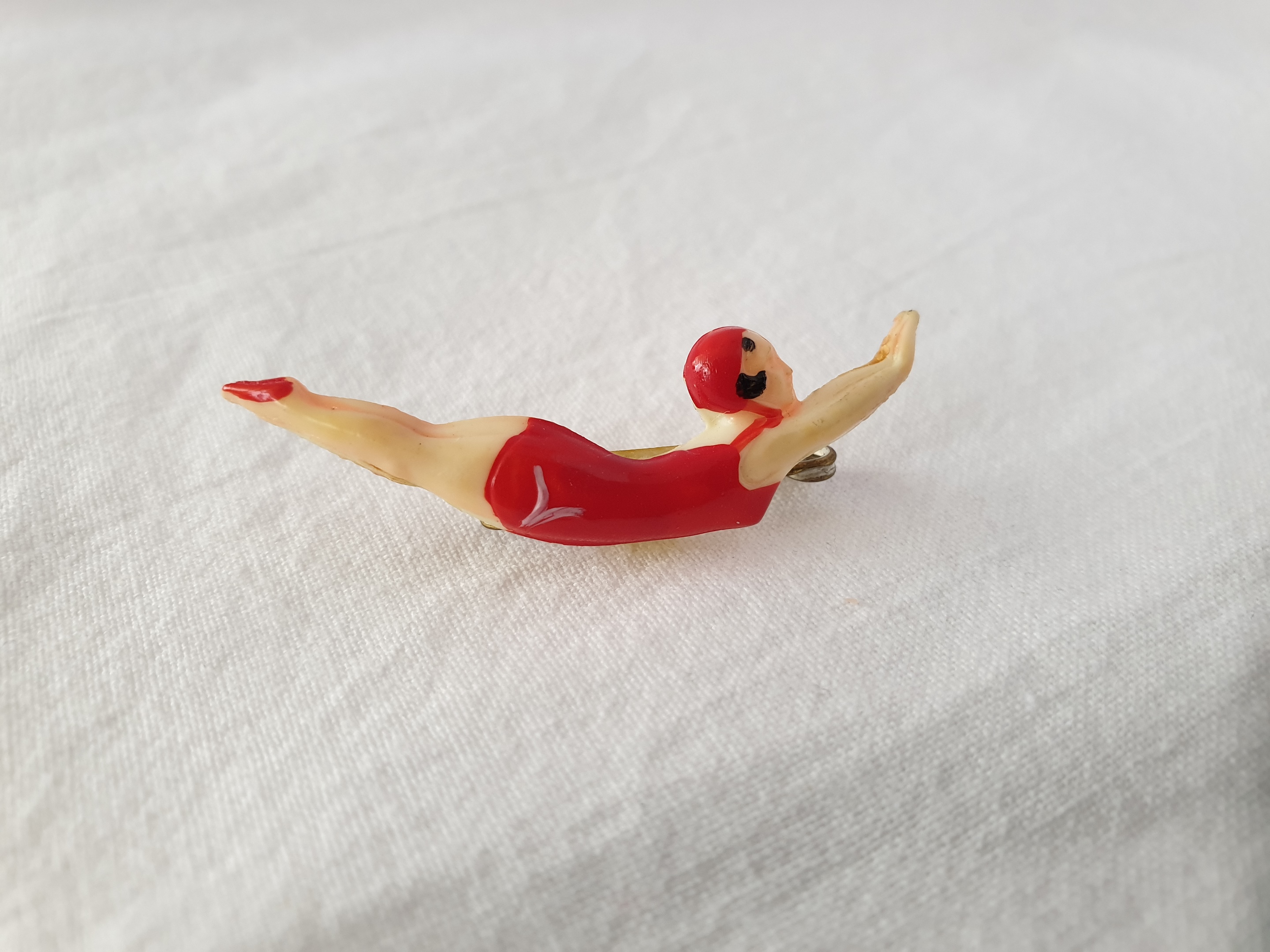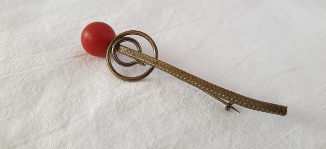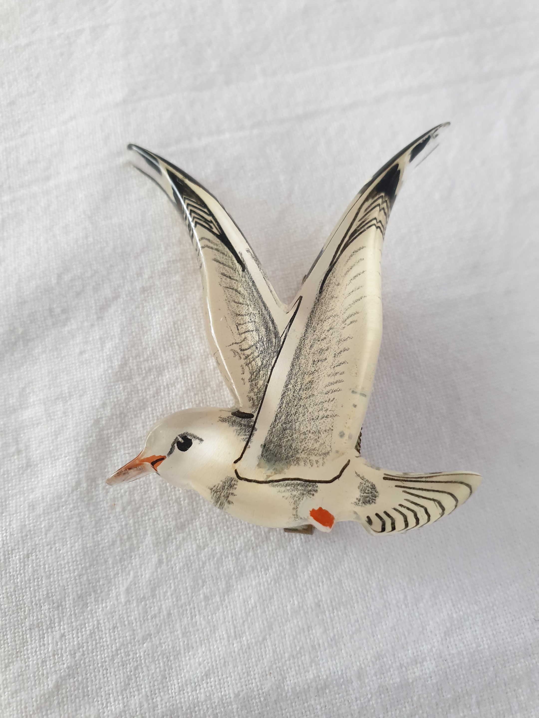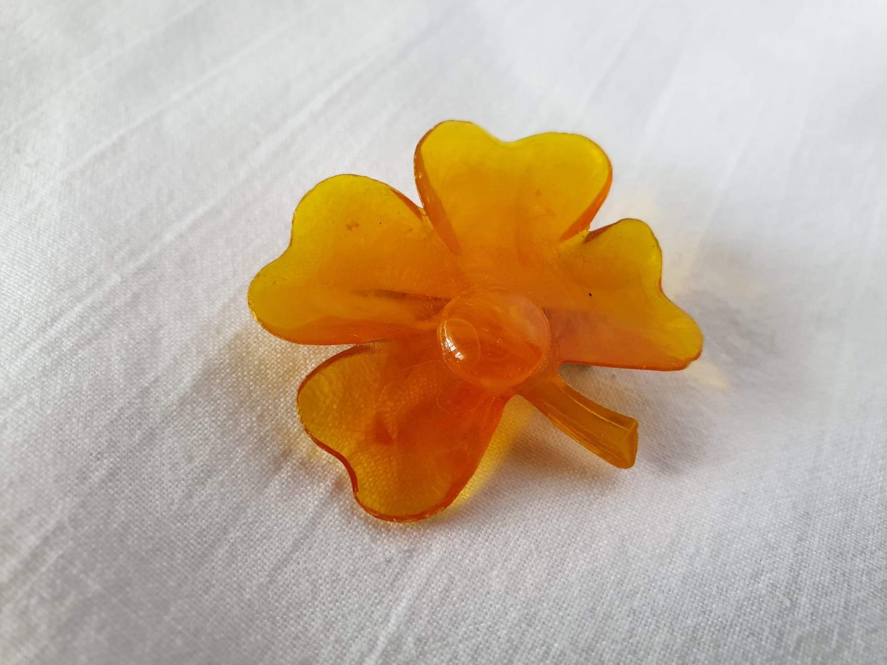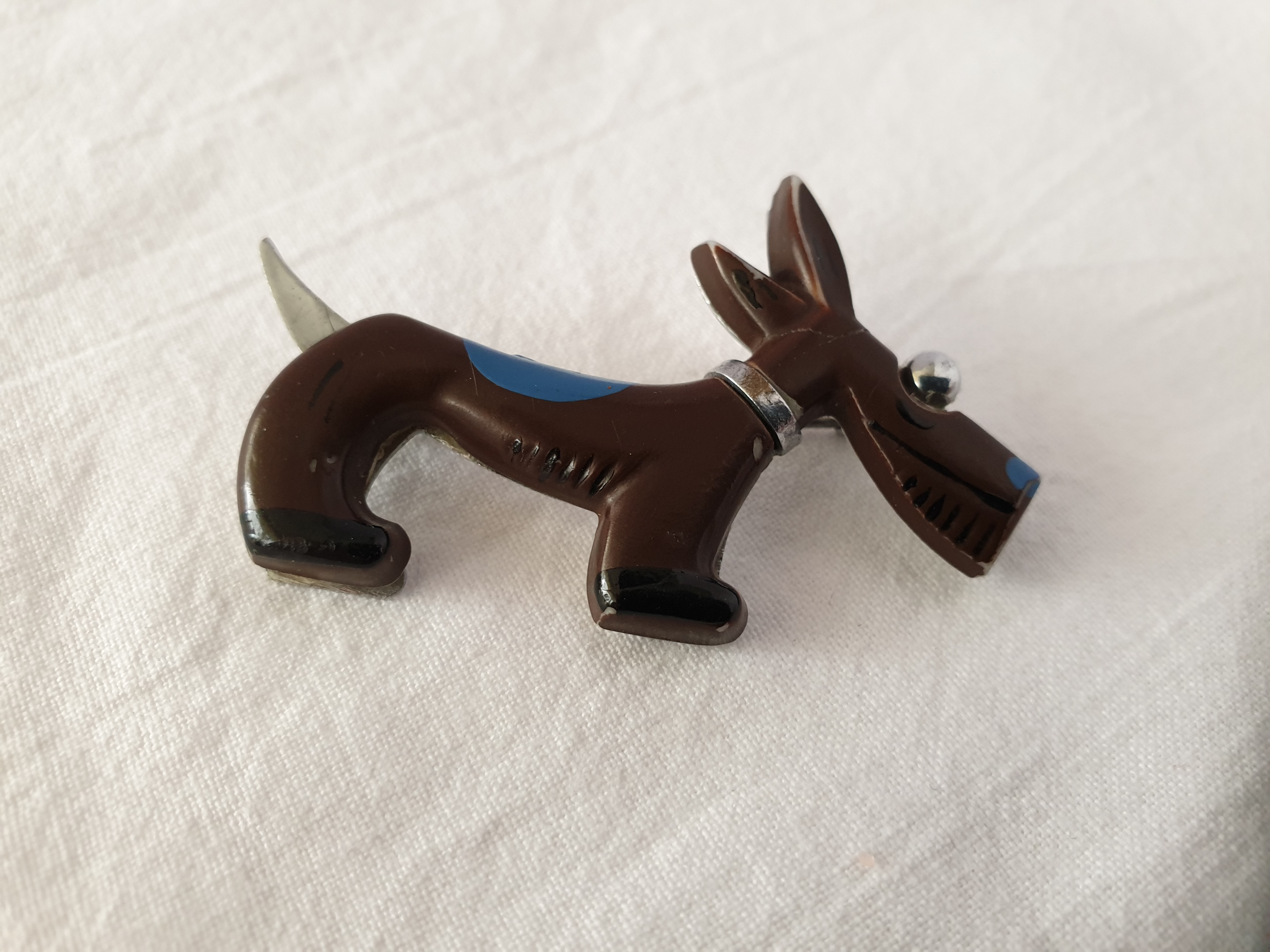 Tre underbara broscher, var och en på sitt sätt. En kanin i celluloid som är ute och åker skidor från 50-talet, möjligen 40-tal, en brosch i form av en fyrklöver som jag är lite osäker på men troligen i celluloid och från 40-talet. Så längst till höger en härlig brosch i celluloid från 40-talet, tyvärr är bilden lite mörk så det syns inte riktigt vilket djup den har.
