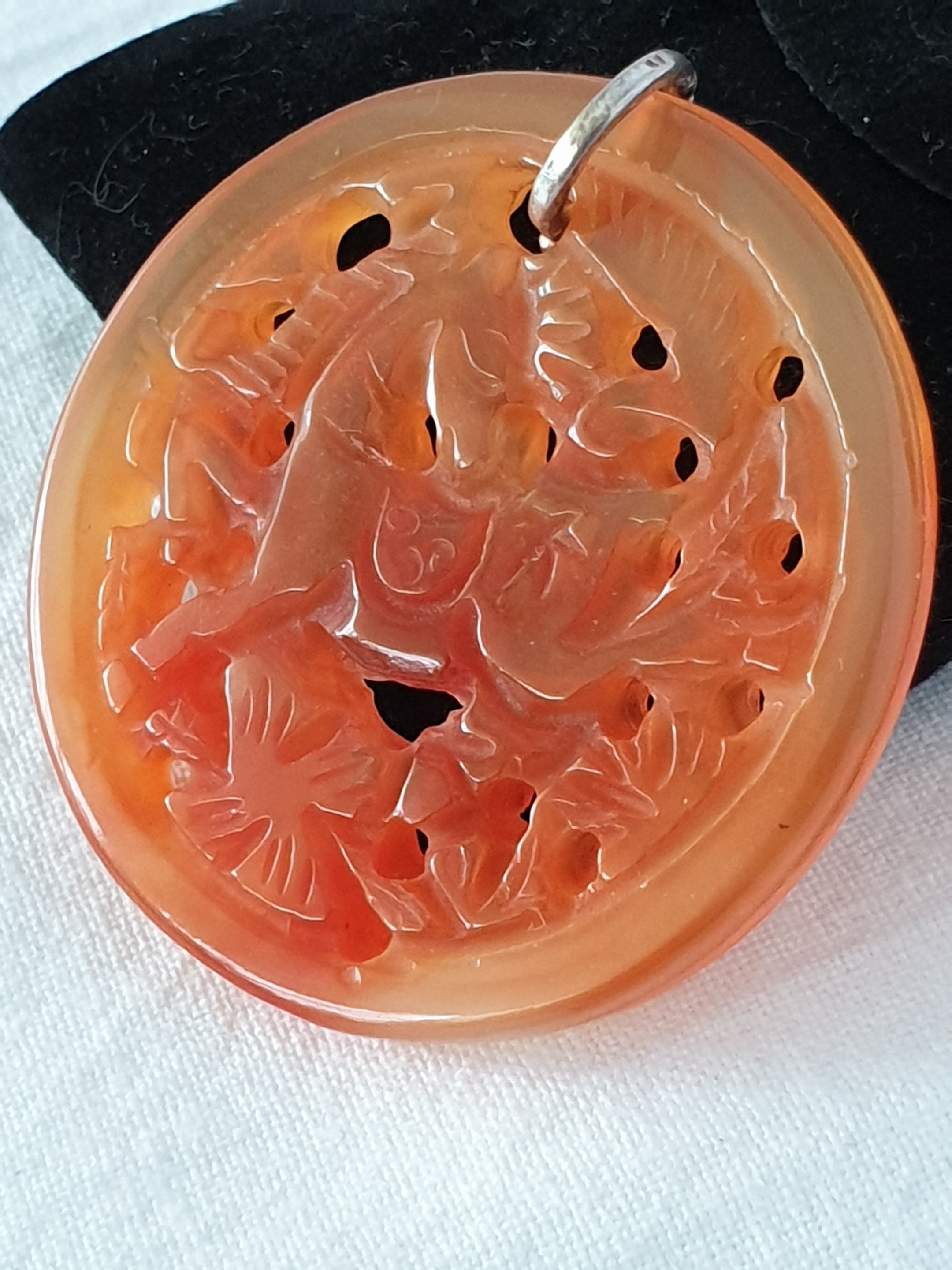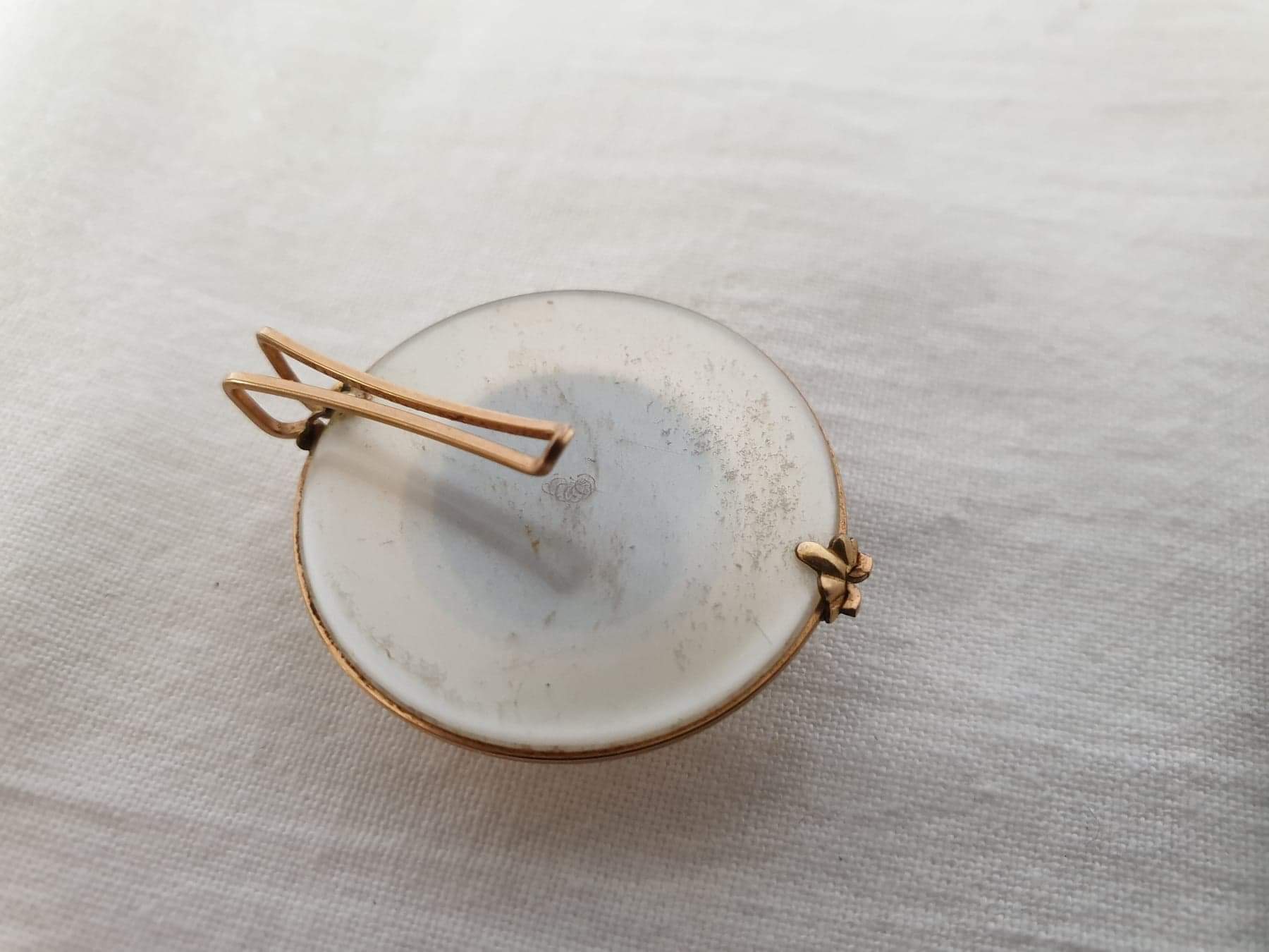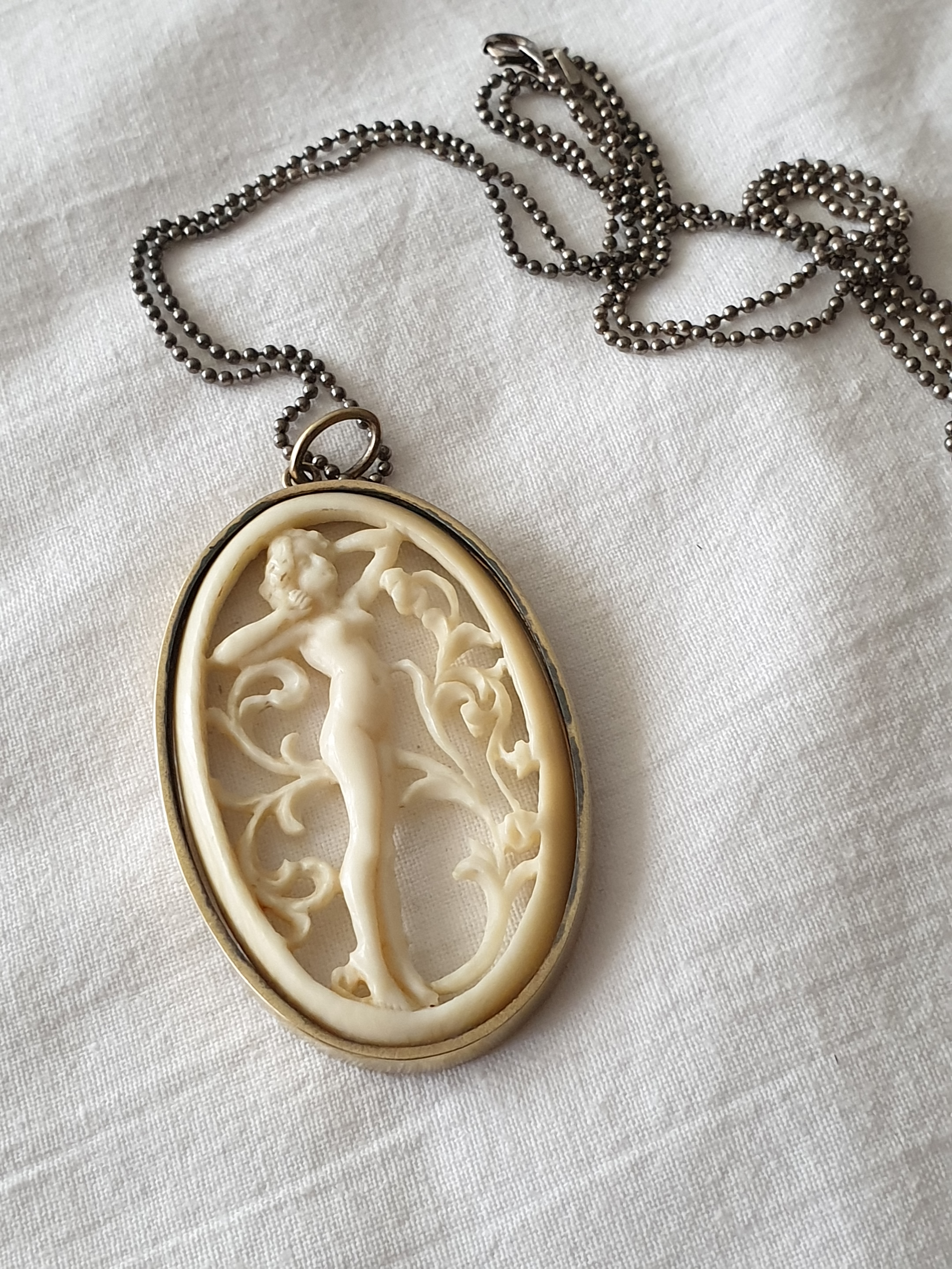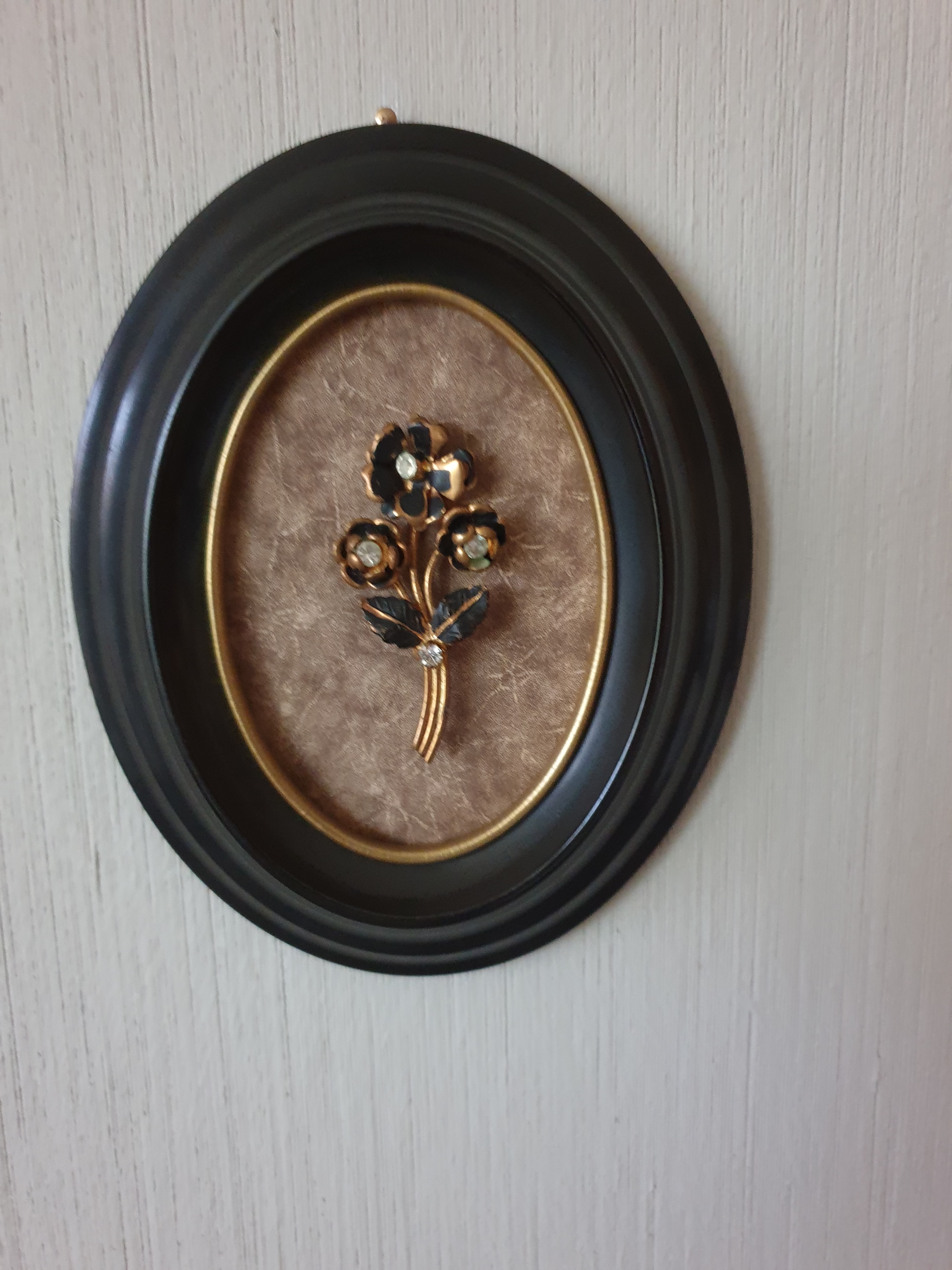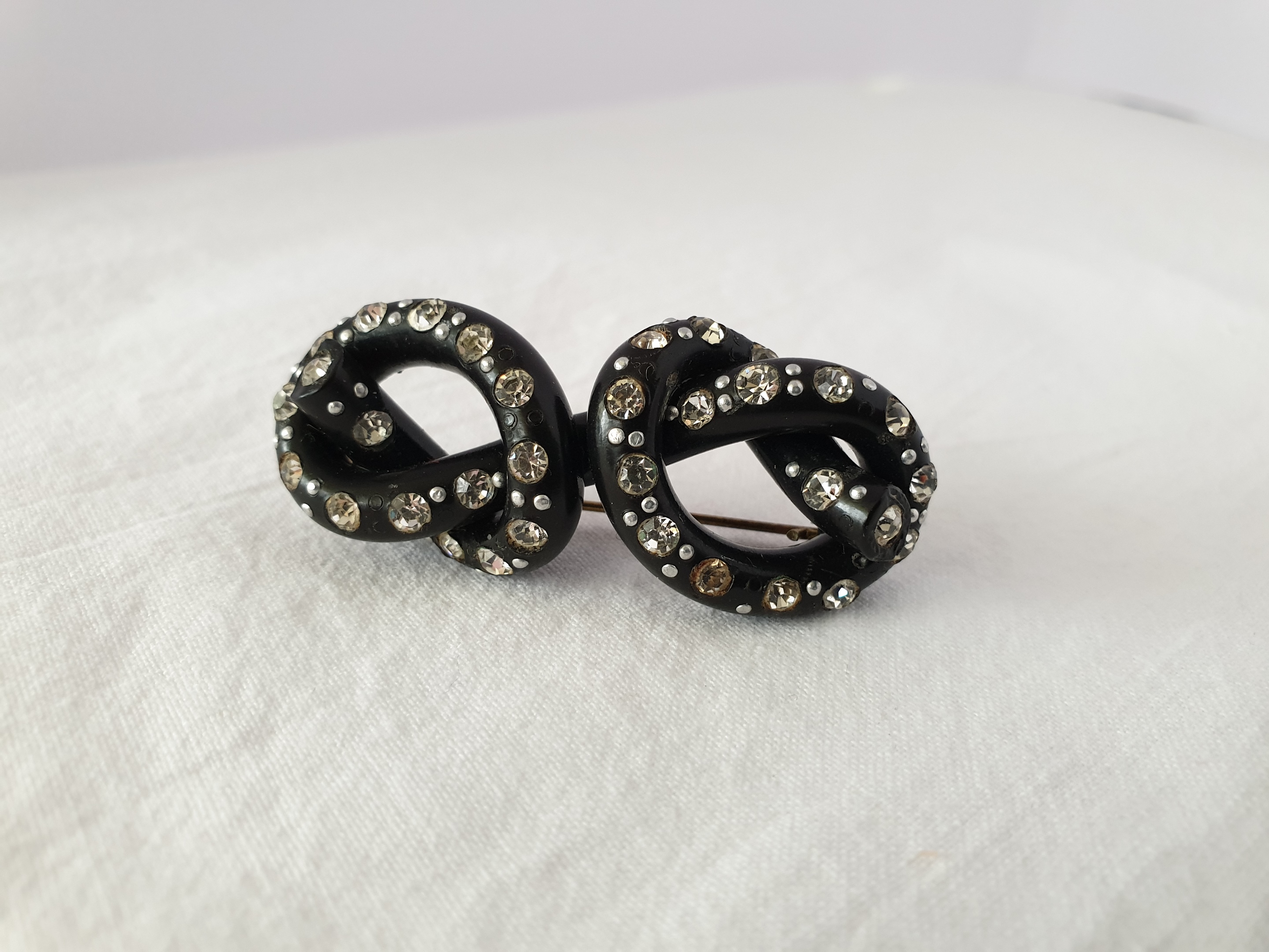 Tre underbara broscher, var och en på sitt sätt. En kanin i celluloid som är ute och åker skidor från 50-talet, möjligen 40-tal, en brosch i form av en fyrklöver som jag är lite osäker på men troligen i celluloid och från 40-talet. Så längst till höger en härlig brosch i celluloid från 40-talet, tyvärr är bilden lite mörk så det syns inte riktigt vilket djup den har.