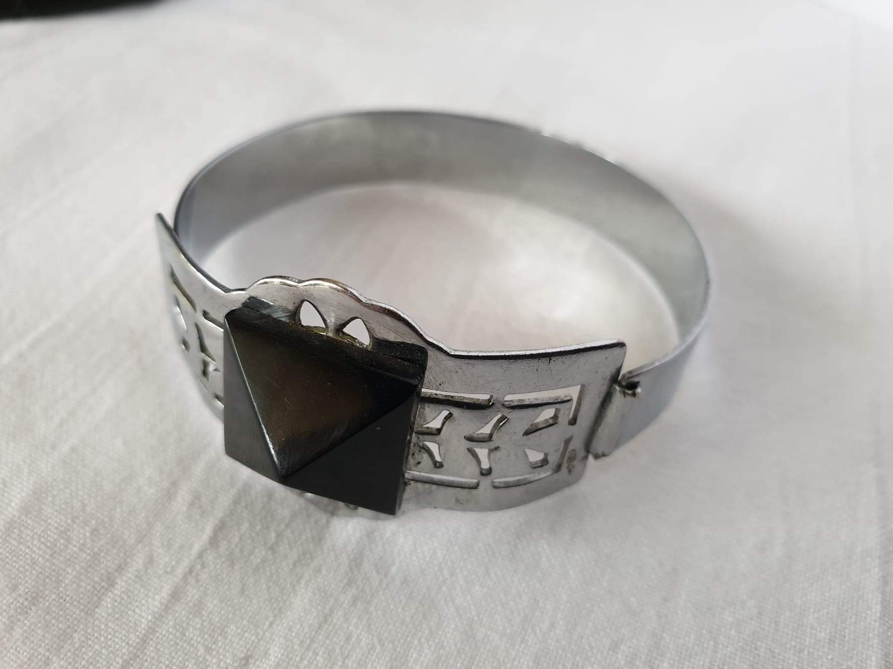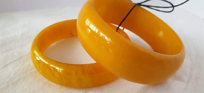 Två stela armband i bakelit från 30-talet på bilden ovan.
