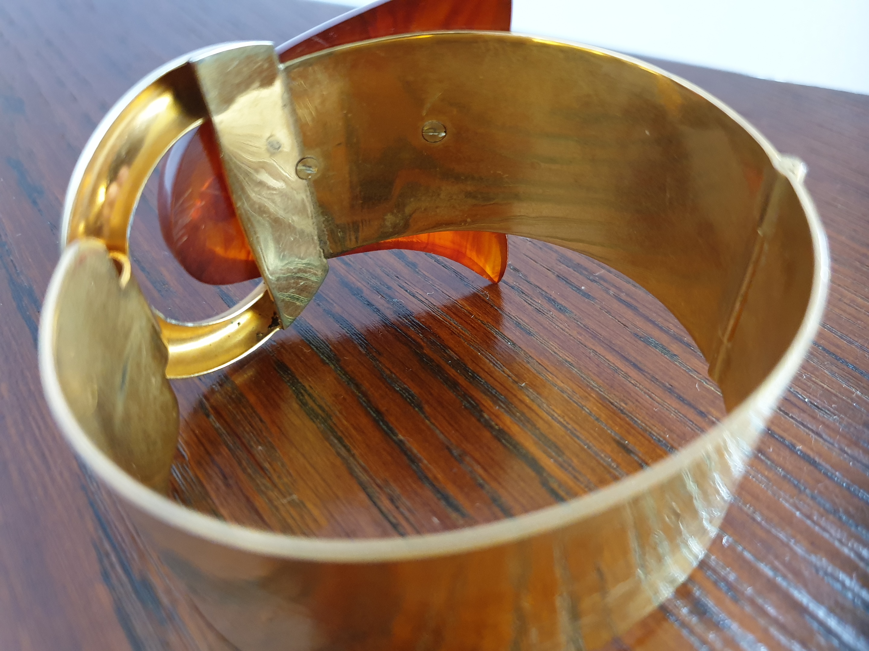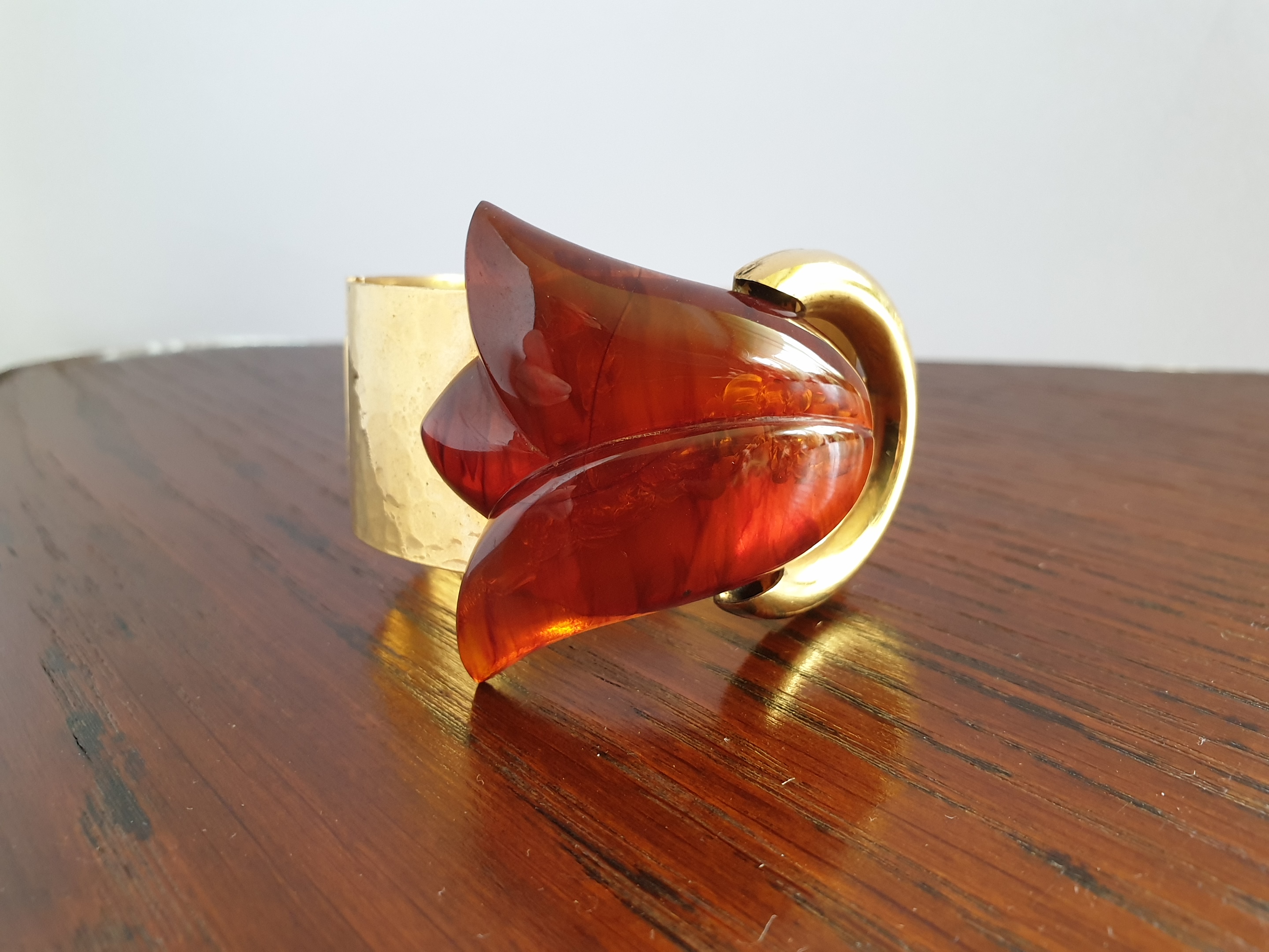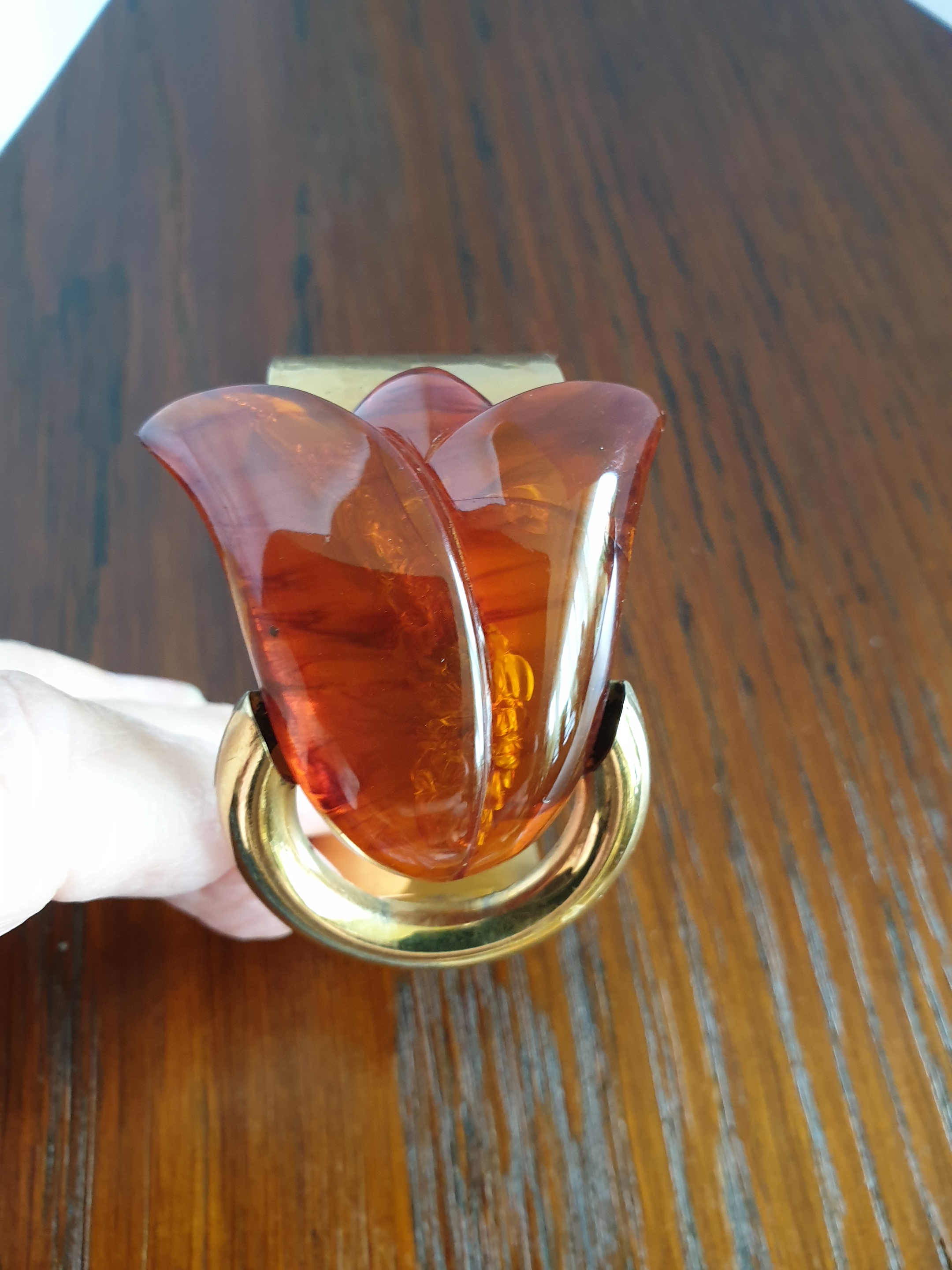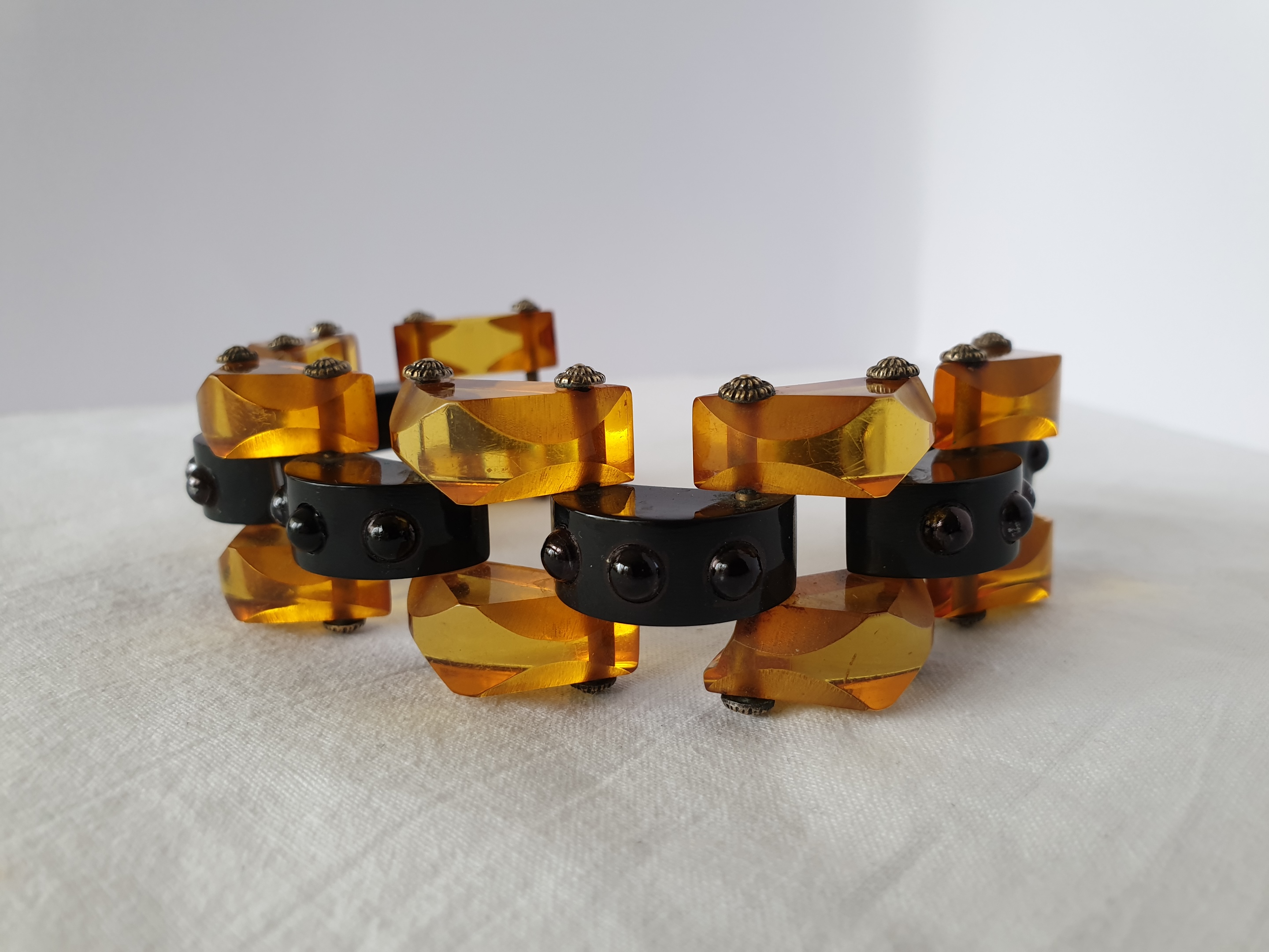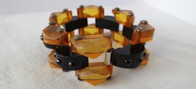 Ytterligare ett sånt där smycke som ser betydligt nyare ut än vad det är. Det här coola armbandet förälskade jag mig i, säljaren skrev 60-tal och jag trodde kanske att det kunde varadet men till min glädje visade det sig att det var betydligt äldre. Det första jag upptäckte var att ”tulpanen” var ditsatt med skruvar, brukar vara ett säkert tecken på art deco/30-tal, och då var jag så klart tvungen att testa för bakelit också och det var det! Det stora problemet är bara att säljaren visserligen slagit in det i bubbelplast och skickat i en bubbelplast-påse men det hade behövt en kartong – blivit en spricka rakt över ett blad… Sitter fast (i alla fall ännu så länge) men ändå synd på ett vackert väldigt gammalt smycke. Jag önskar att folk kunde lära sig stt äldre plast är skör och behöver skyddas från tryck och stötar, suck.