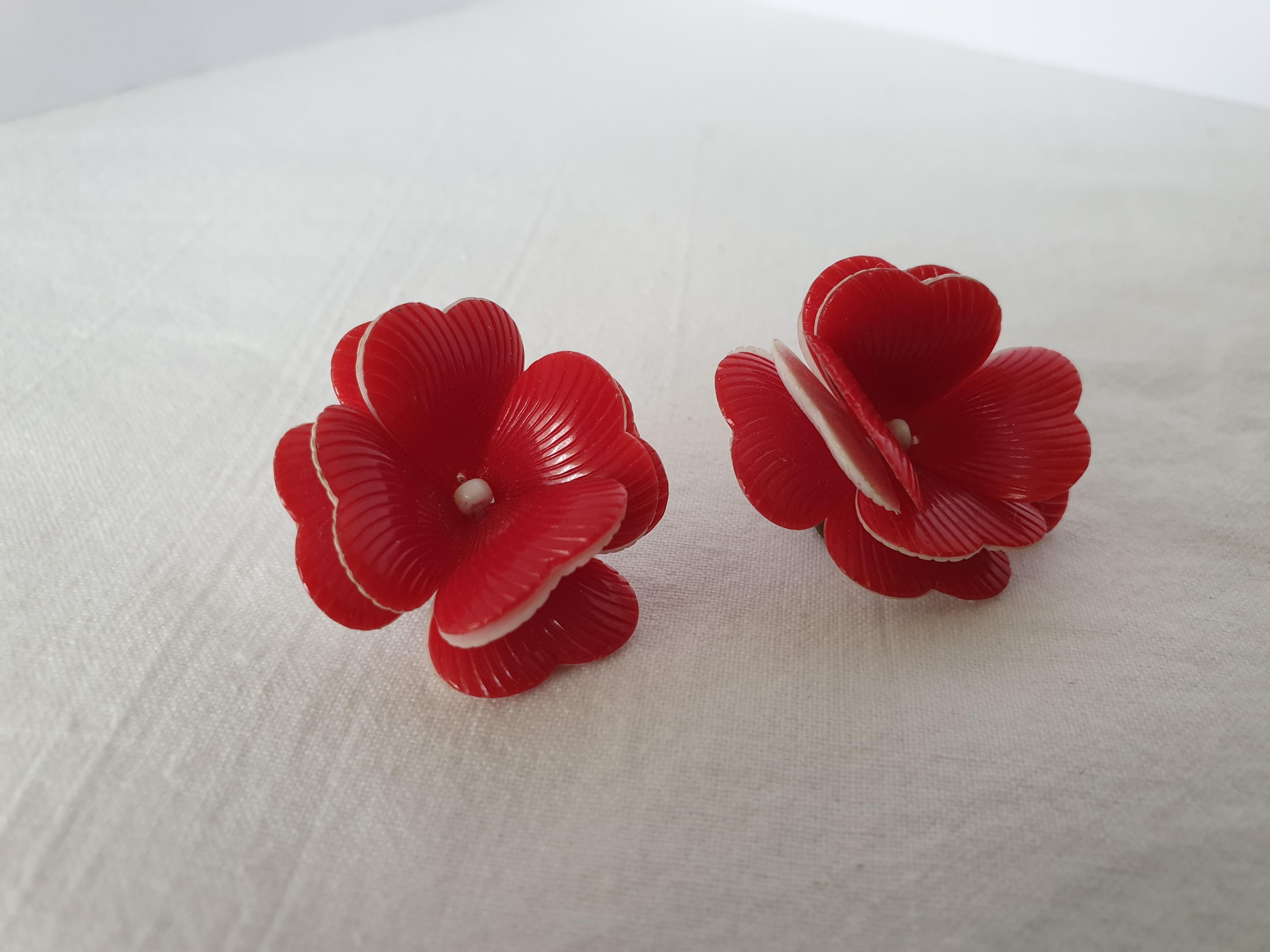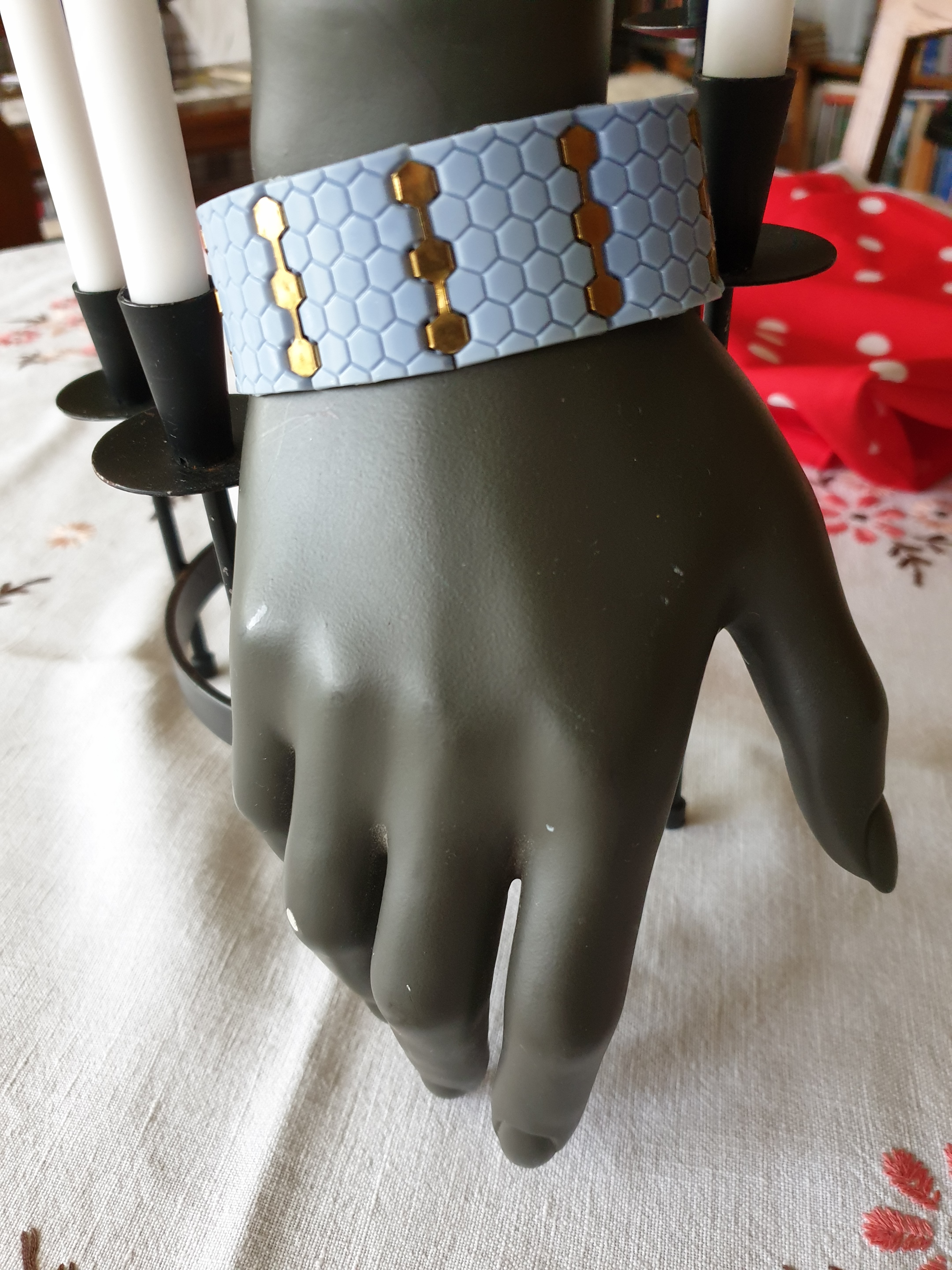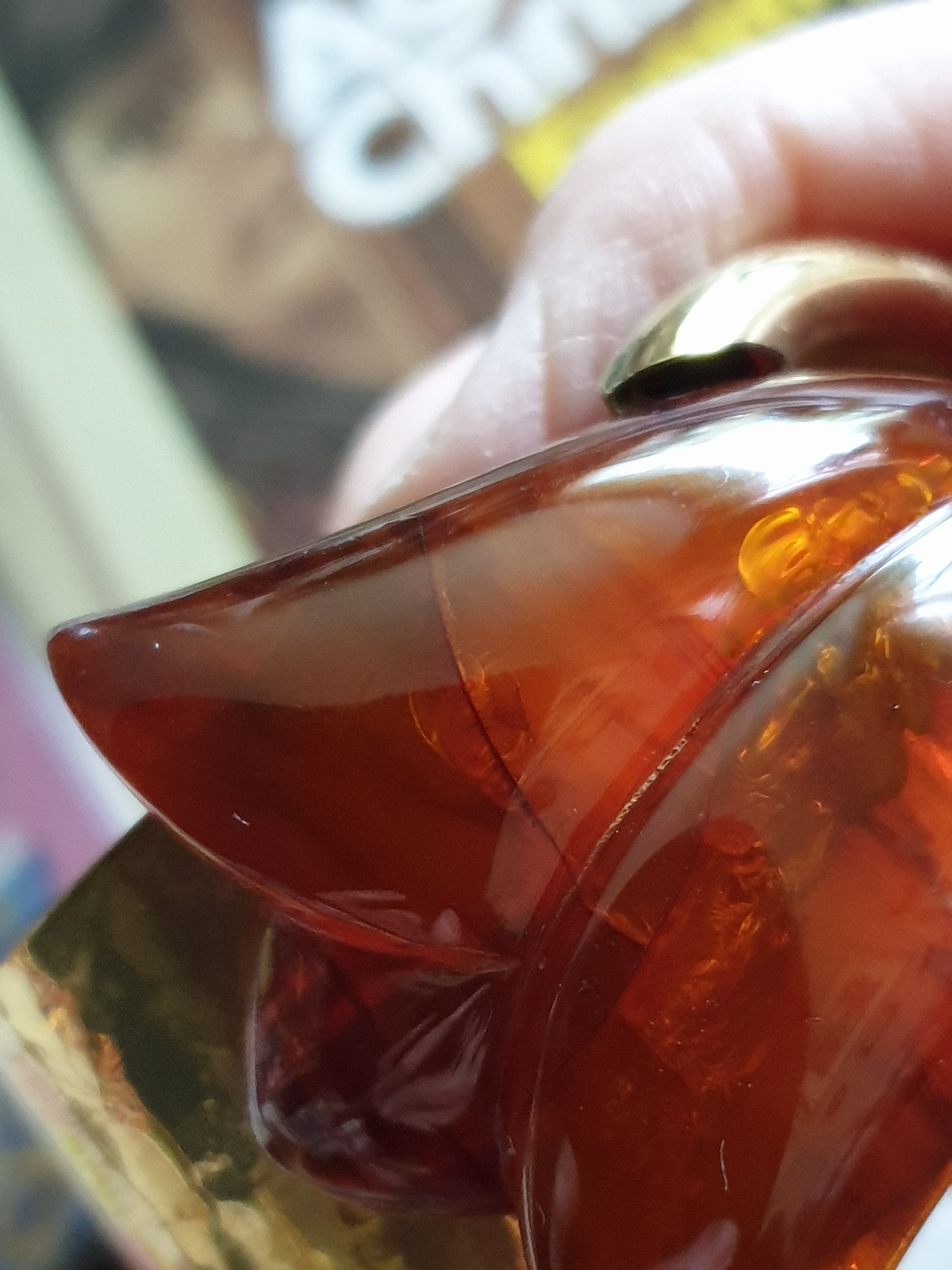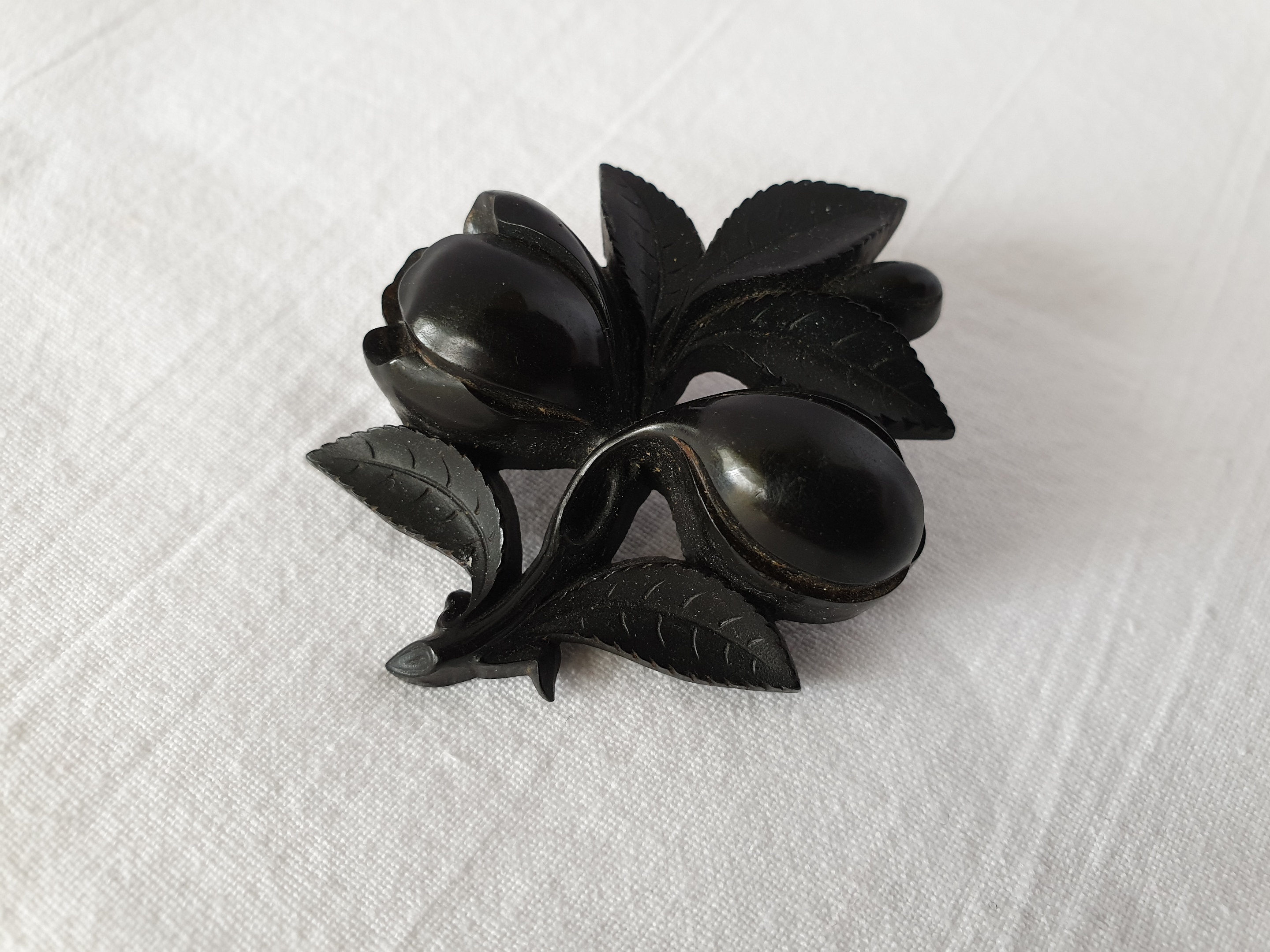 Ytterligare ett sånt där smycke som ser betydligt nyare ut än vad det är. Det här coola armbandet förälskade jag mig i, säljaren skrev 60-tal och jag trodde kanske att det kunde varadet men till min glädje visade det sig att det var betydligt äldre. Det första jag upptäckte var att ”tulpanen” var ditsatt med skruvar, brukar vara ett säkert tecken på art deco/30-tal, och då var jag så klart tvungen att testa för bakelit också och det var det! Det stora problemet är bara att säljaren visserligen slagit in det i bubbelplast och skickat i en bubbelplast-påse men det hade behövt en kartong – blivit en spricka rakt över ett blad… Sitter fast (i alla fall ännu så länge) men ändå synd på ett vackert väldigt gammalt smycke. Jag önskar att folk kunde lära sig stt äldre plast är skör och behöver skyddas från tryck och stötar, suck.