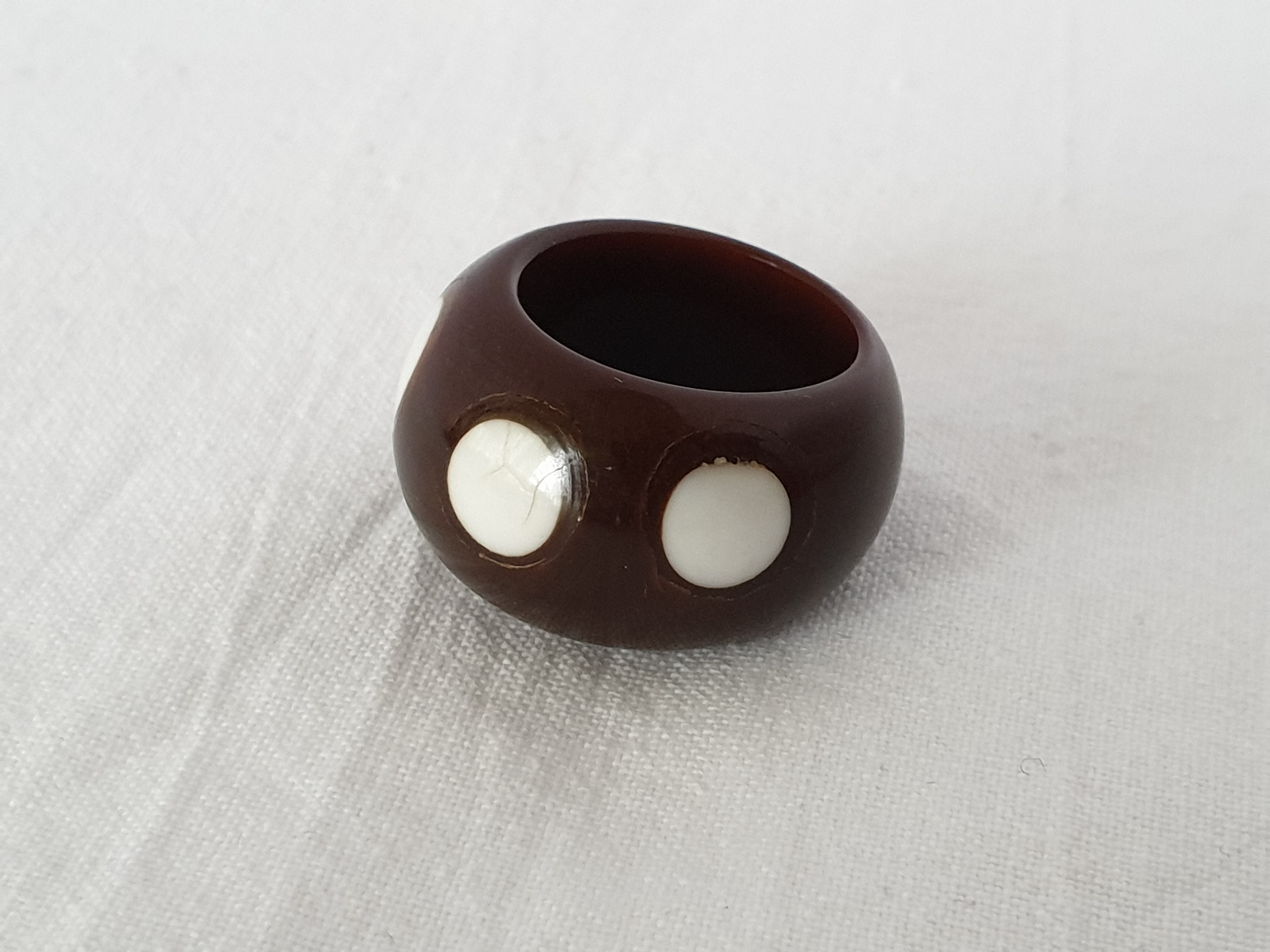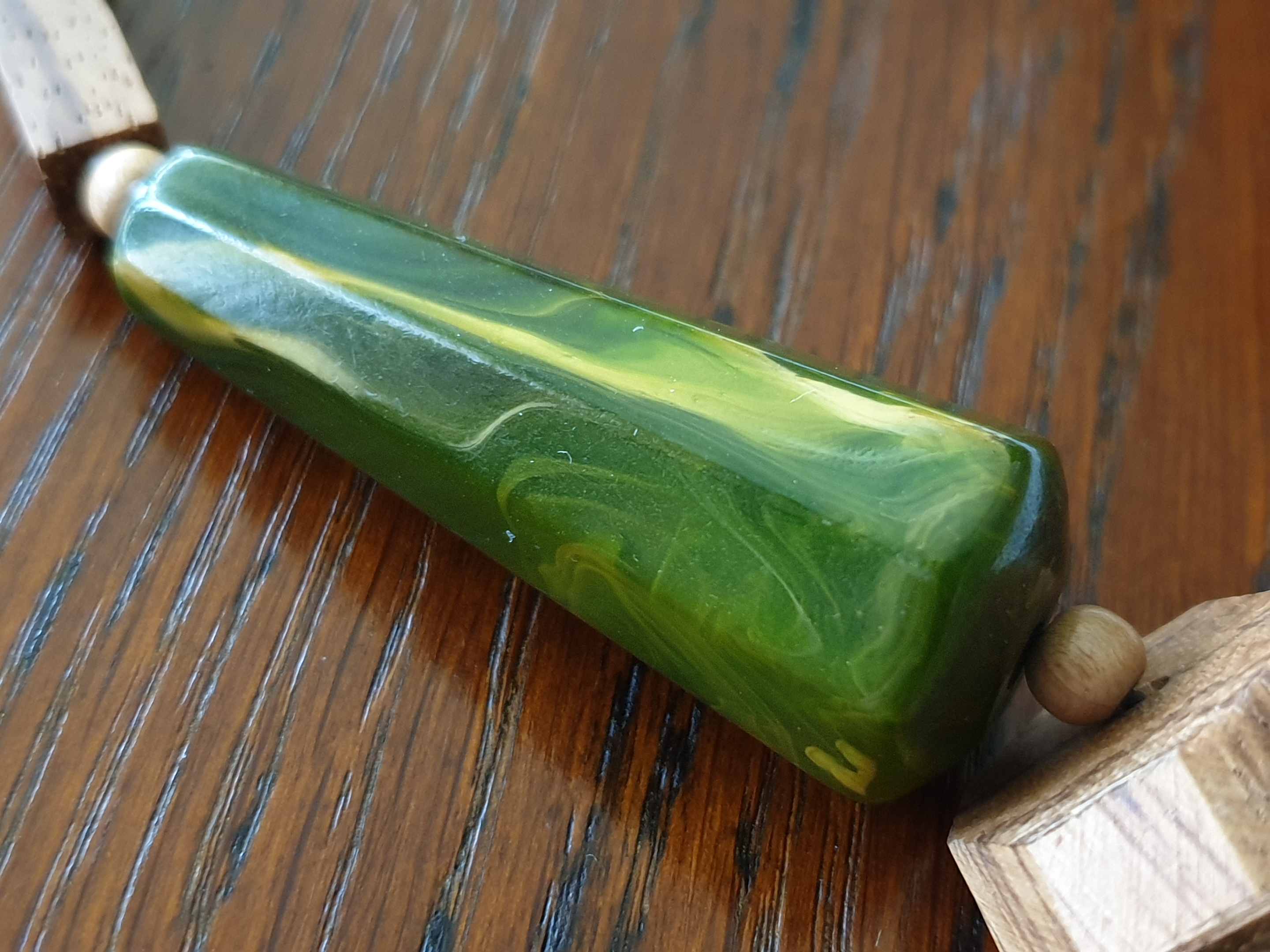 Ett annat smycke jag tyckte jag villhövde var ett häftigt, dock väldigt kort (”tyvärr” är det skruvlås så det är väldigt svårt att förlänga utan att trä om det), halsband i trä och bakelit. Ja, jag visste ju inte säkert att det var bakelit men jag gissade mig till det. Hade inte varit hela världen om det inte varit det, ni som brukar läsa vet ju att jag inte anser att bakelit är det enda saliggörande, utan det handlar oftast om hur högt jag kan tänka mig gå i pris. Återigen ett sånt där smycke som ser helt modernt ut men som troligen har sisådär 80- 90 år på nacken.