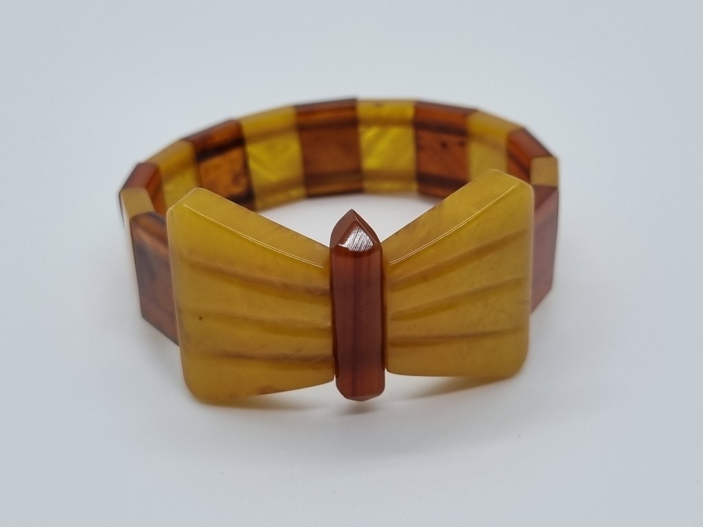 Bakelit. Bakeliten kom 1907 men började inte användas i smycken förrän i slutet på 1920-talet och hade sin storhetstid under 30-talet och en bit in på 40-talet. Parallellt fanns celluloiden och i slutet på 30-talet kom lucite så bakelit var aldrig så stort på smyckesmarknaden som många tycks tro.