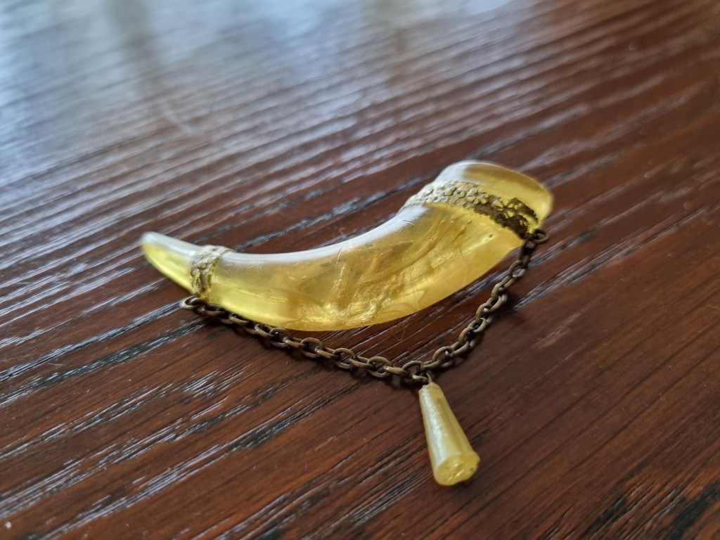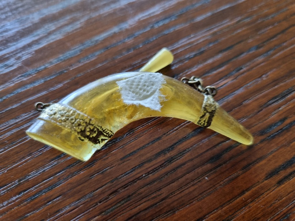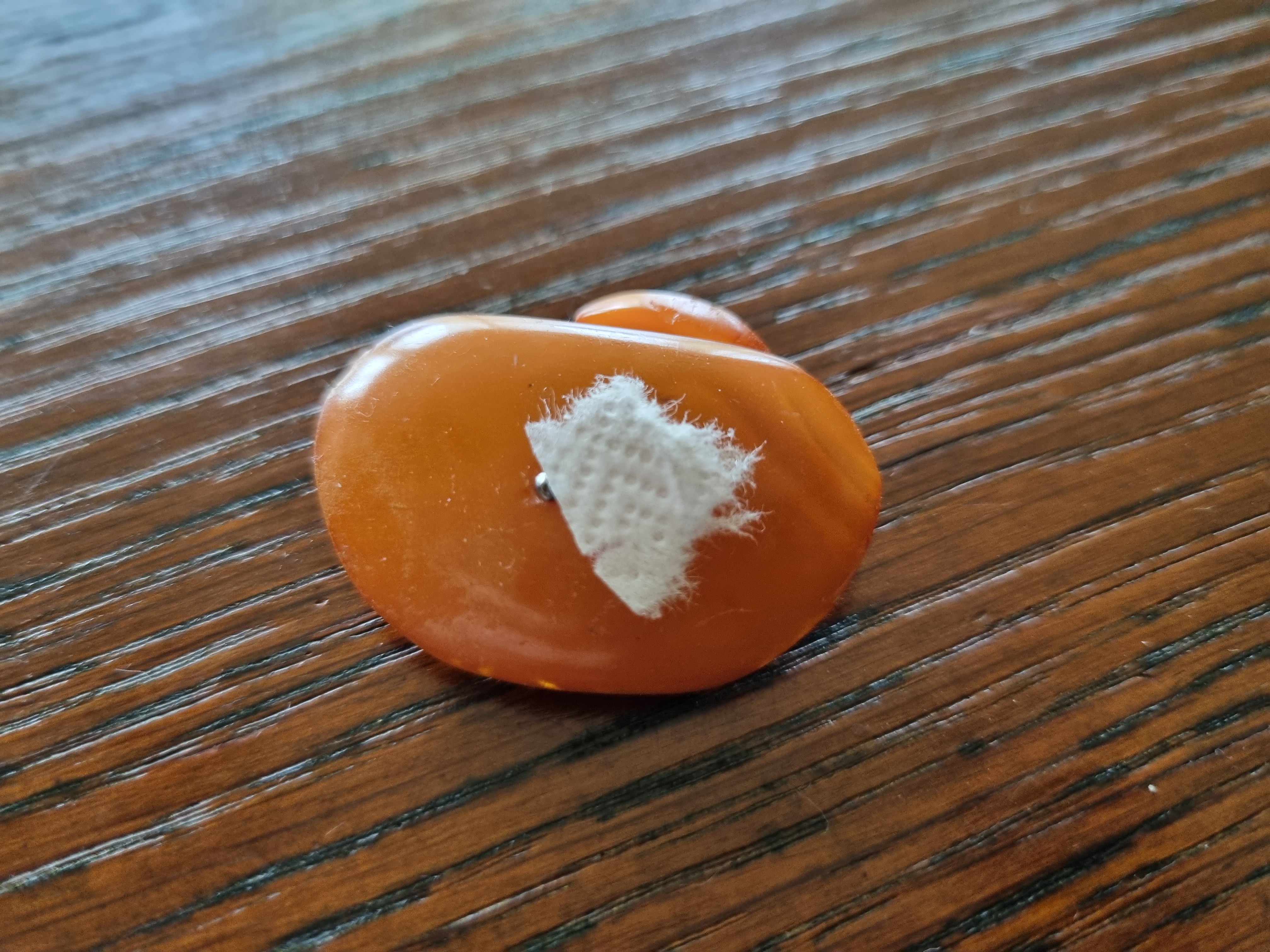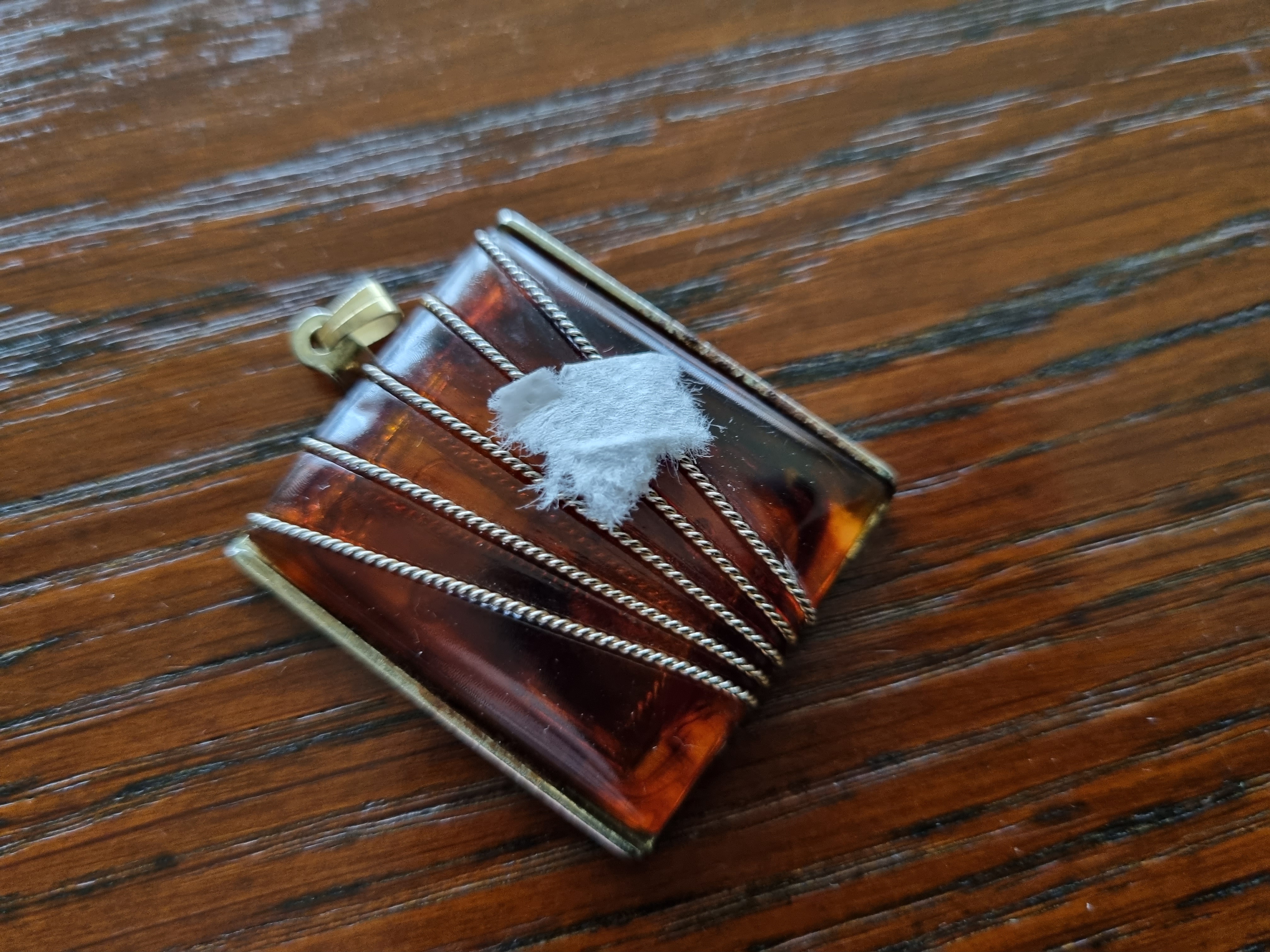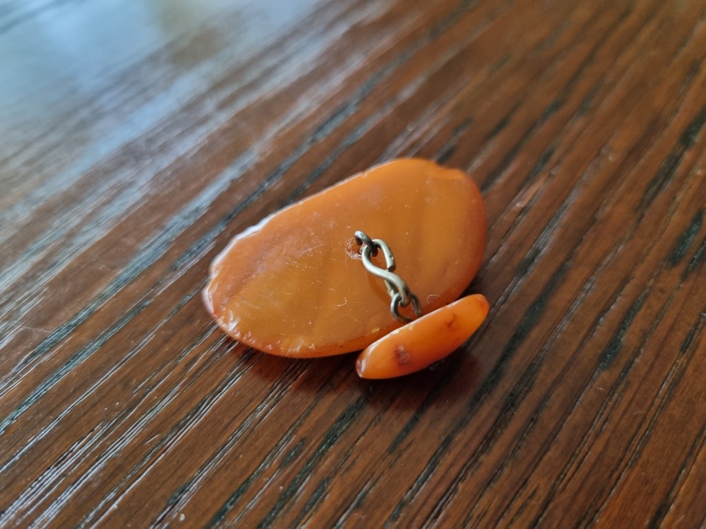 Sedan har jag en brosch och ett set med brosch och örhängen som jag misstänker kan vara bärnsten. Samma manöver här;